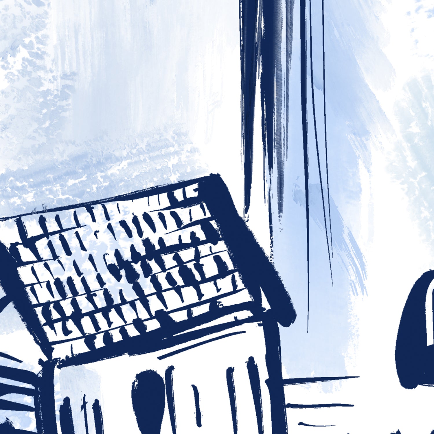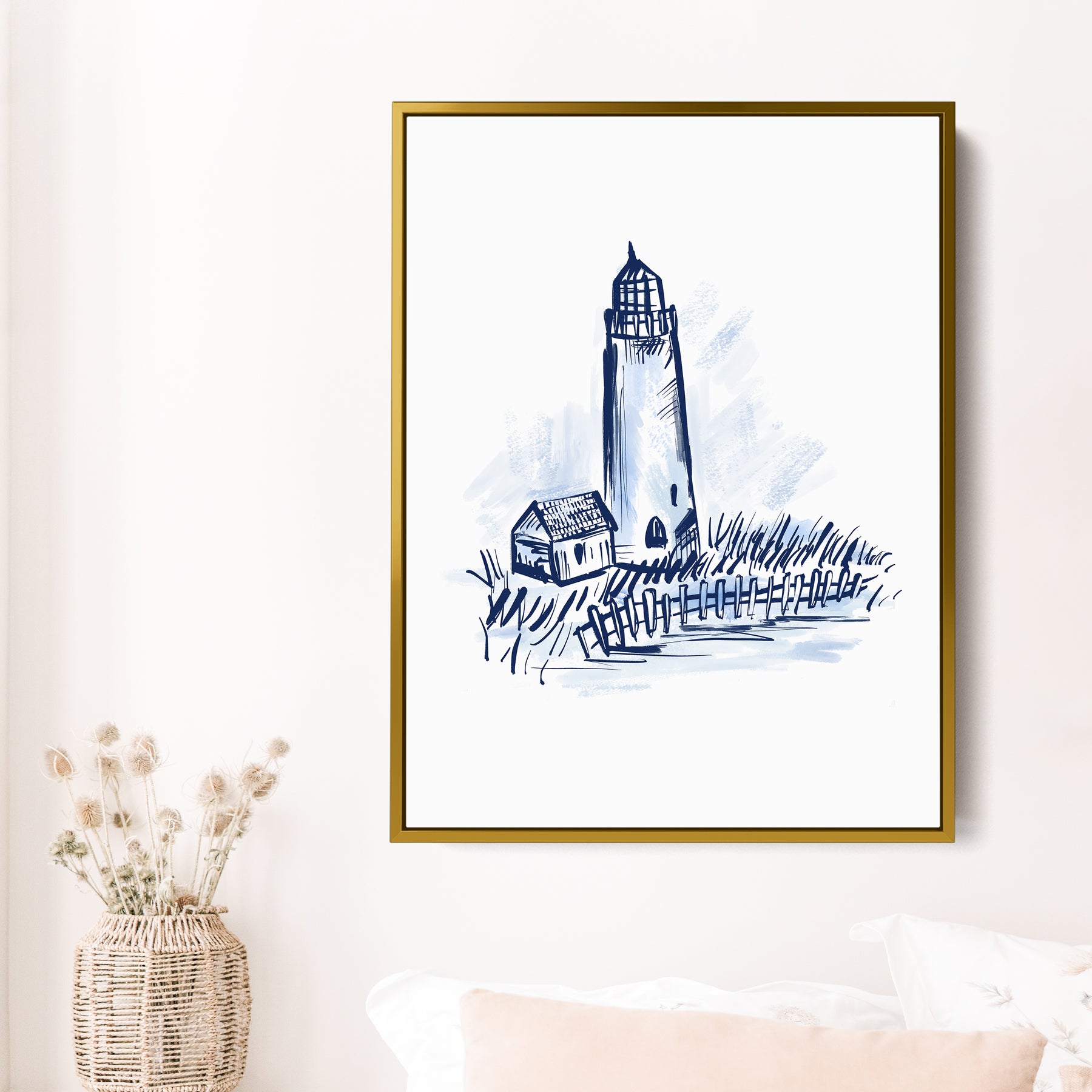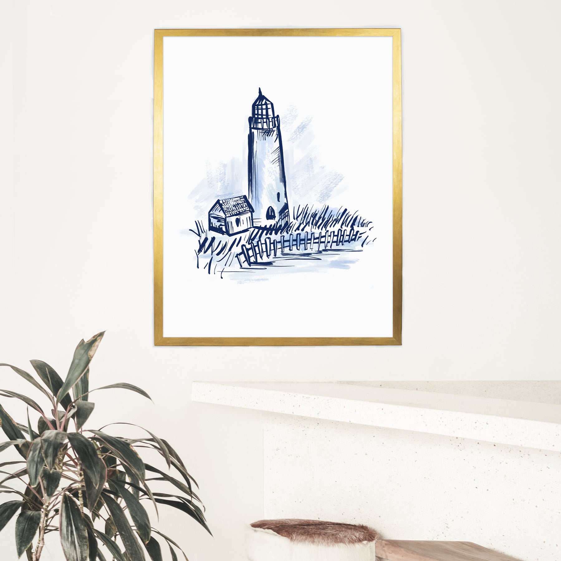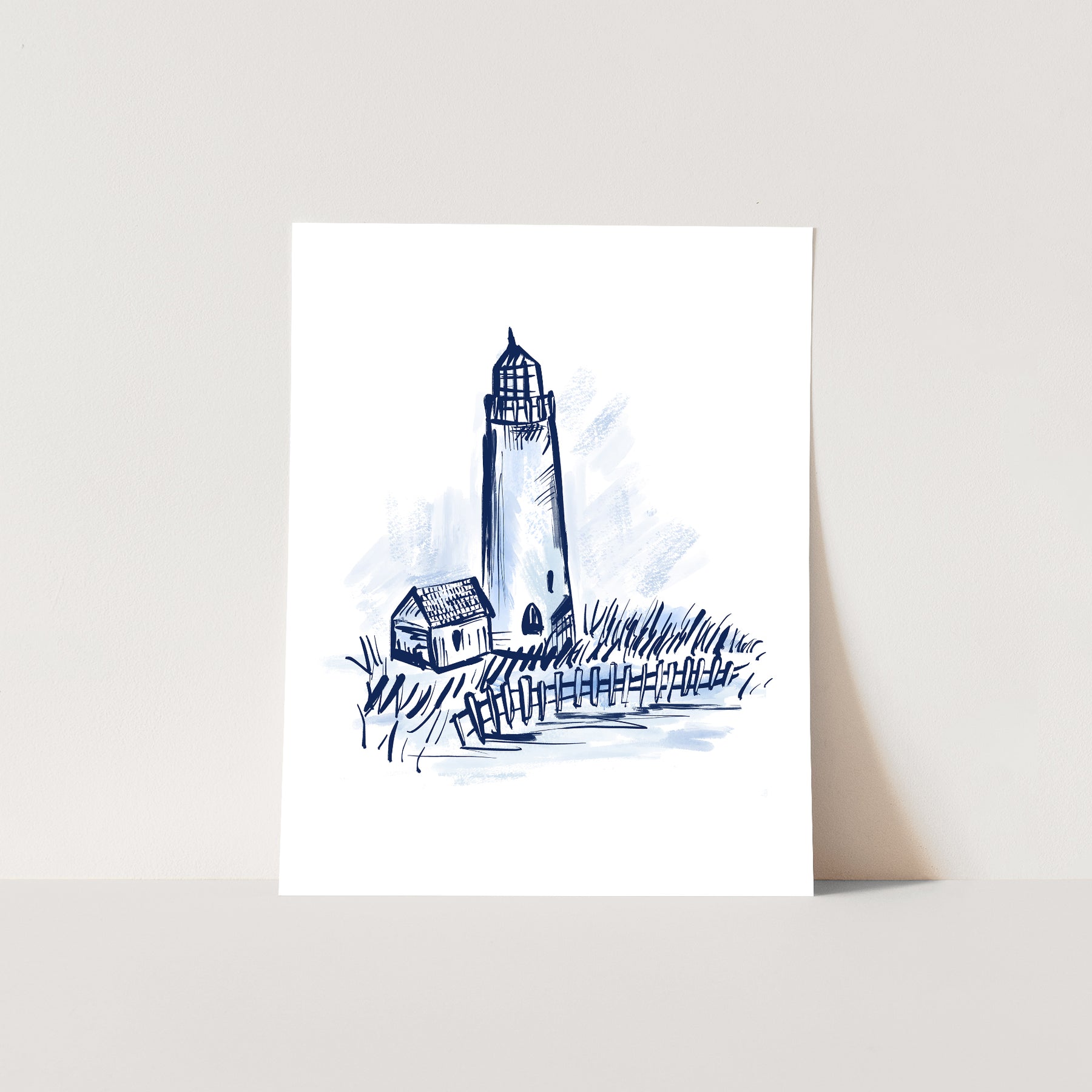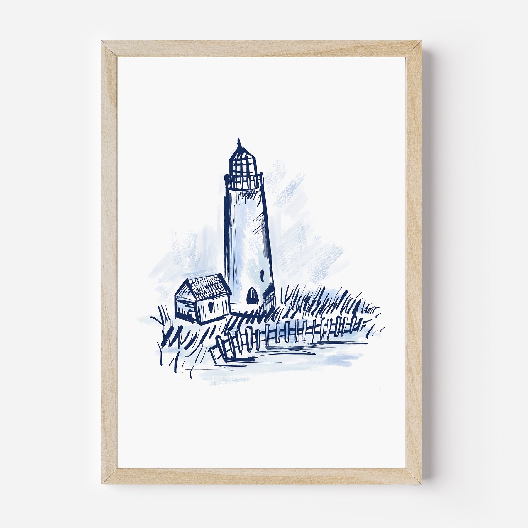 "The Coast Keeper" is portrait/vertically oriented nautically inspired coastal landscape illustration in tones of blue on a white background.