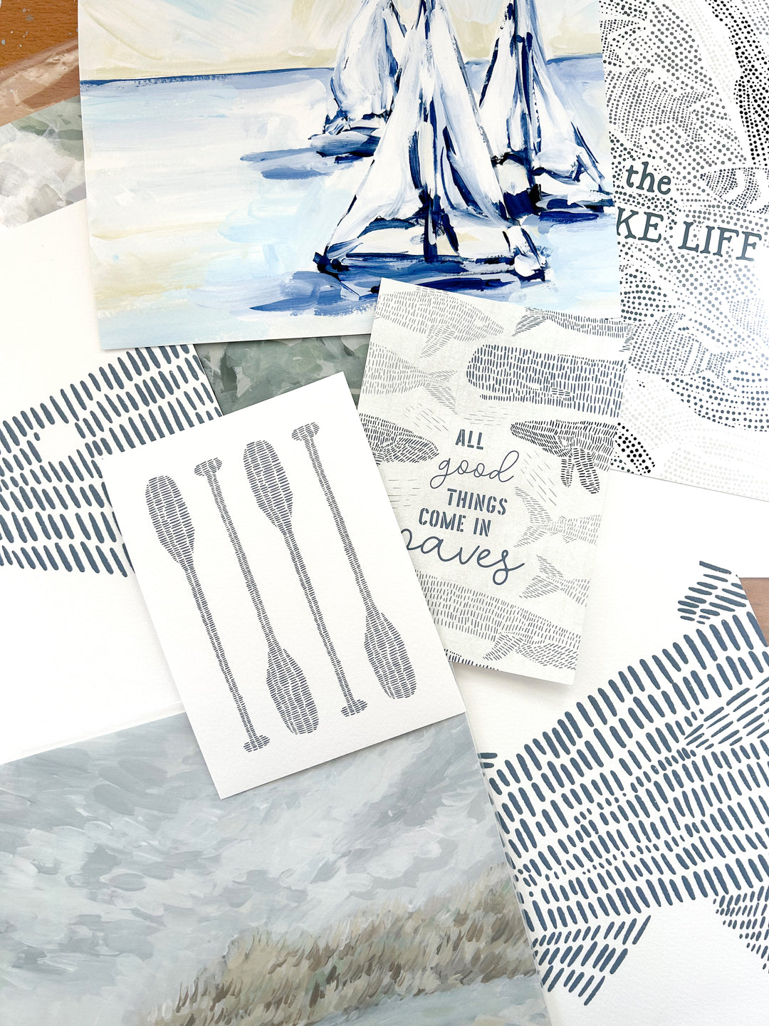 The beginning to a new collection always starts with color palette selection. I like to pull together colors that resonate with me and feel like they properly represent the overall sentiment of that locale from my perspective. From there, I create imagery that represents the chosen location – through relaxing landscapes, impressionist inspired abstract paintings, modern illustrations and patterns using dots, lines and other illustrative markings. These are inspired by patterns found in the natural world or something that I am reminded of from my travels.