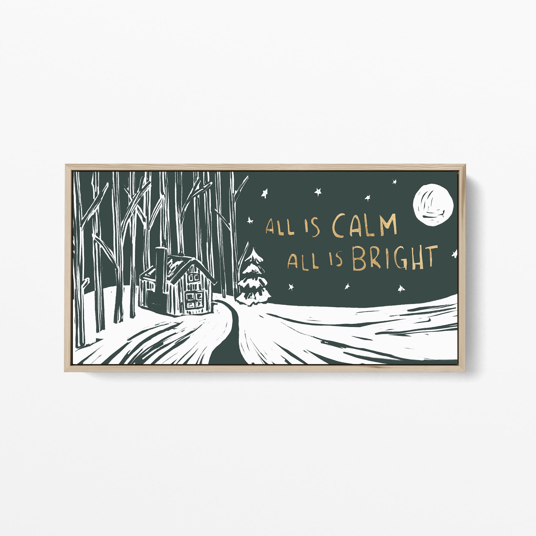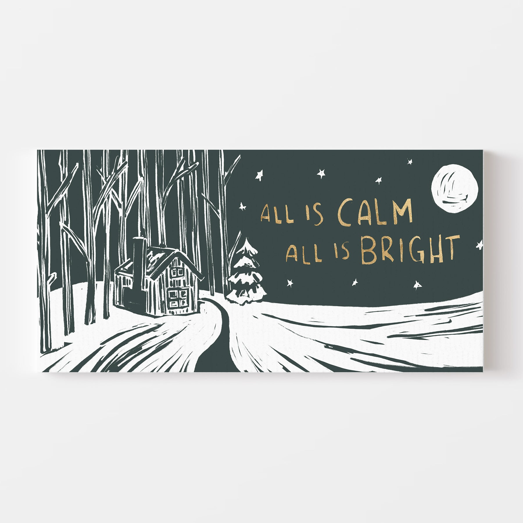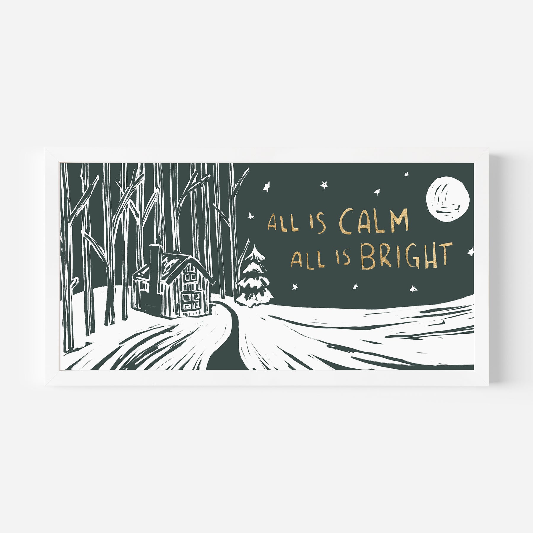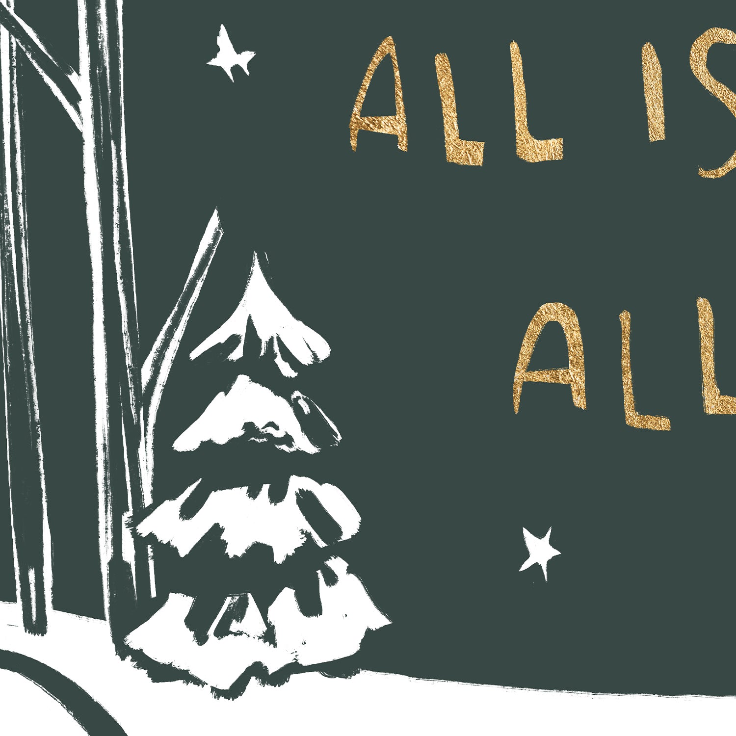 "All is Calm All is Bright Panoramic" is a horizontally/landscape oriented forest holiday scene illustration in tones of deep green, white and faux gold detailing. Please note that the gold effect is a printed texture and not metallic foil or gold leaf.