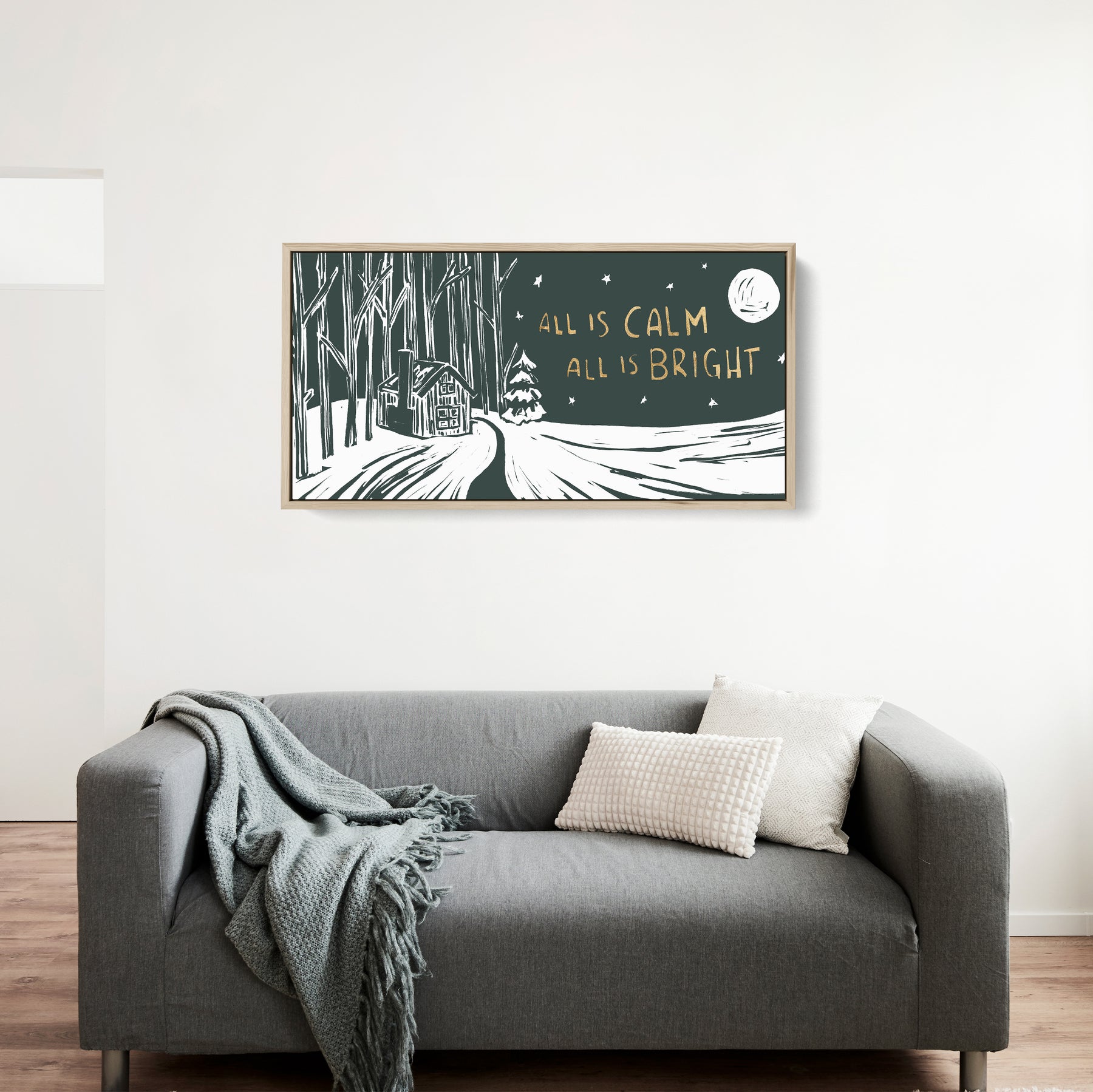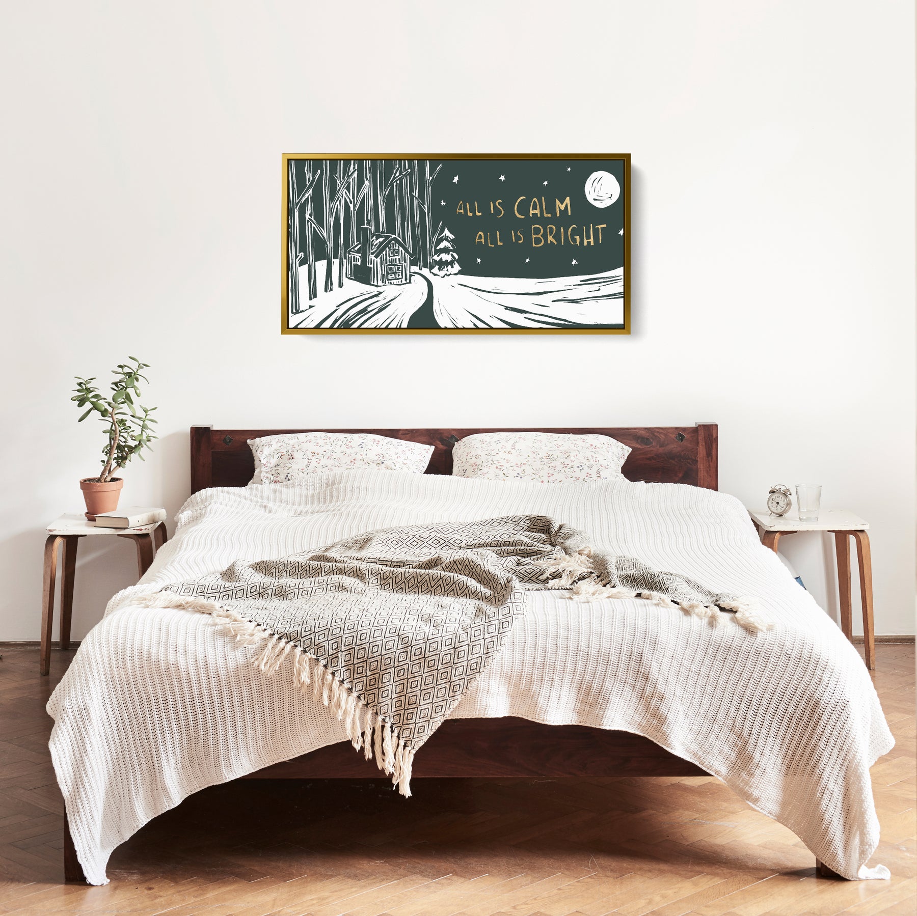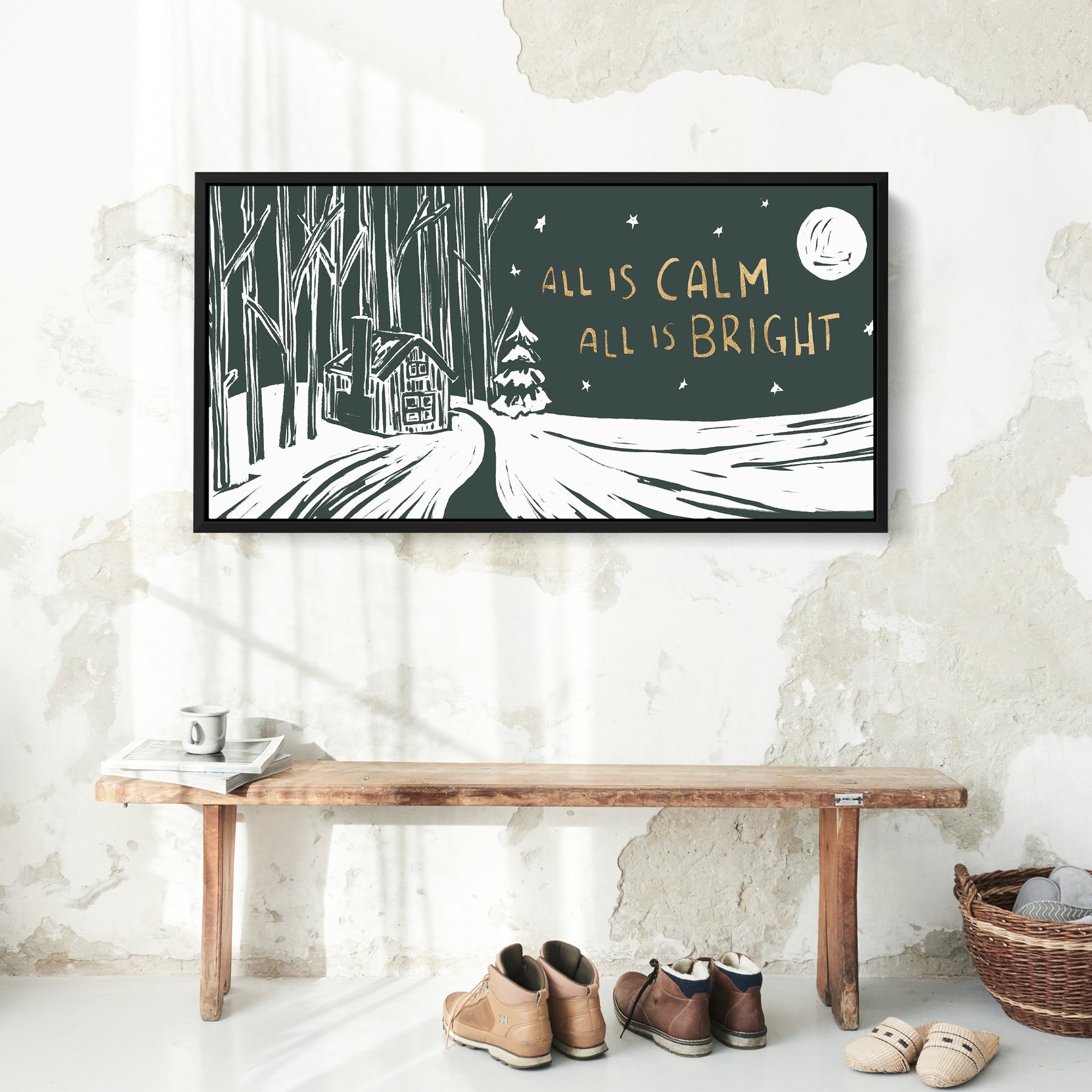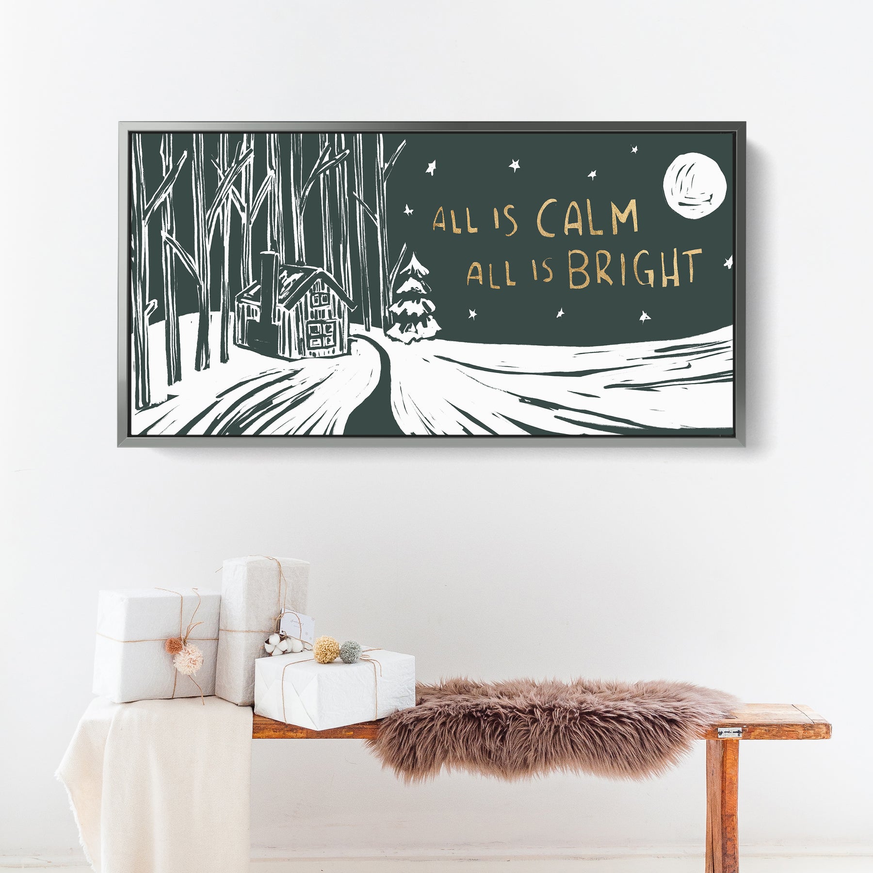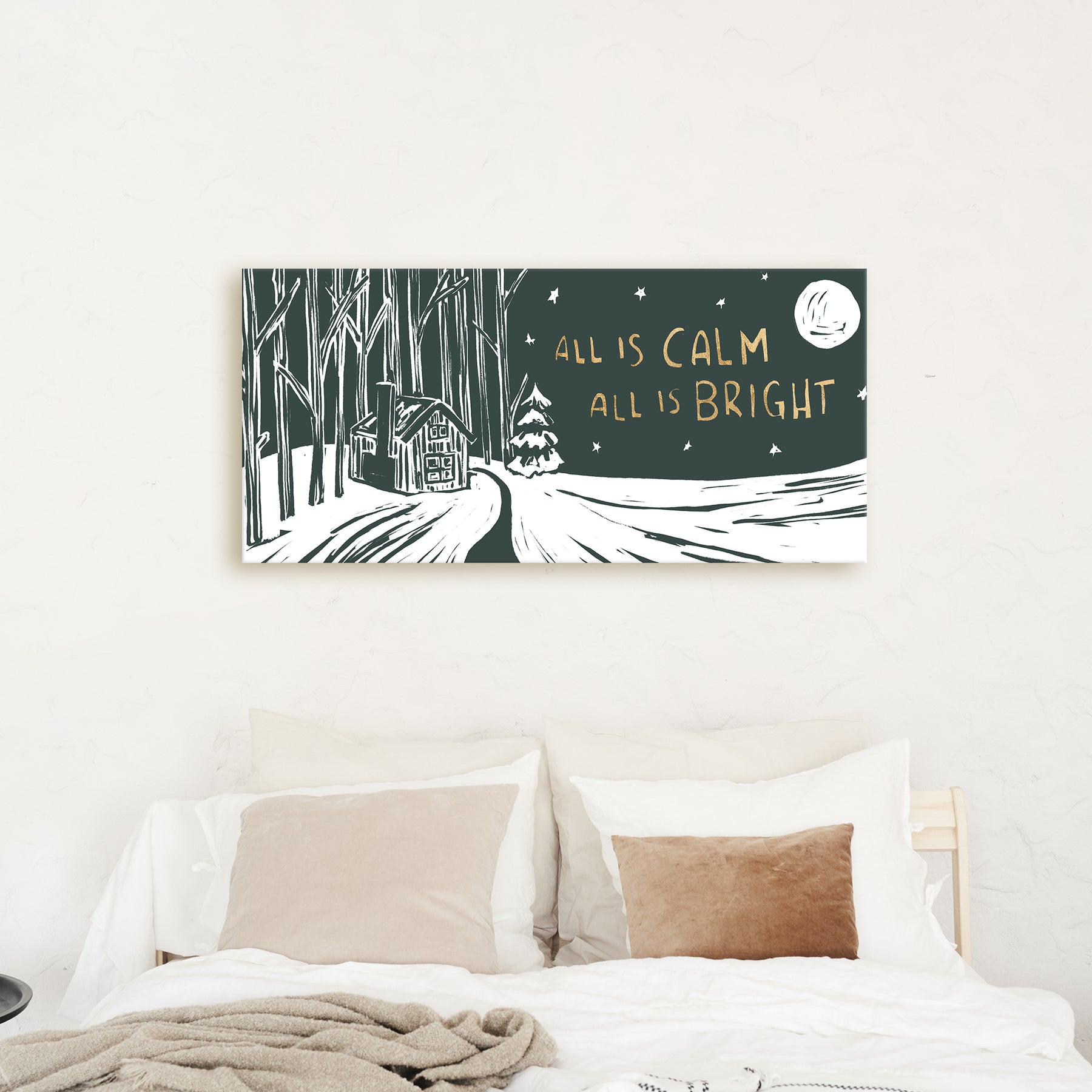 "All is Calm All is Bright Panoramic" is a horizontally/landscape oriented forest holiday scene illustration in tones of deep green, white and faux gold detailing. Please note that the gold effect is a printed texture and not metallic foil or gold leaf.