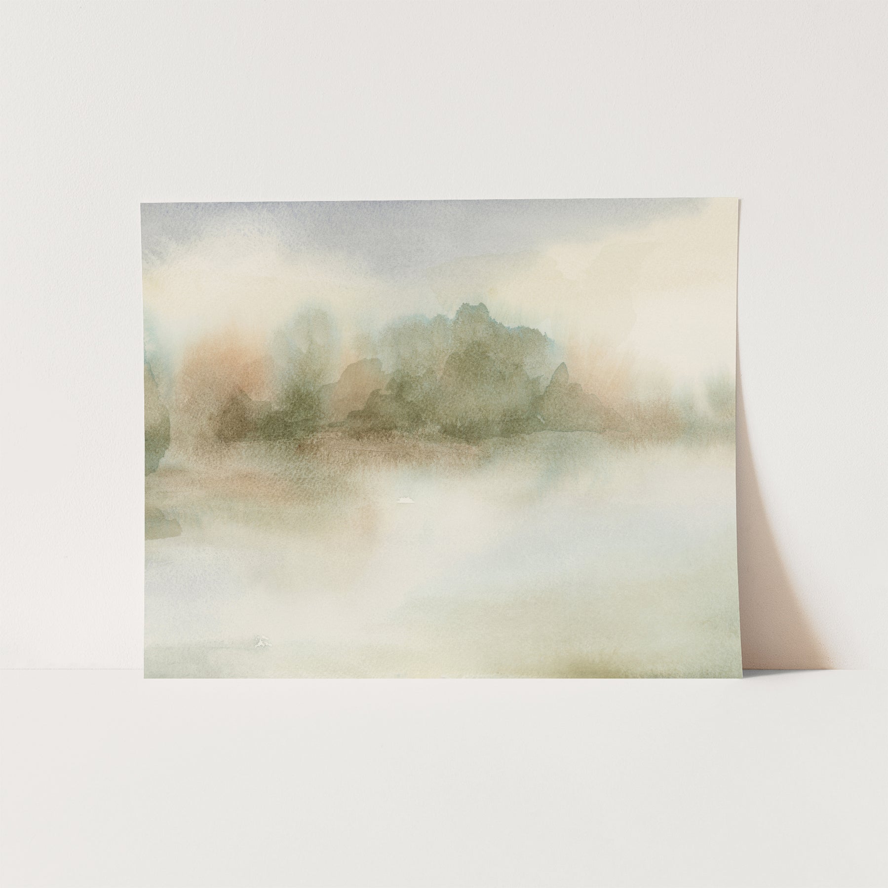"Alpine Mist" is a horizontally oriented abstract lake landscape watercolor painting in light washes of earthy greens, burnt sienna, muted gray and beige.