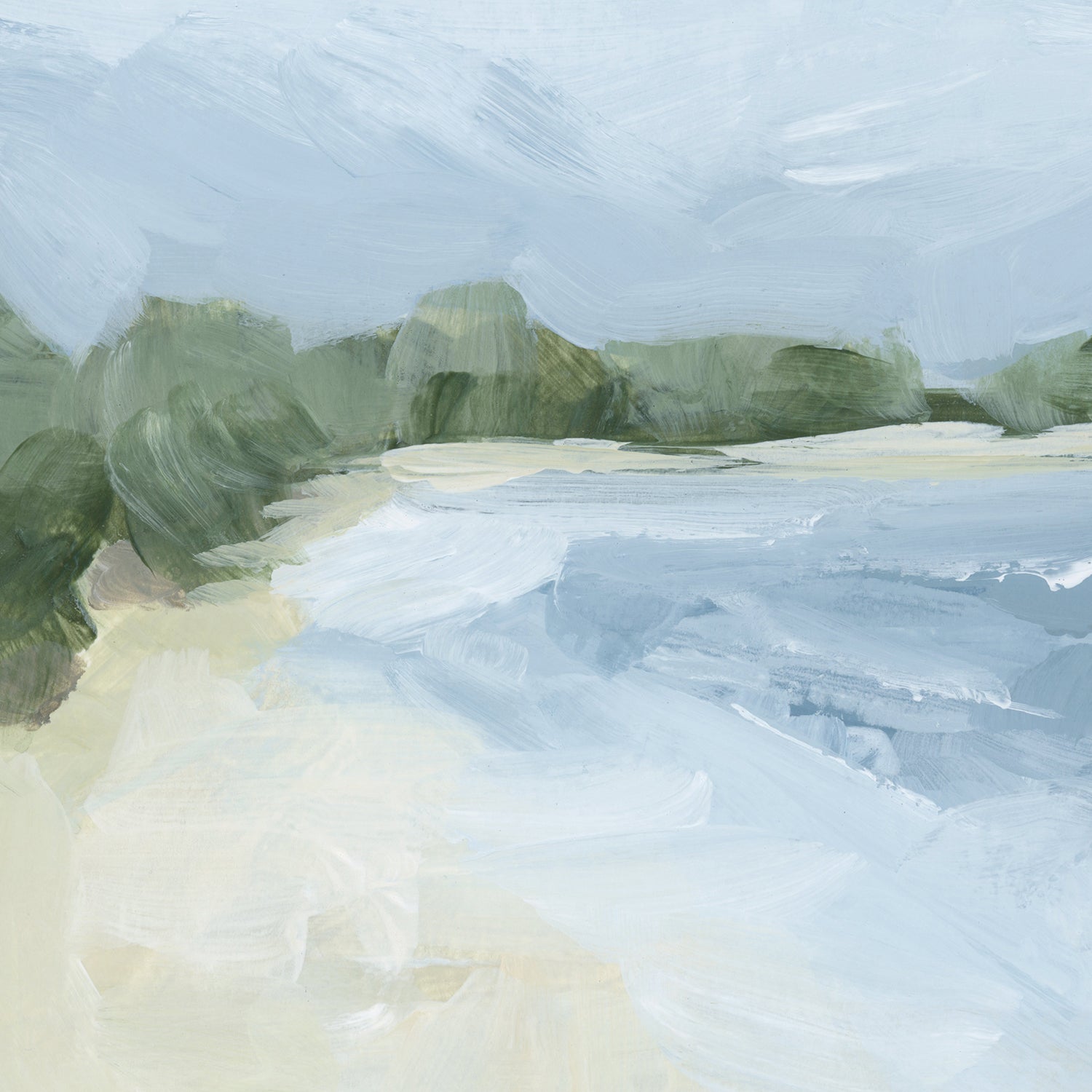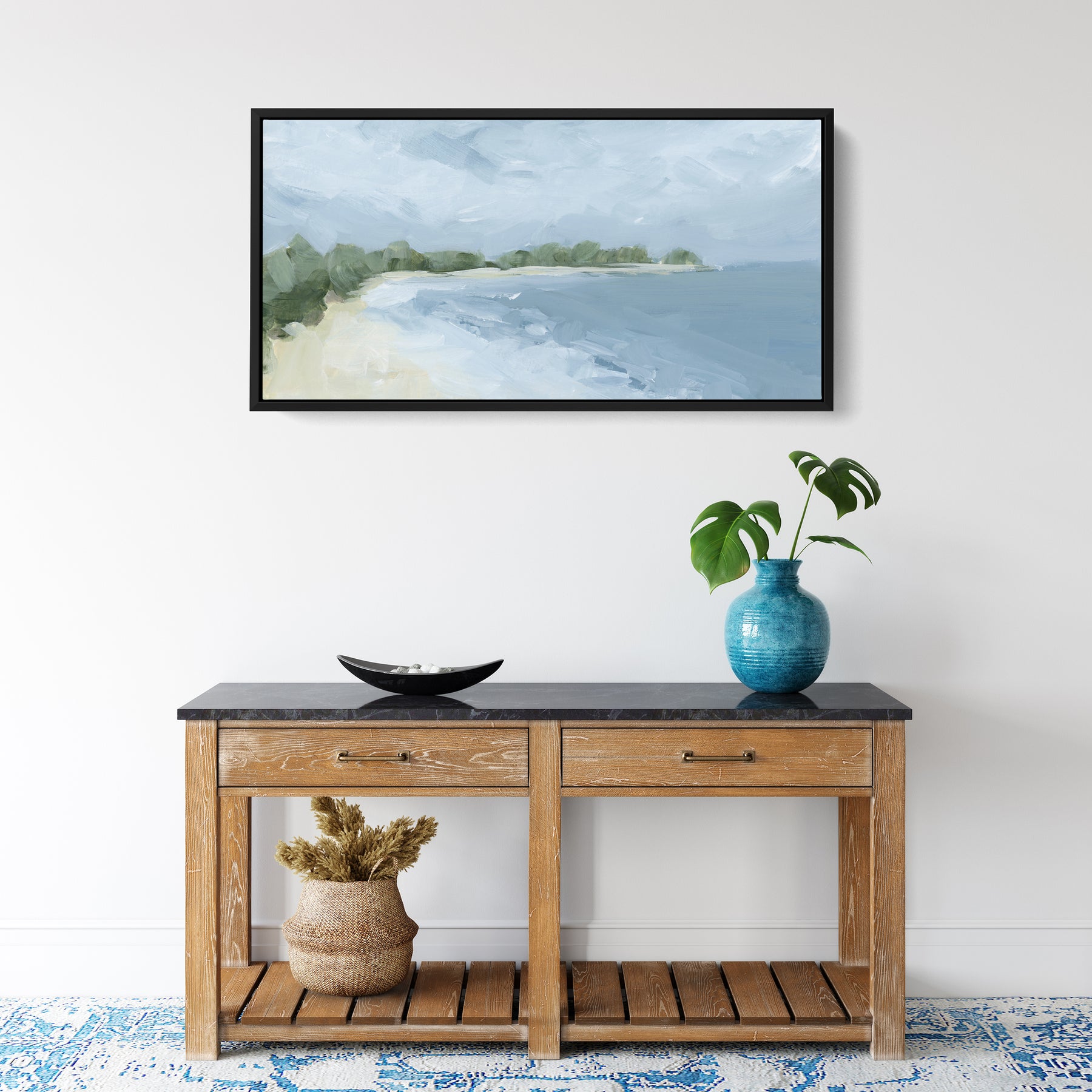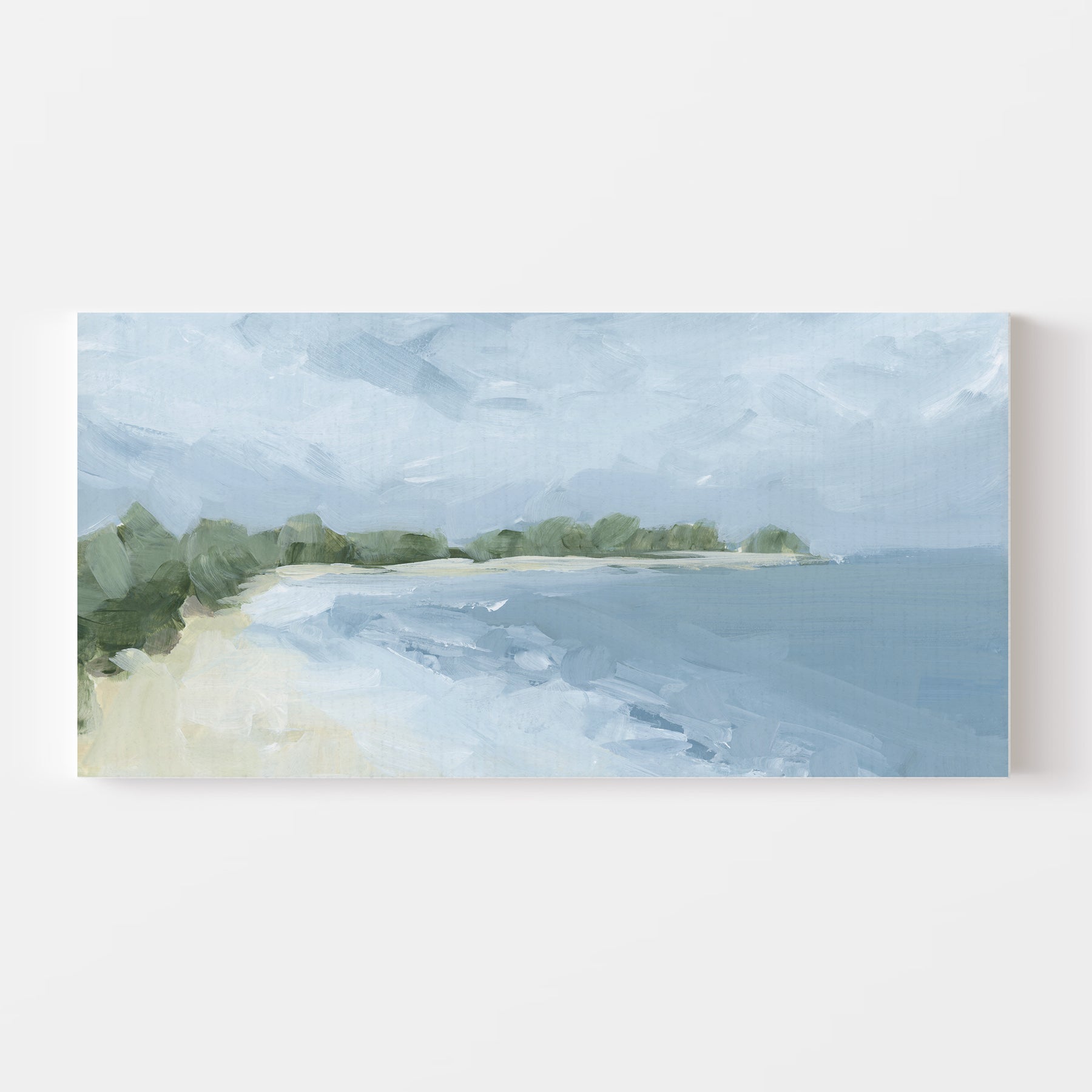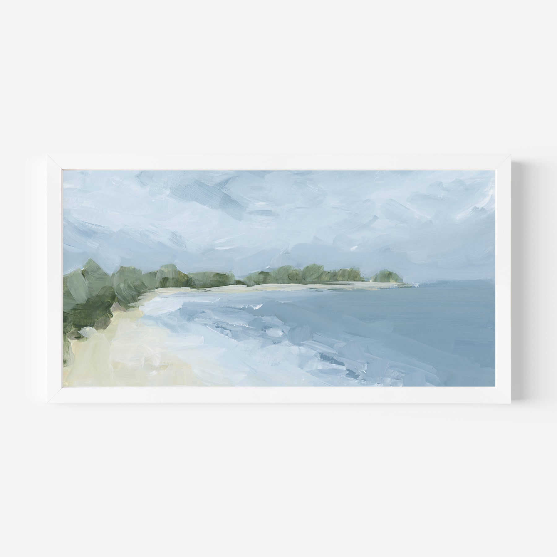 "Beyond the Cove" is a horizontal panoramic painting in tones of blue, white, beige and muted green.