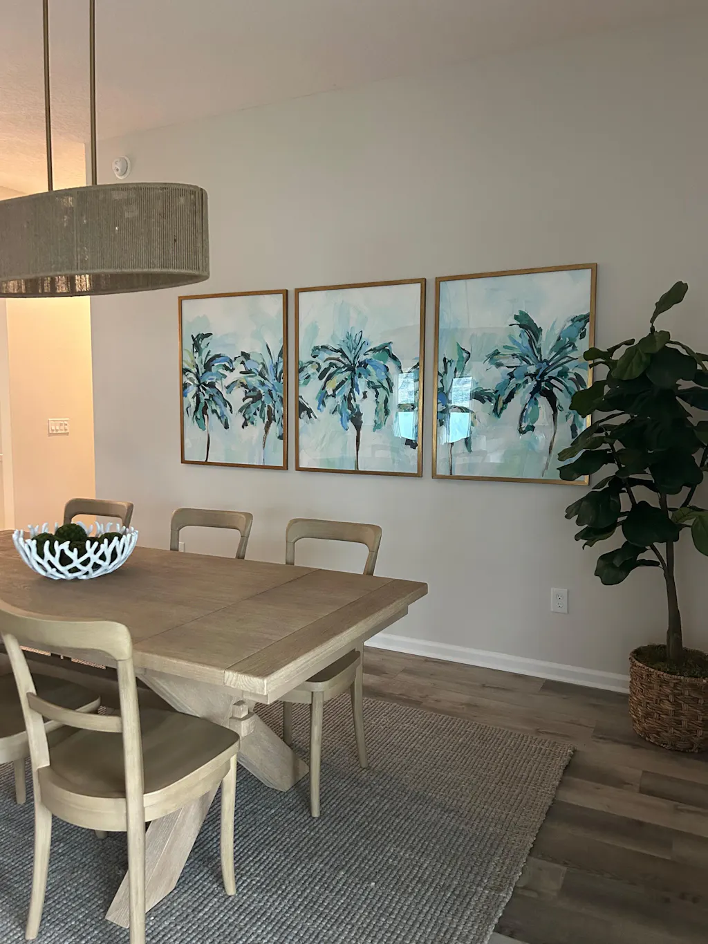 Float away into a dreamy tropical wonderland with our Caribbean Drift series. Chock full of a bright turquoise, blue, mint and green color palette, this collection features palm tree paintings, ocean seascapes and sea life illustrations in Jetty Home’s signature coastal style. "Breezy Island Palms" is a three-piece painting featuring a set of palm trees in mints, turquoise, green, yellows and browns.