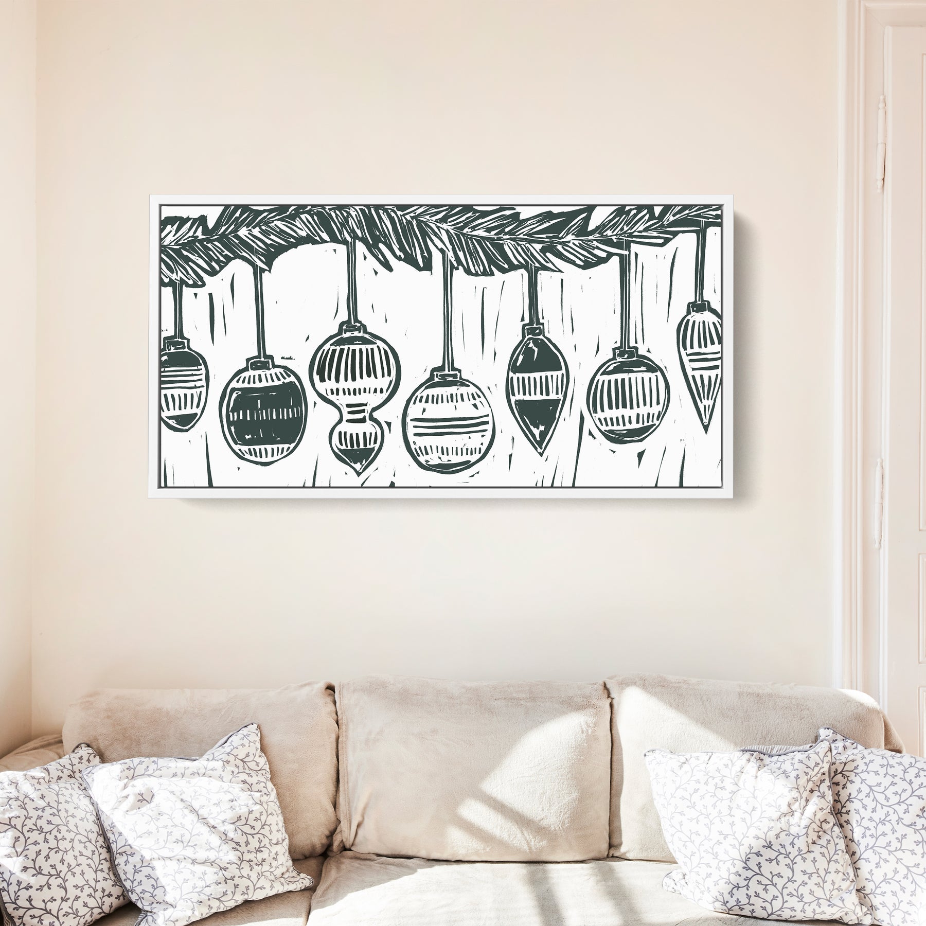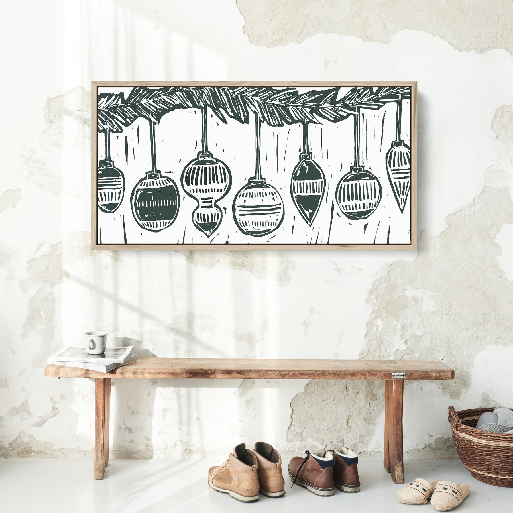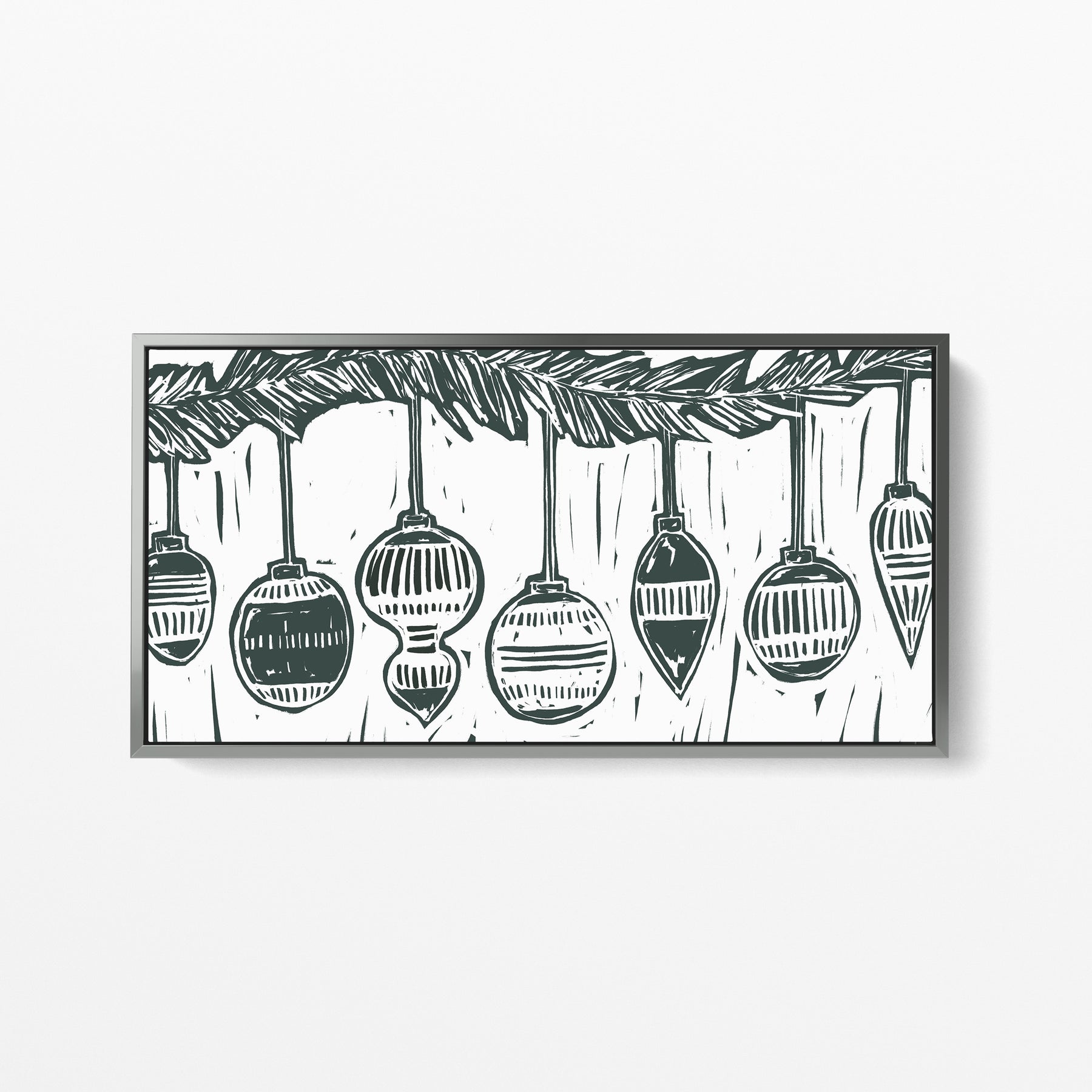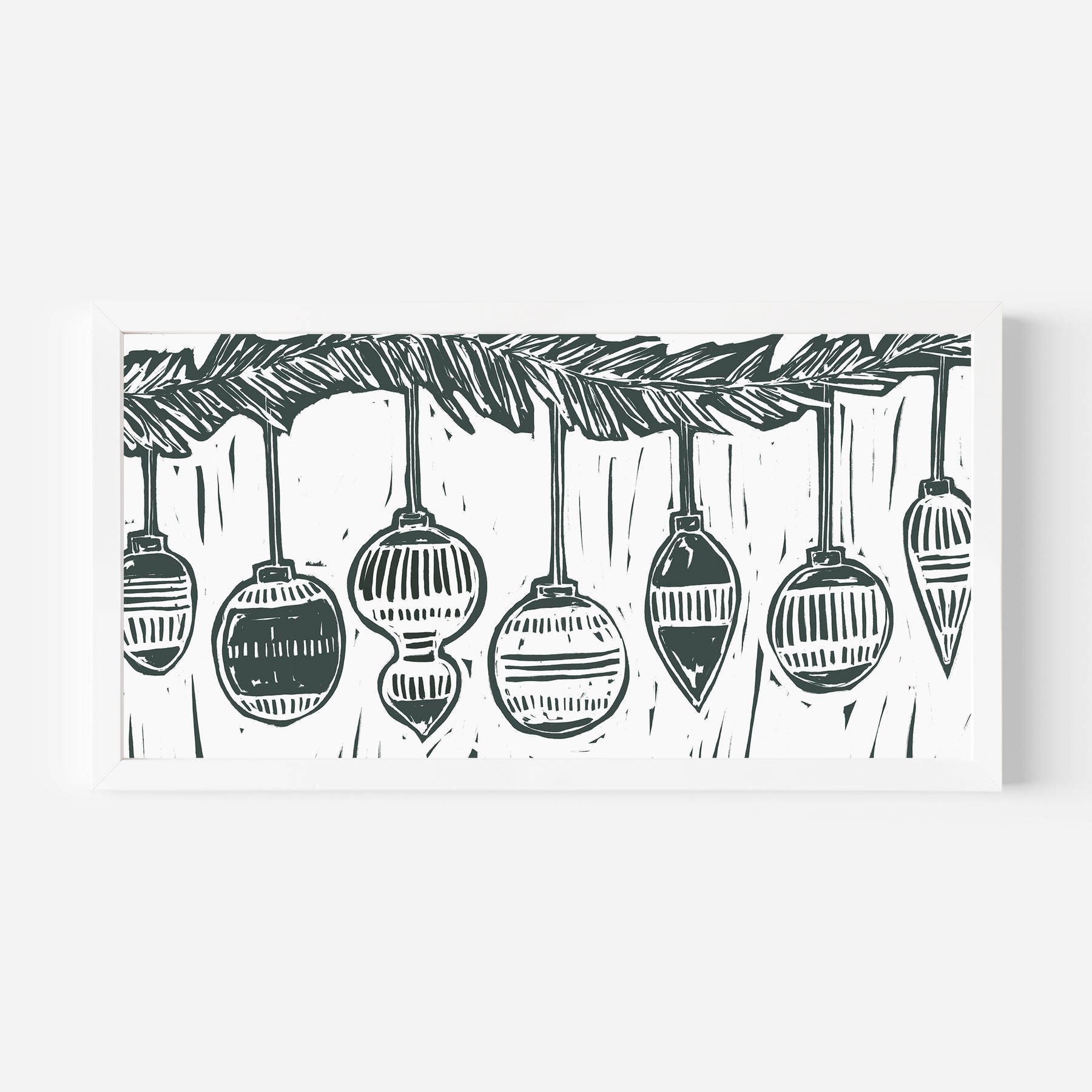 "Christmas Ornament Panoramic" is a horizontally/landscape oriented holiday ornament illustration in tones of deep green and white.