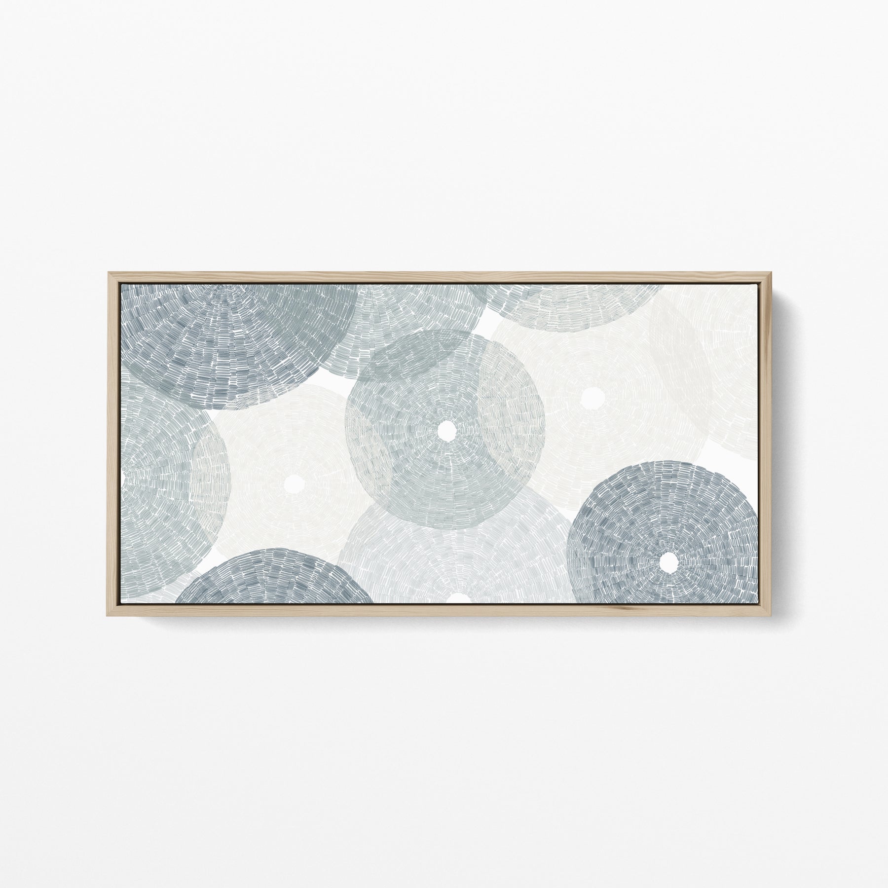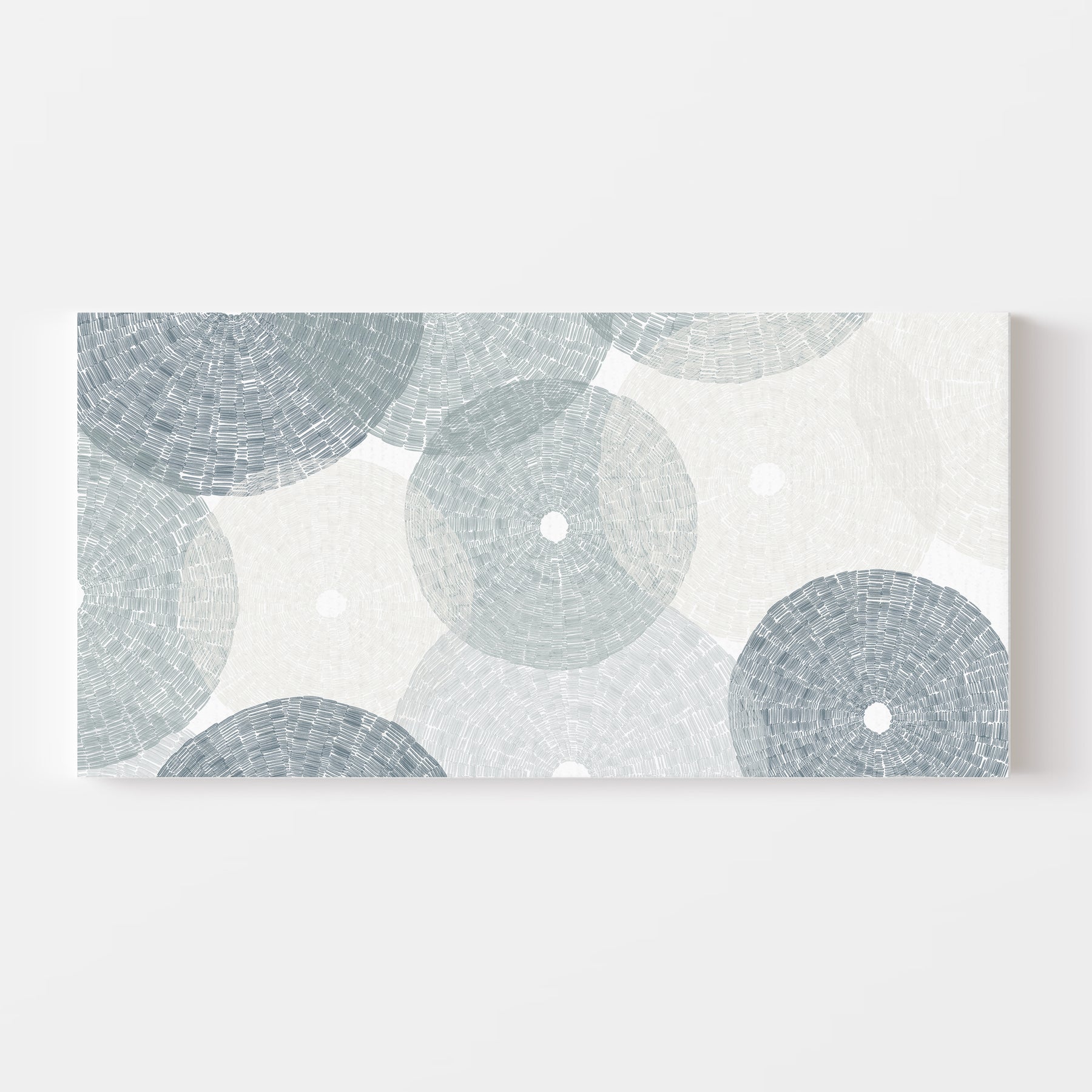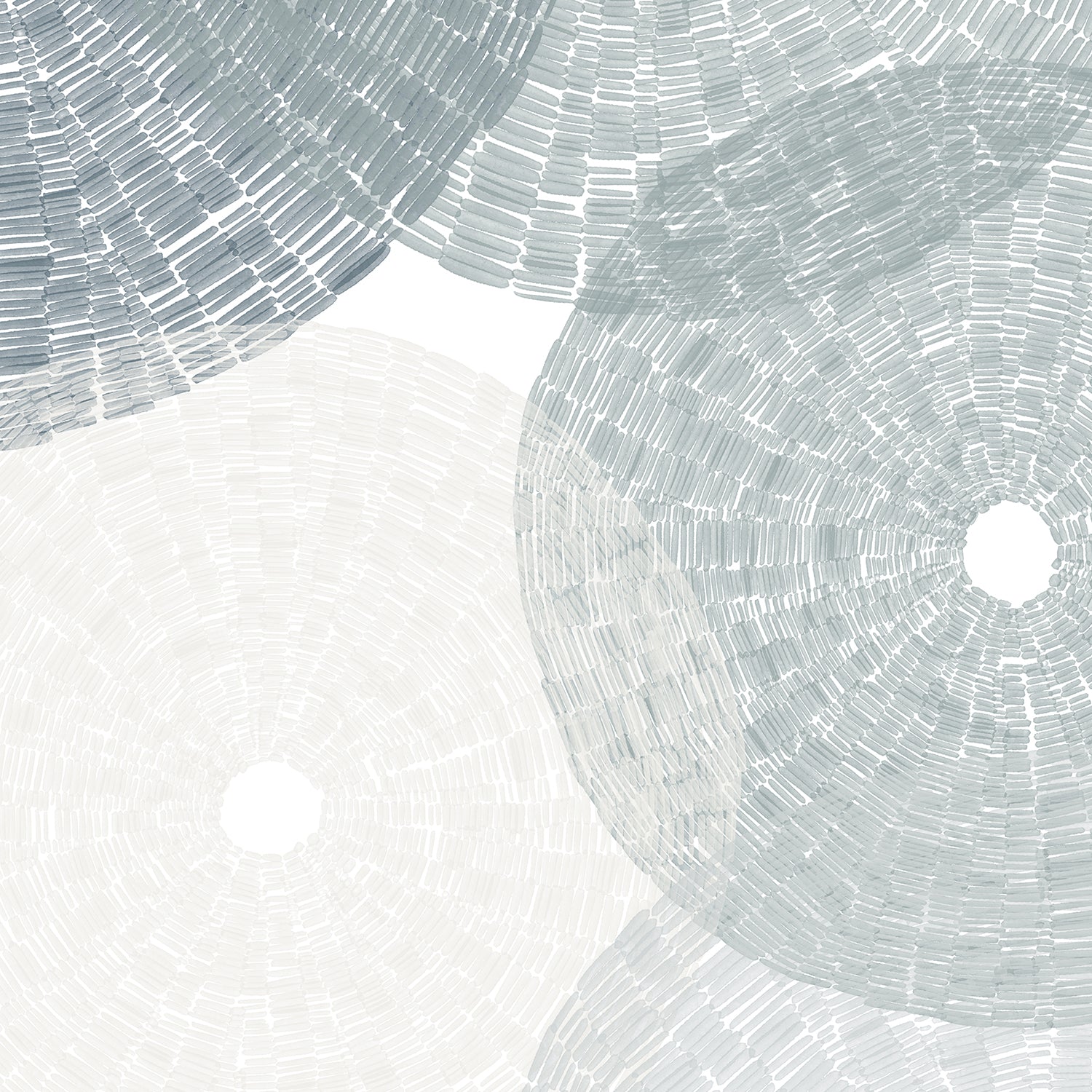 "Dance of the Ocean" is a horizontal panoramic modern minimalist sea urchin pattern in tones of slate blue, light gray, muted seafoam and beige on a white background.