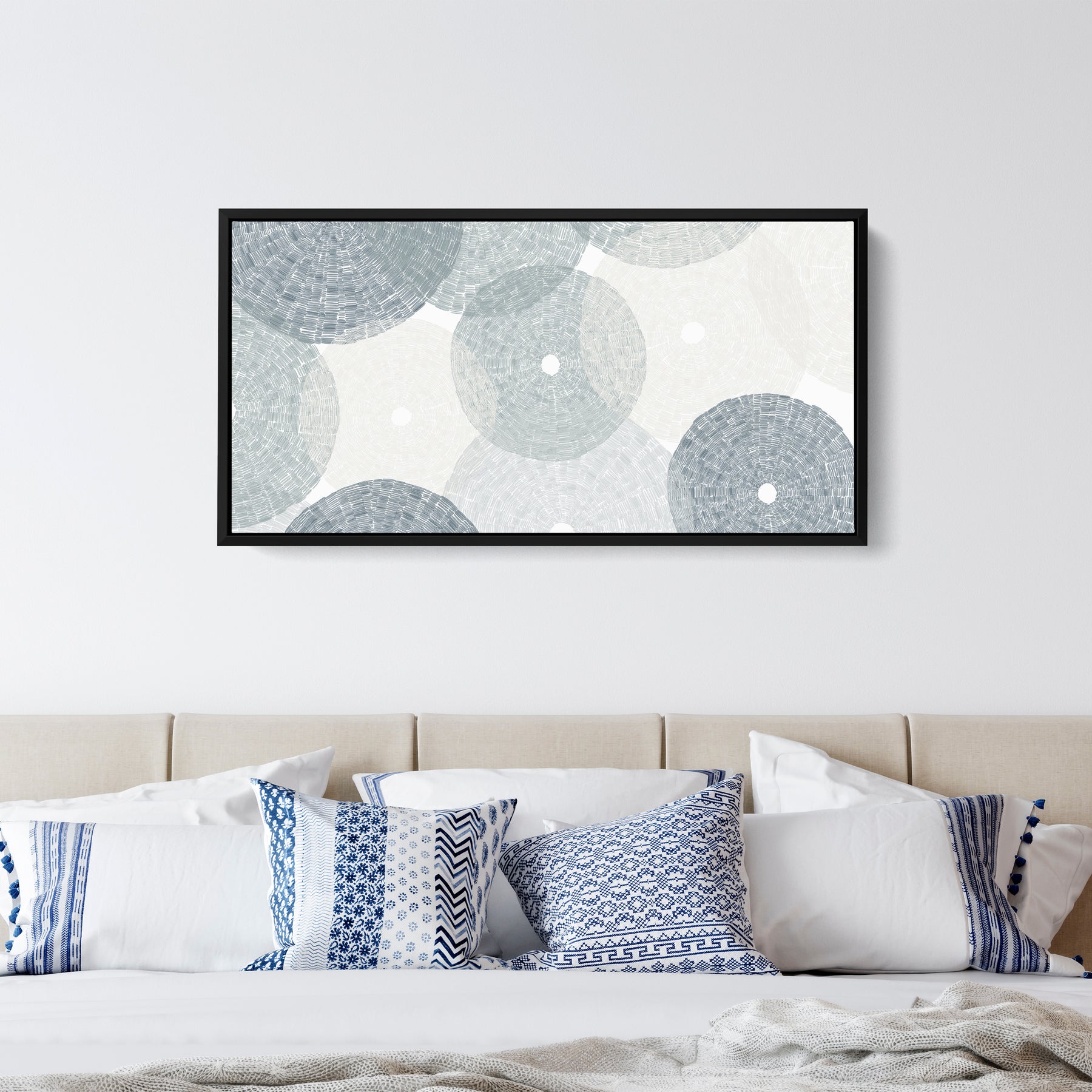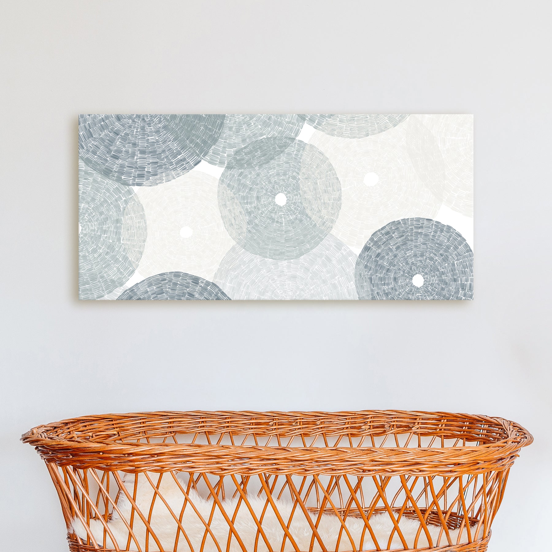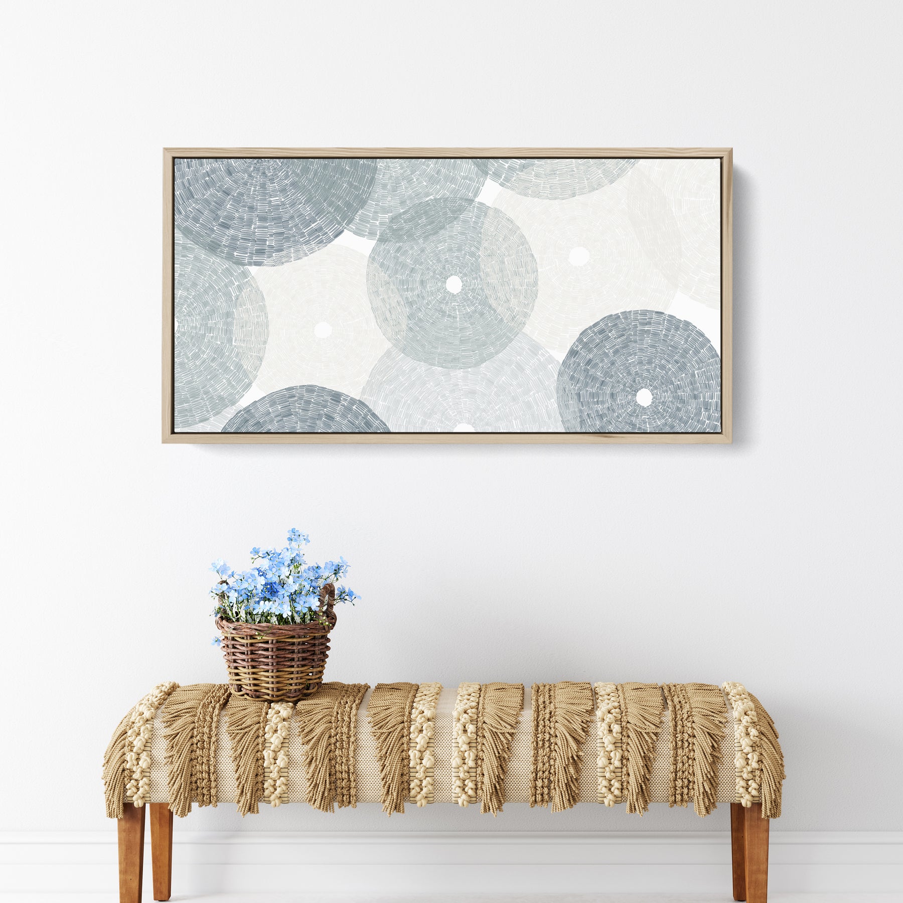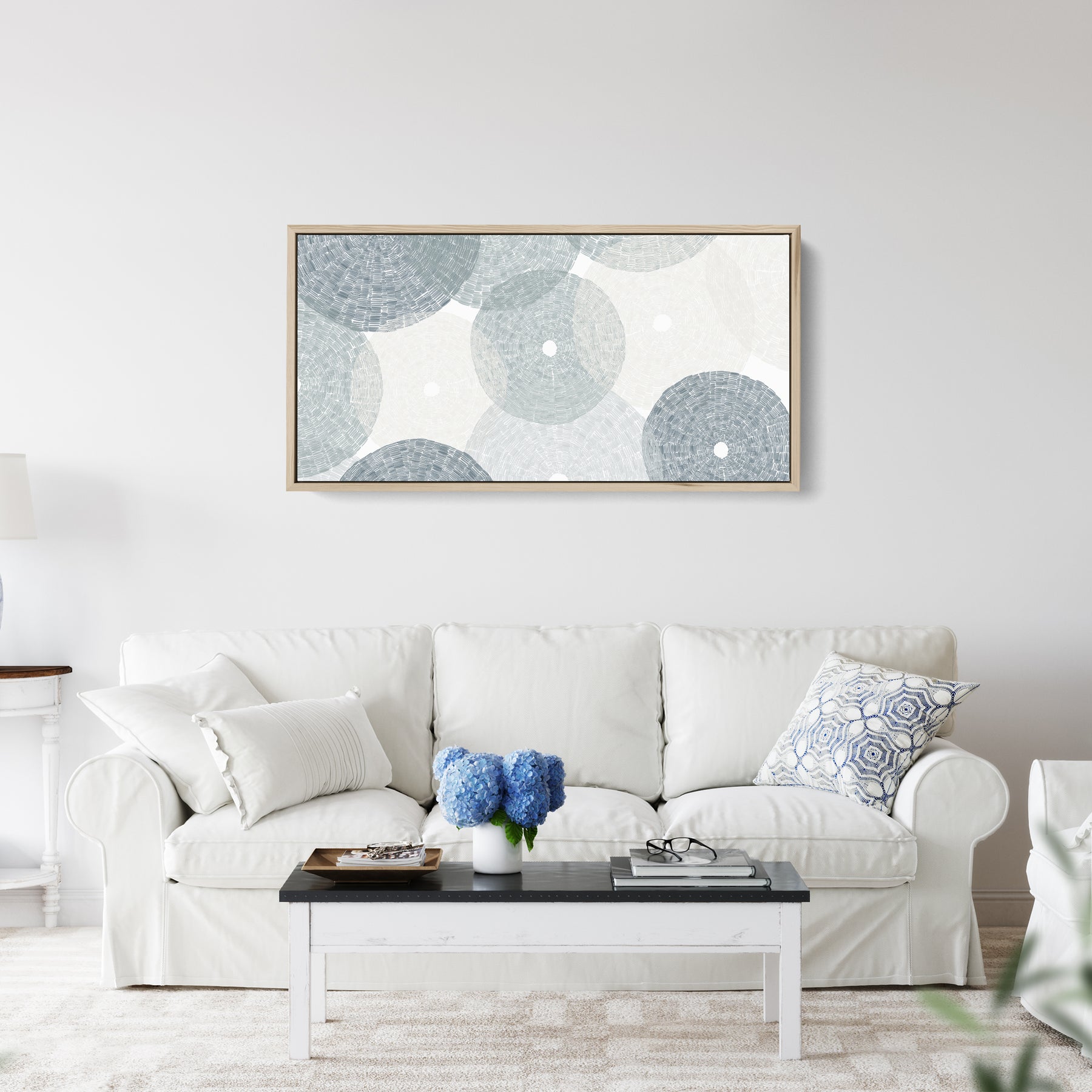 "Dance of the Ocean" is a horizontal panoramic modern minimalist sea urchin pattern in tones of slate blue, light gray, muted seafoam and beige on a white background.
