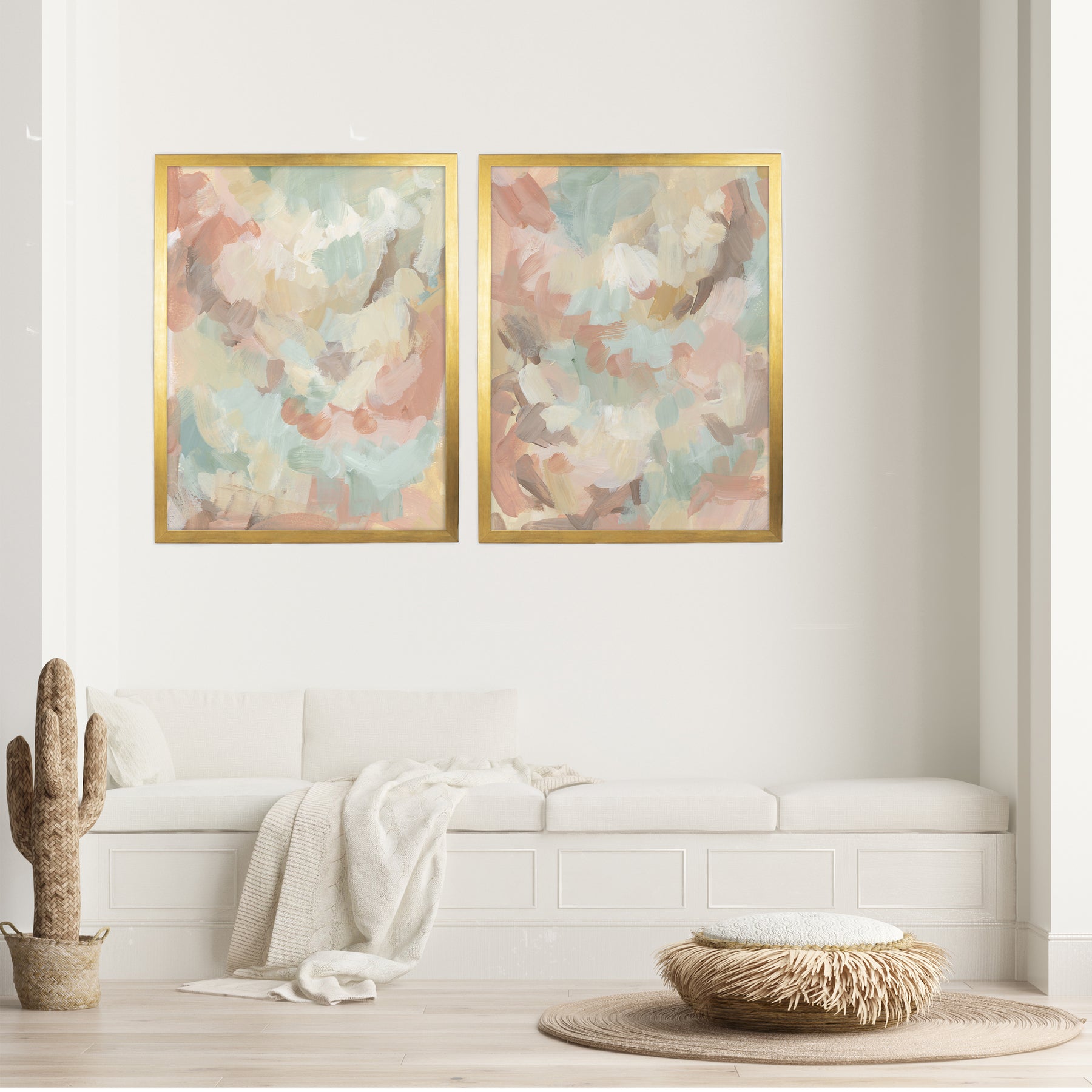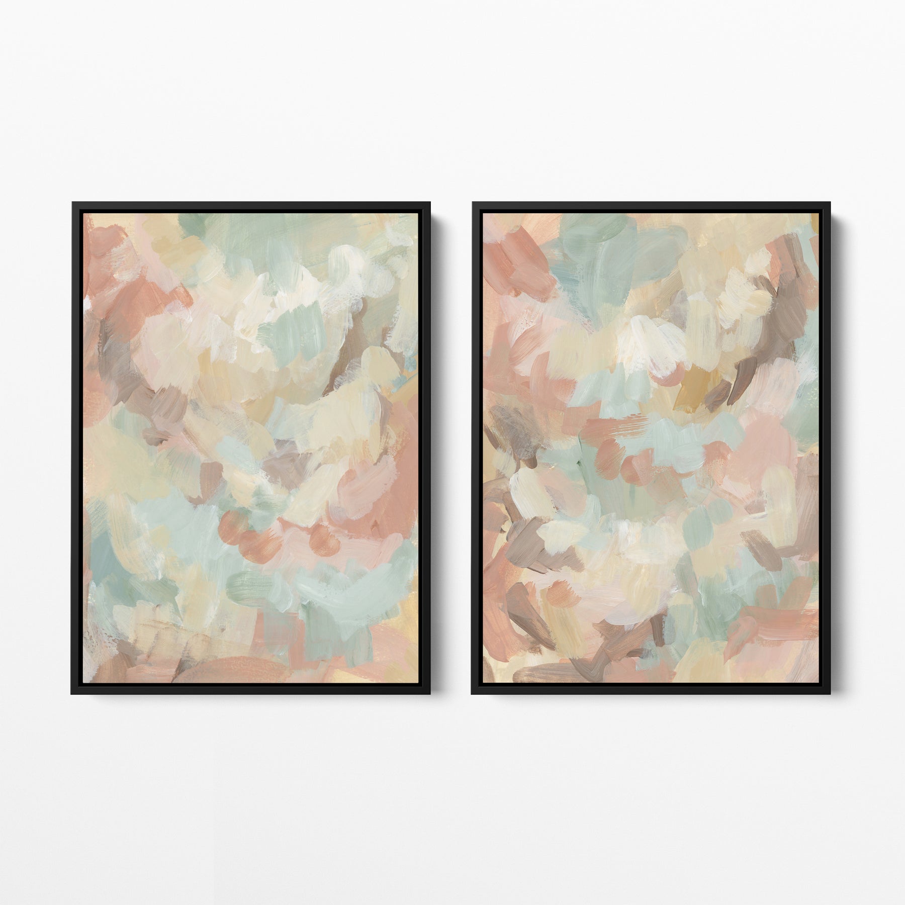 "Golden Brush Diptych" is a vertically oriented two-piece abstract painting set in tones of golden tan, dusty blush, sage green, warm beige, dark brown and terracotta.