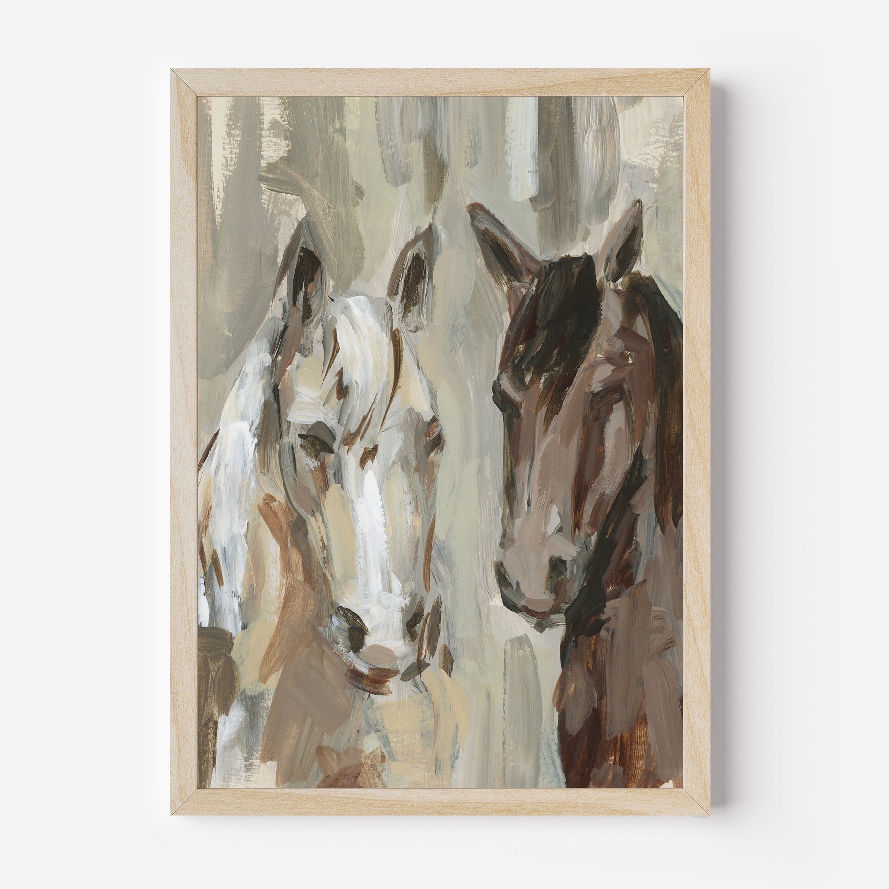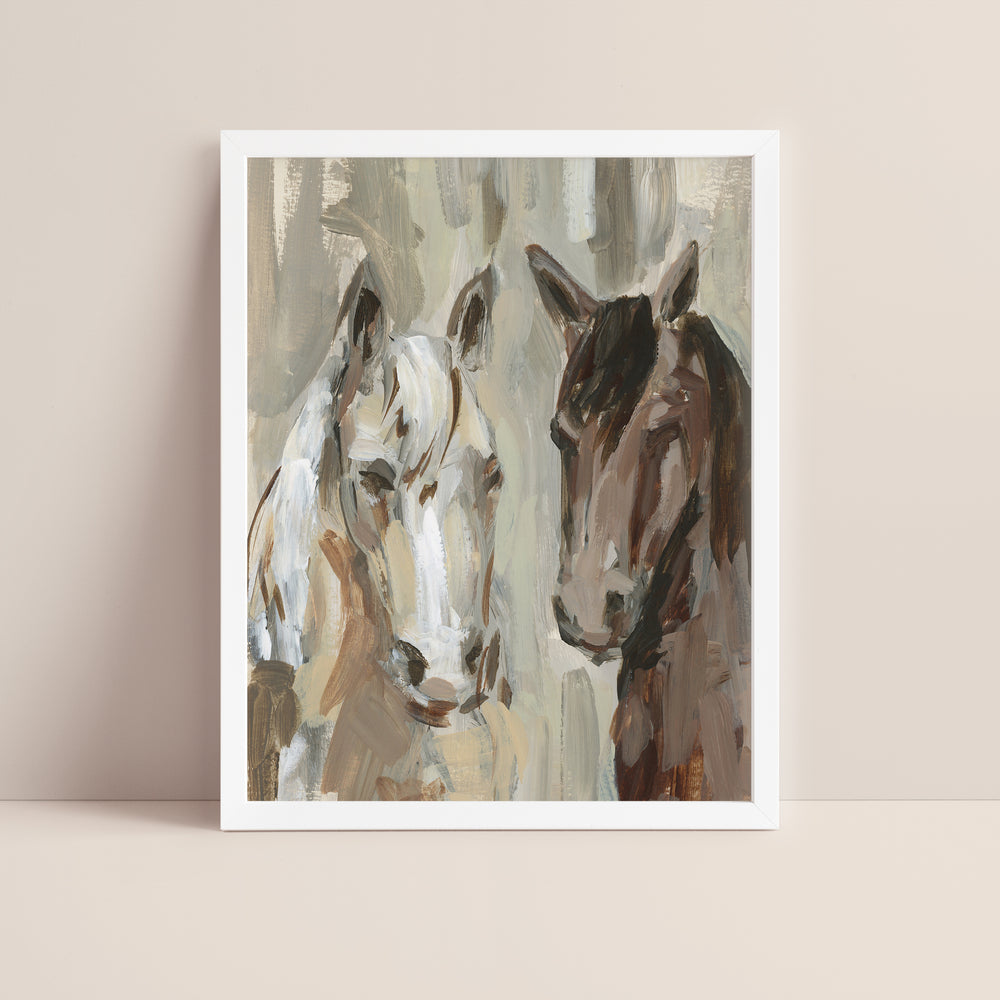 "Horse Duo" is a vertically oriented horse painting in tones of burnt sienna, rich brown, taupe, ivory and muted umber.