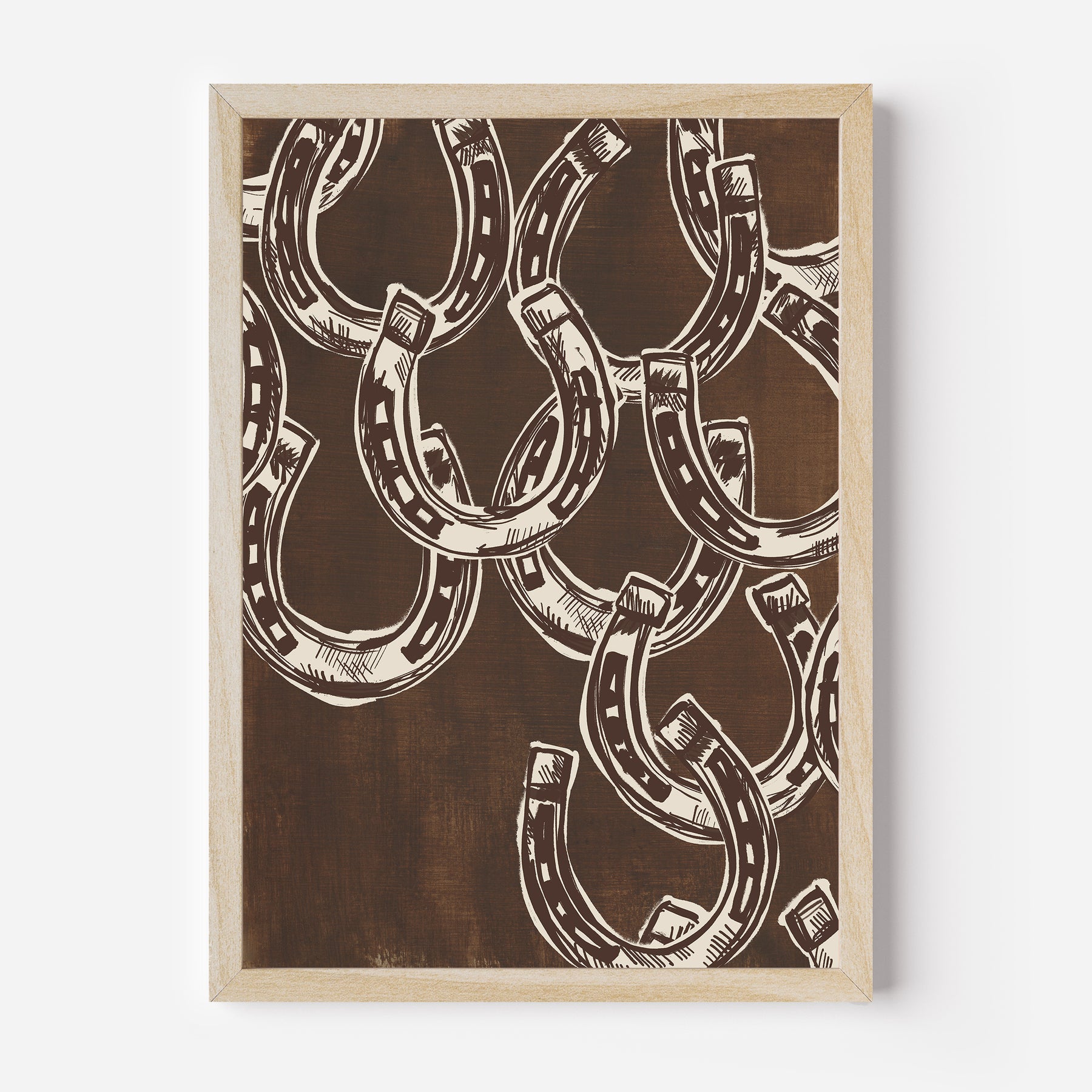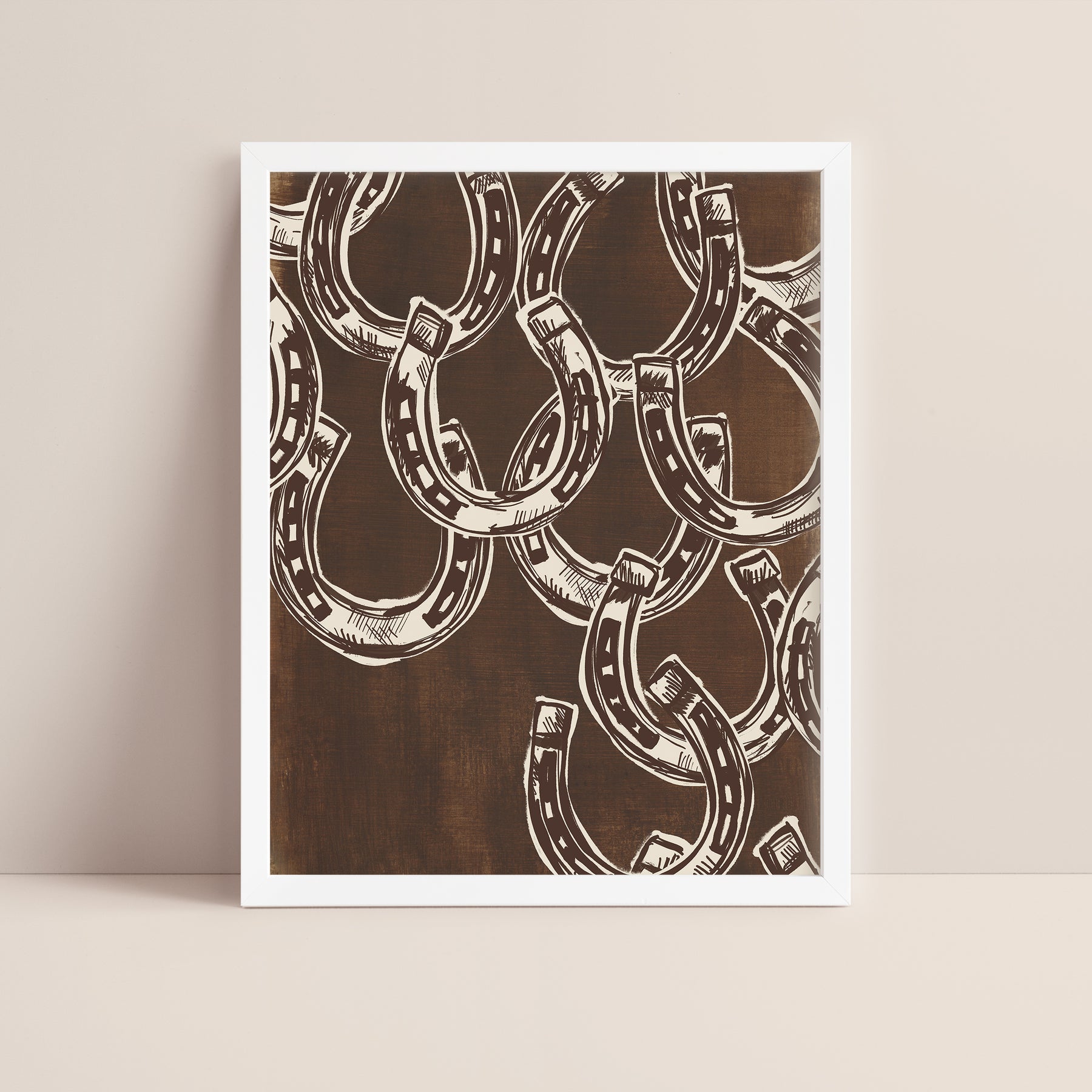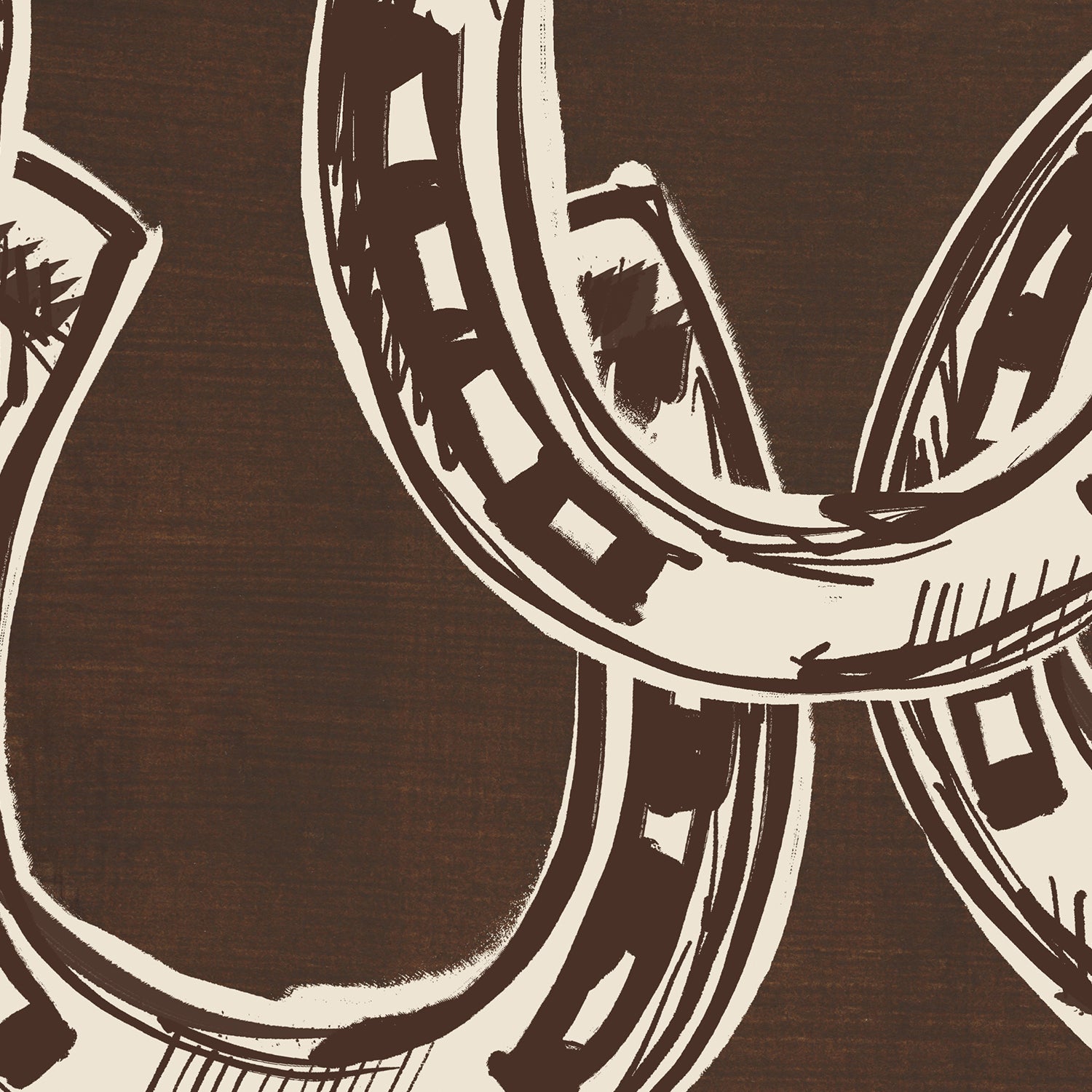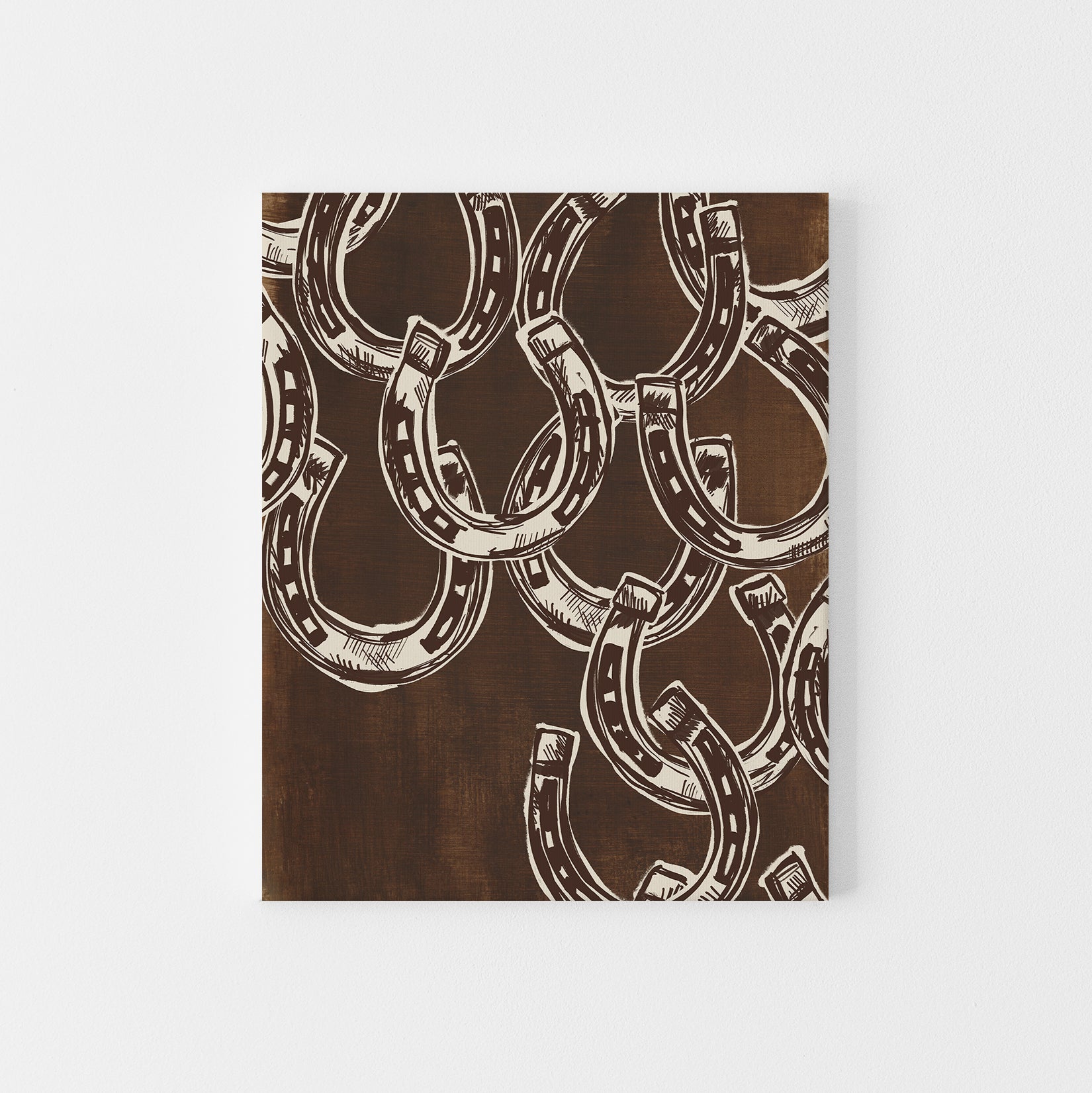 "Horseshoe Haven" is a vertically oriented western illustration in beige on a textured/painted dark brown toned background.