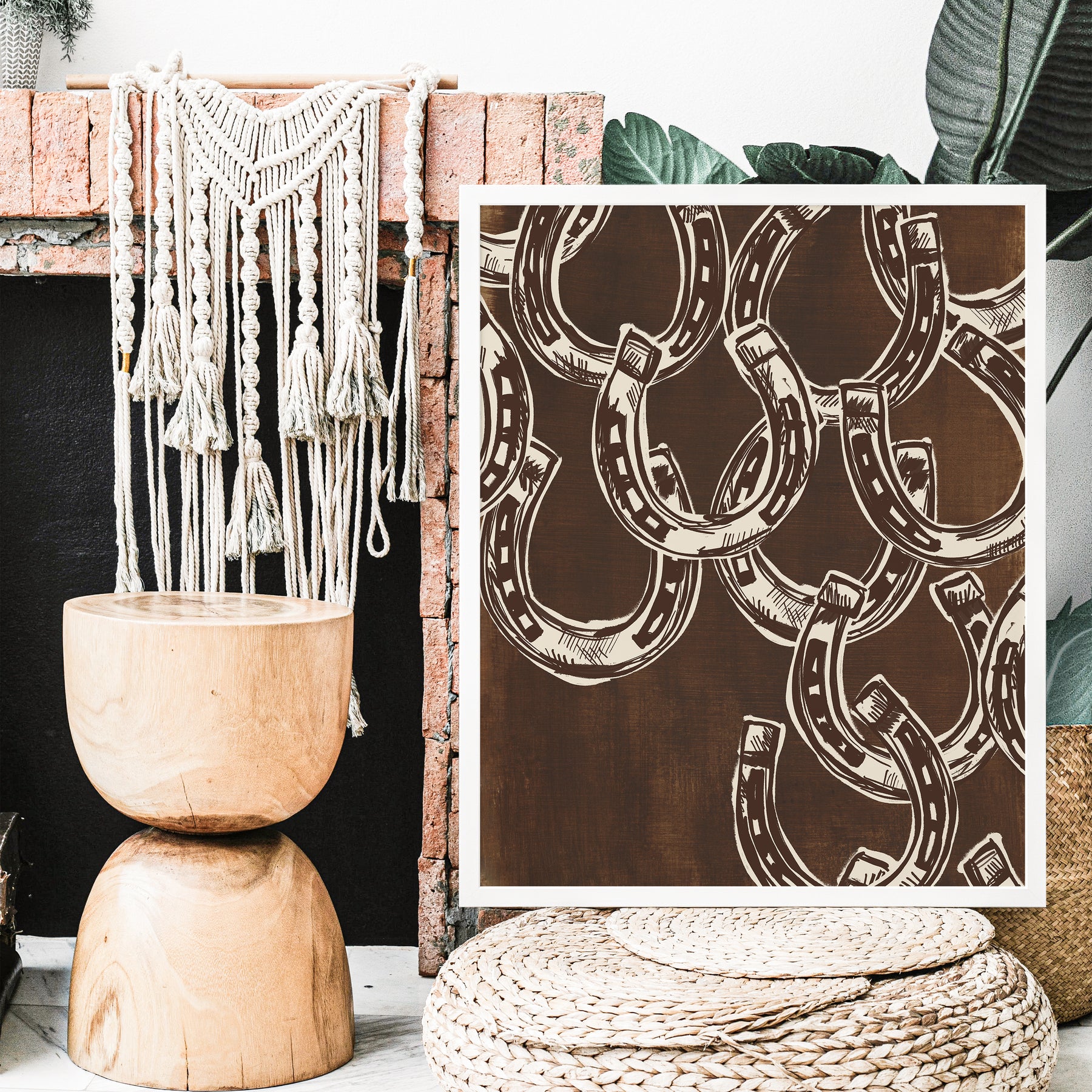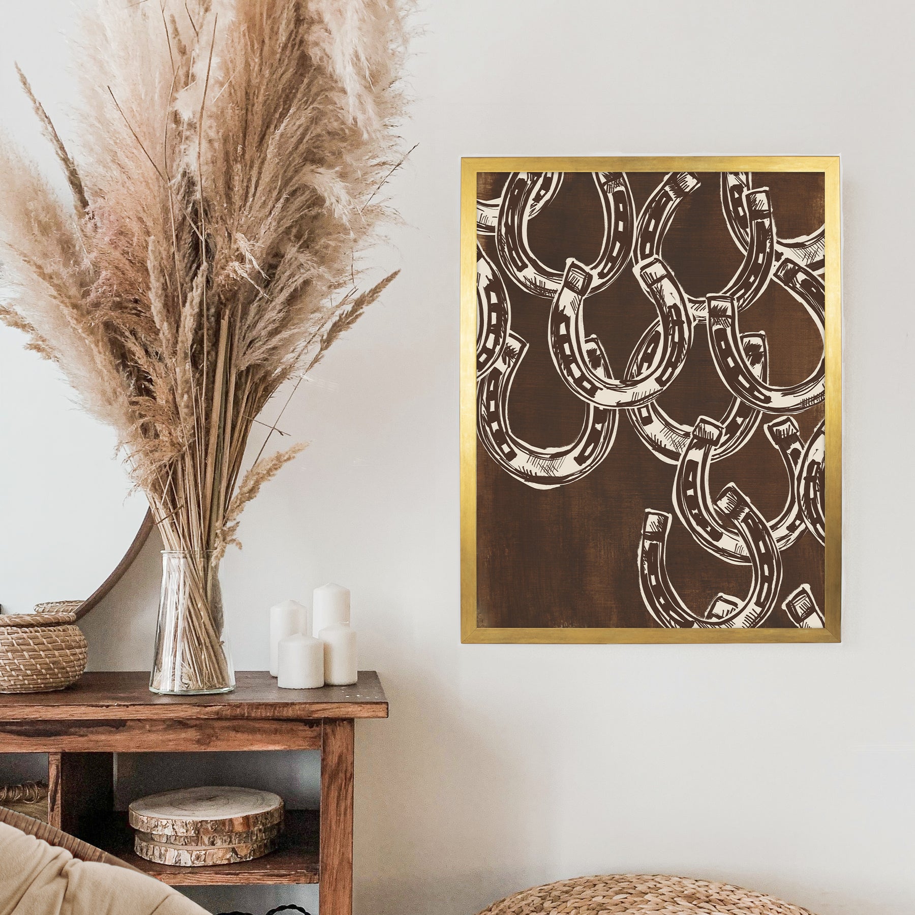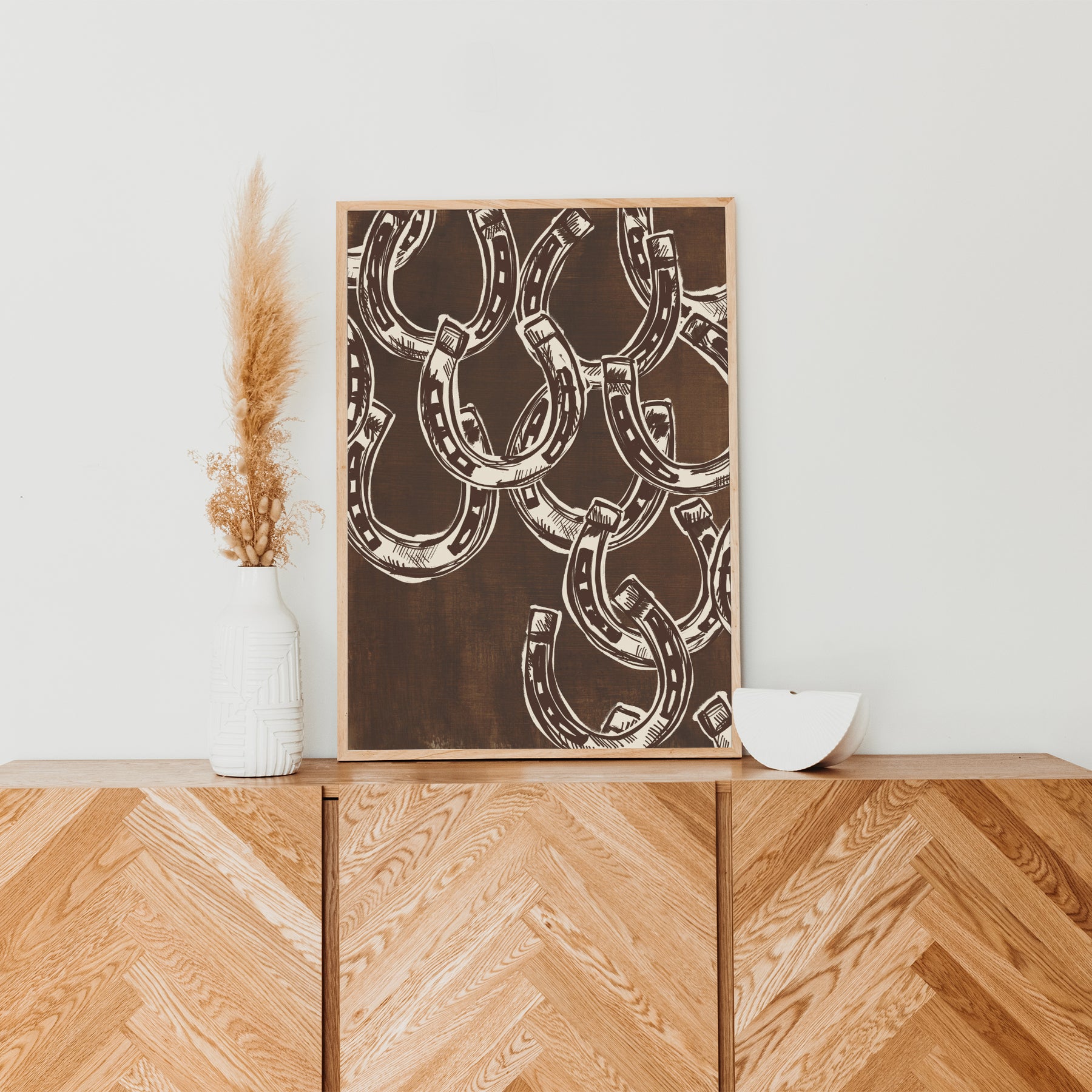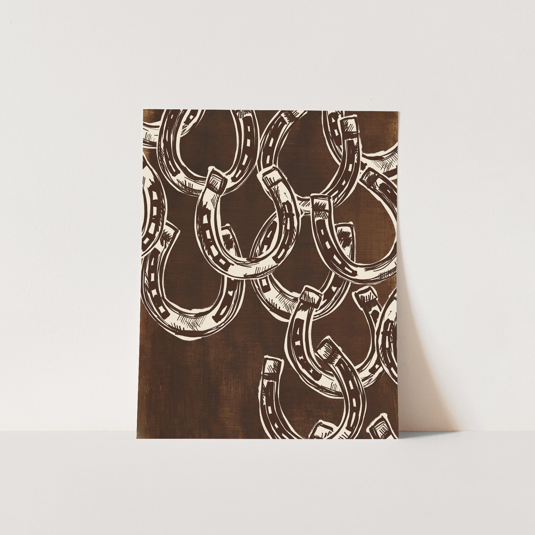 "Horseshoe Haven" is a vertically oriented western illustration in beige on a textured/painted dark brown toned background.