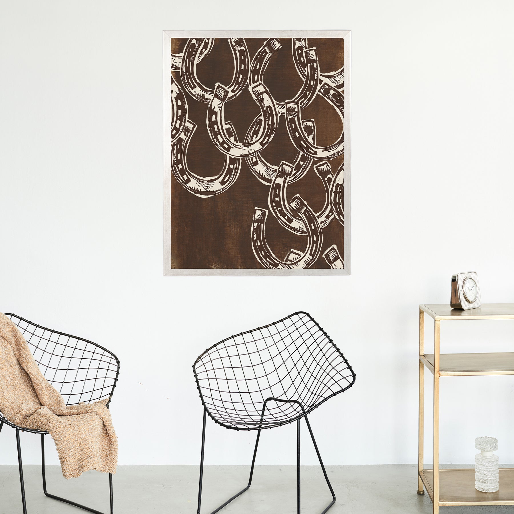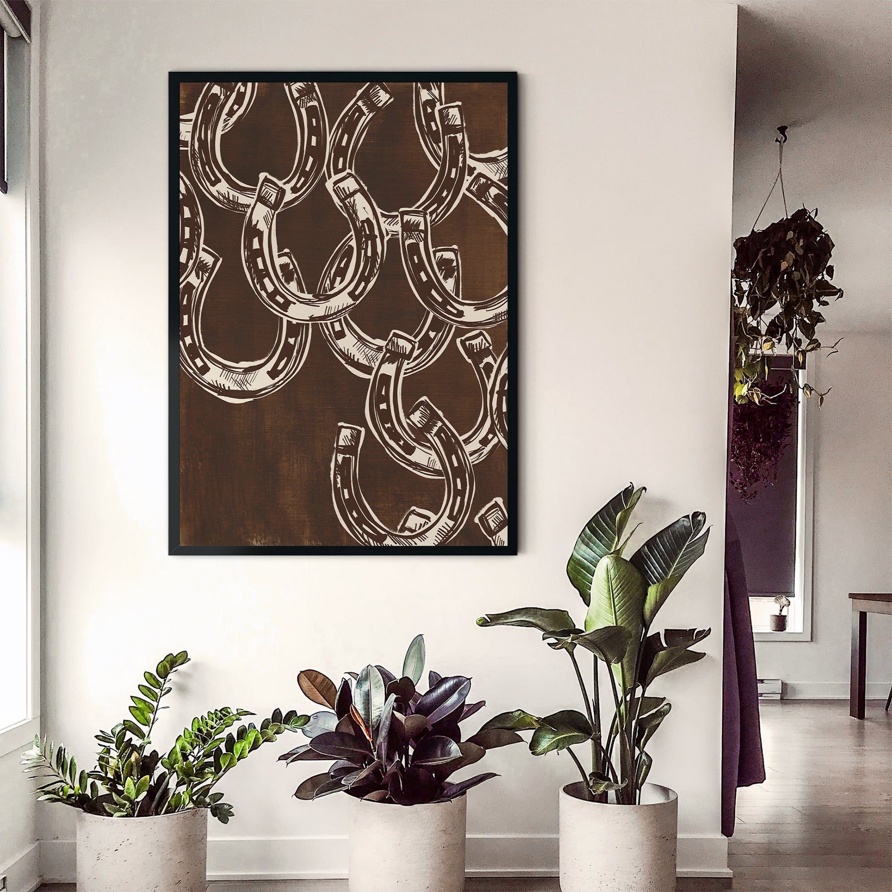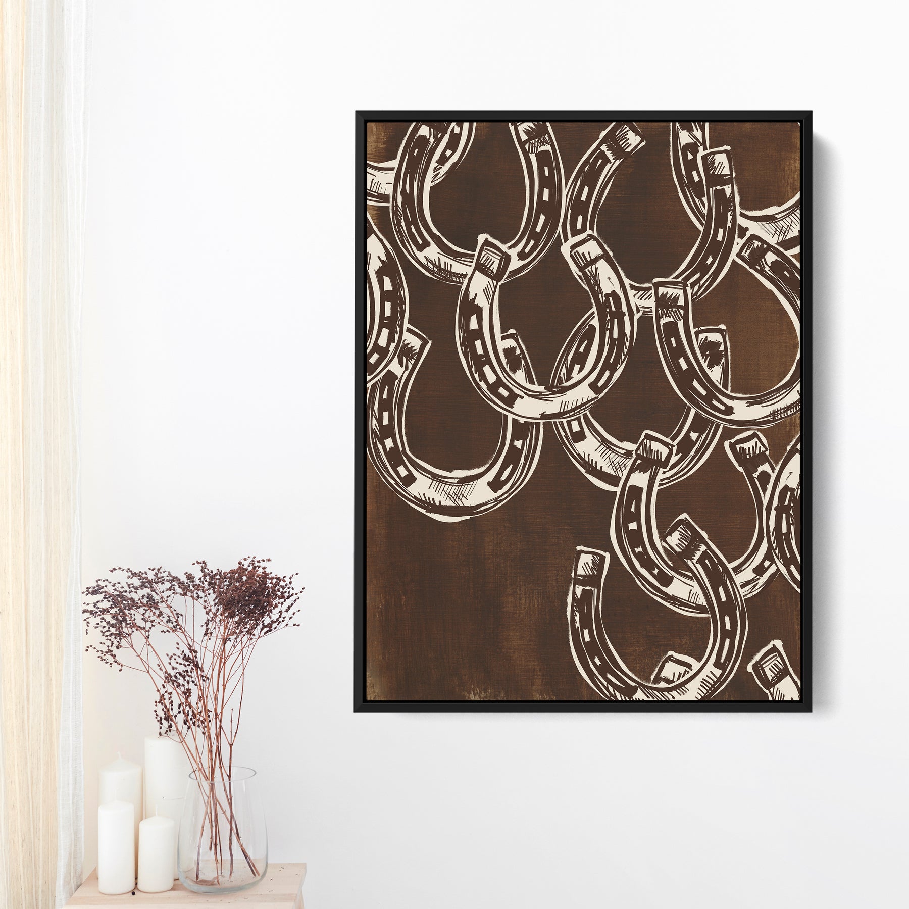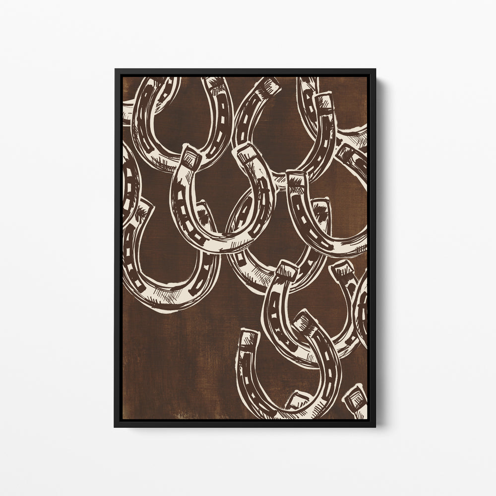 "Horseshoe Haven" is a vertically oriented western illustration in beige on a textured/painted dark brown toned background.