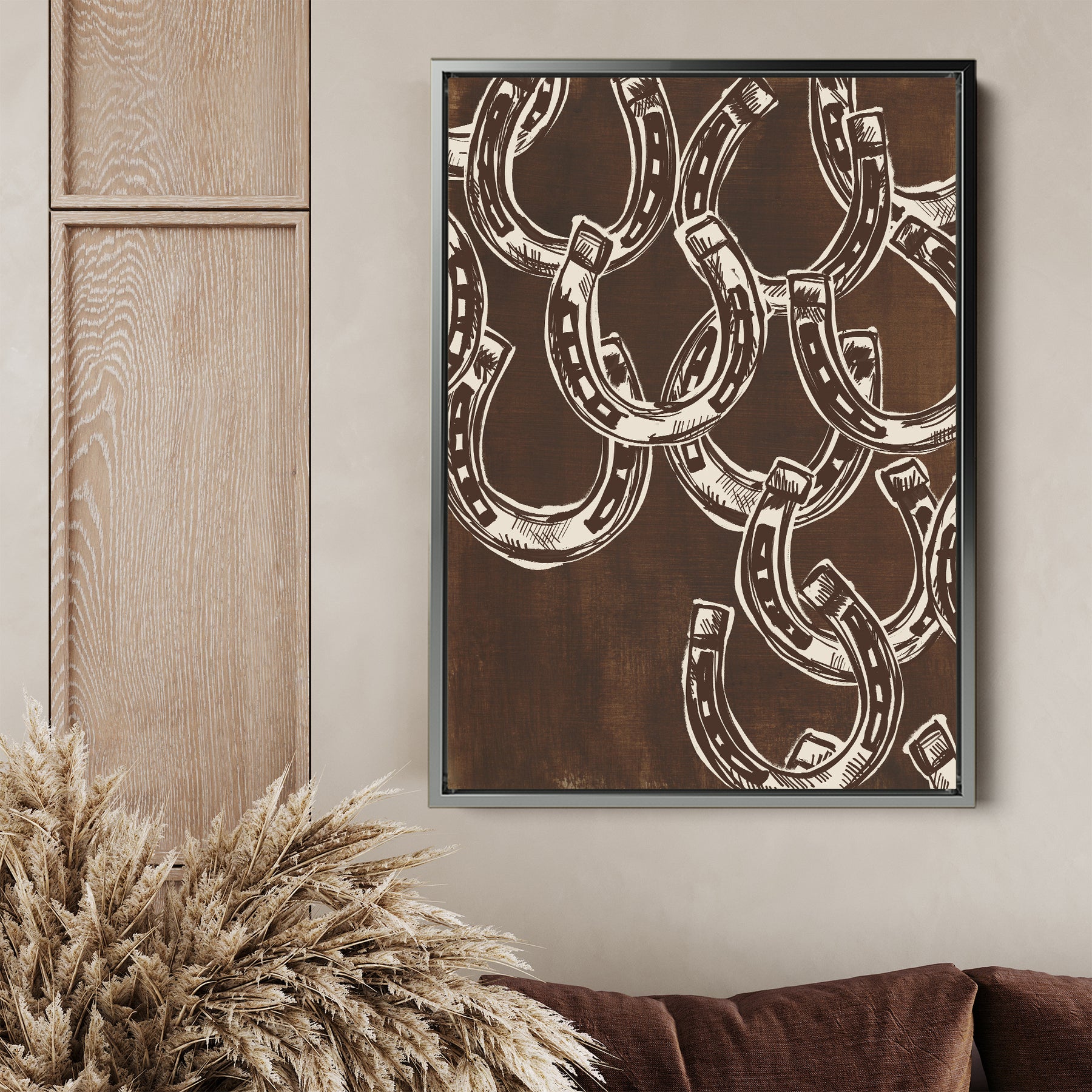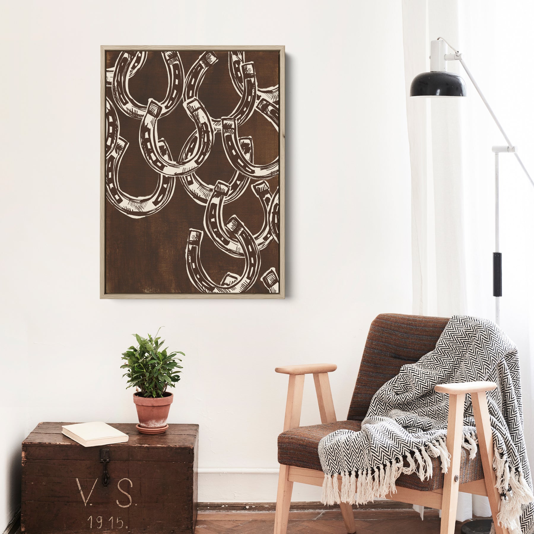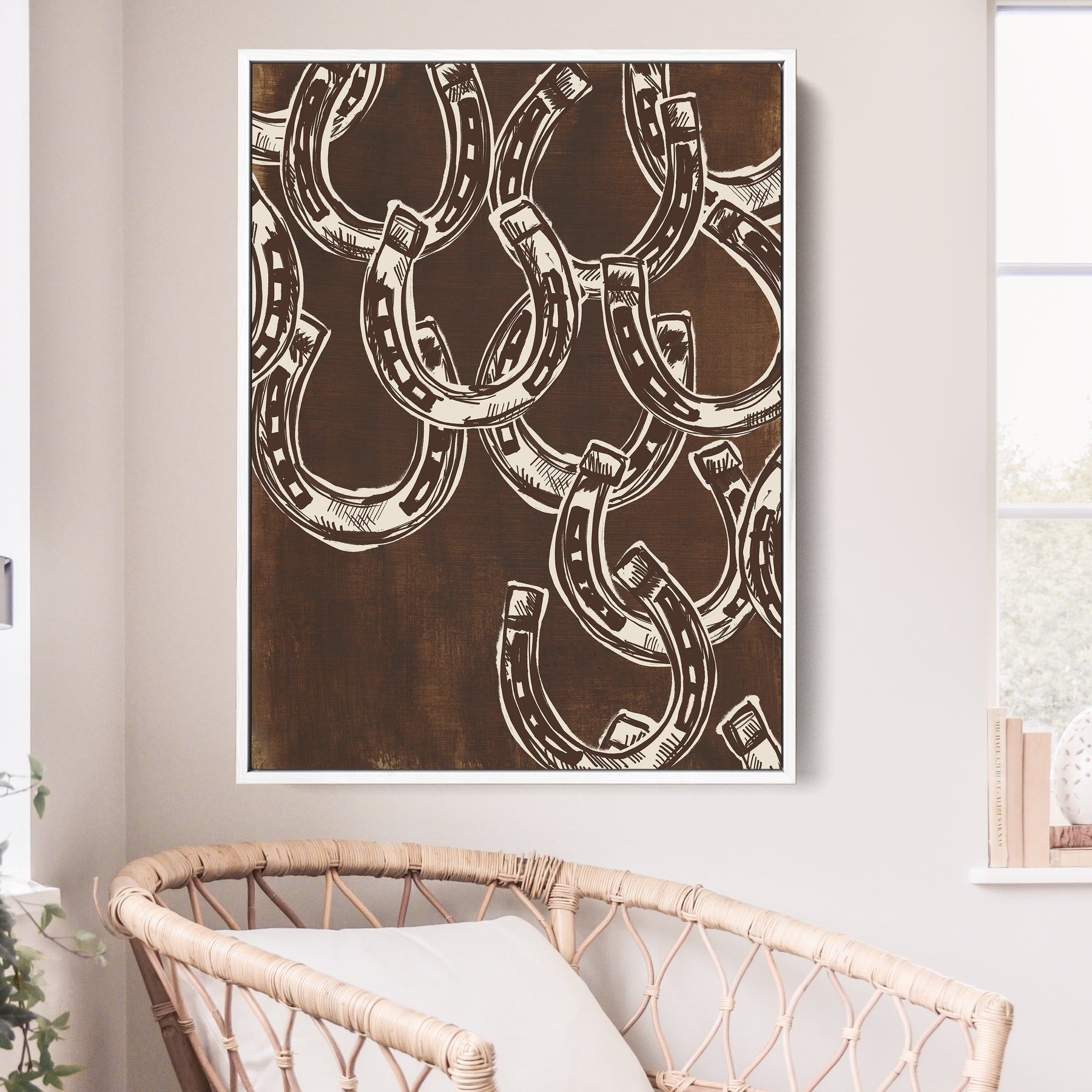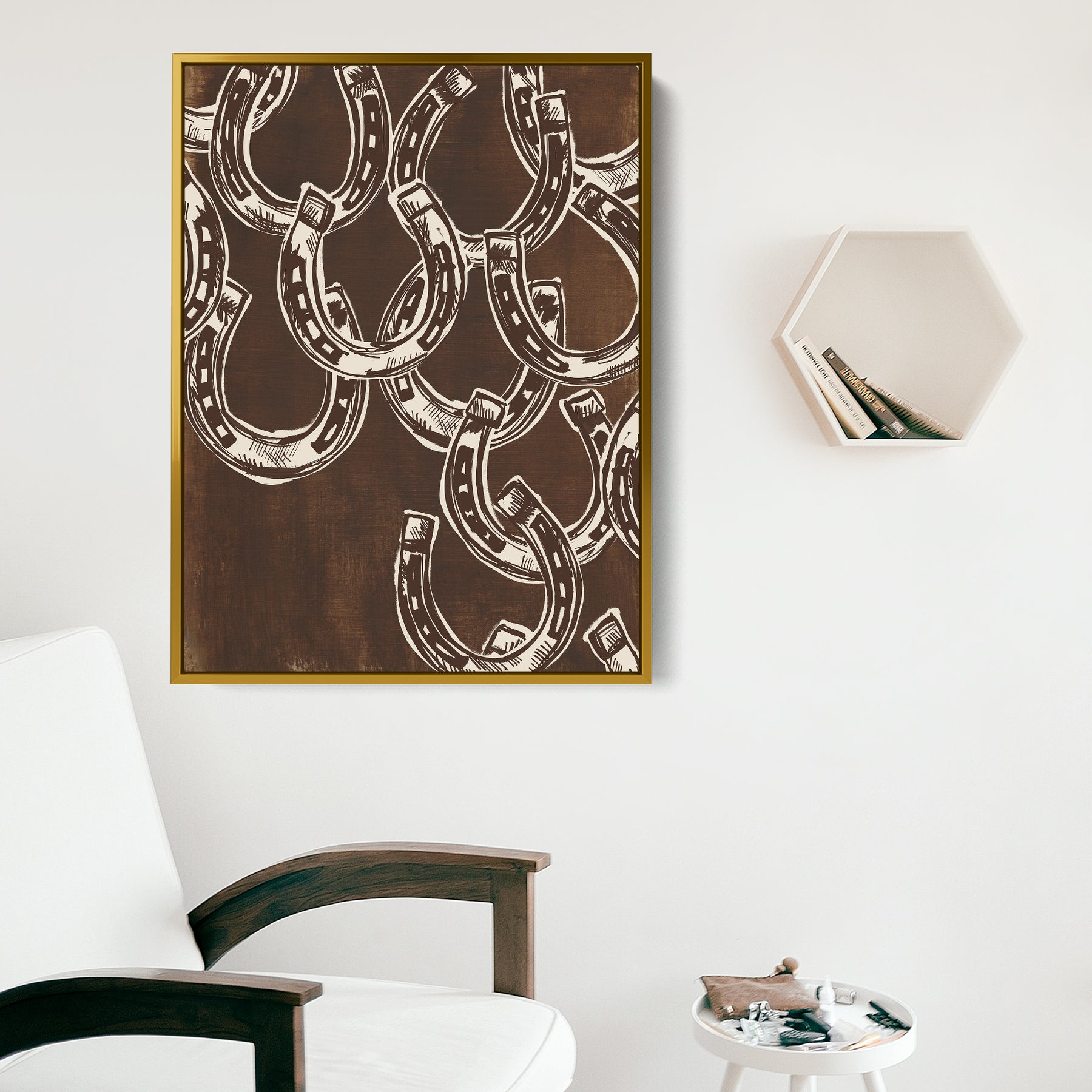 "Horseshoe Haven" is a vertically oriented western illustration in beige on a textured/painted dark brown toned background.