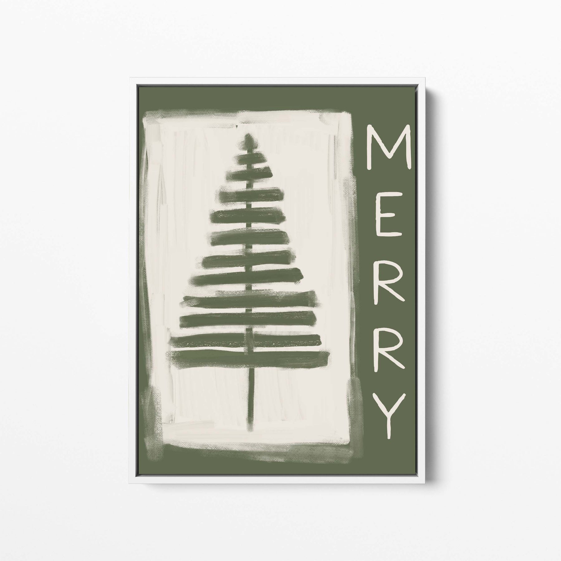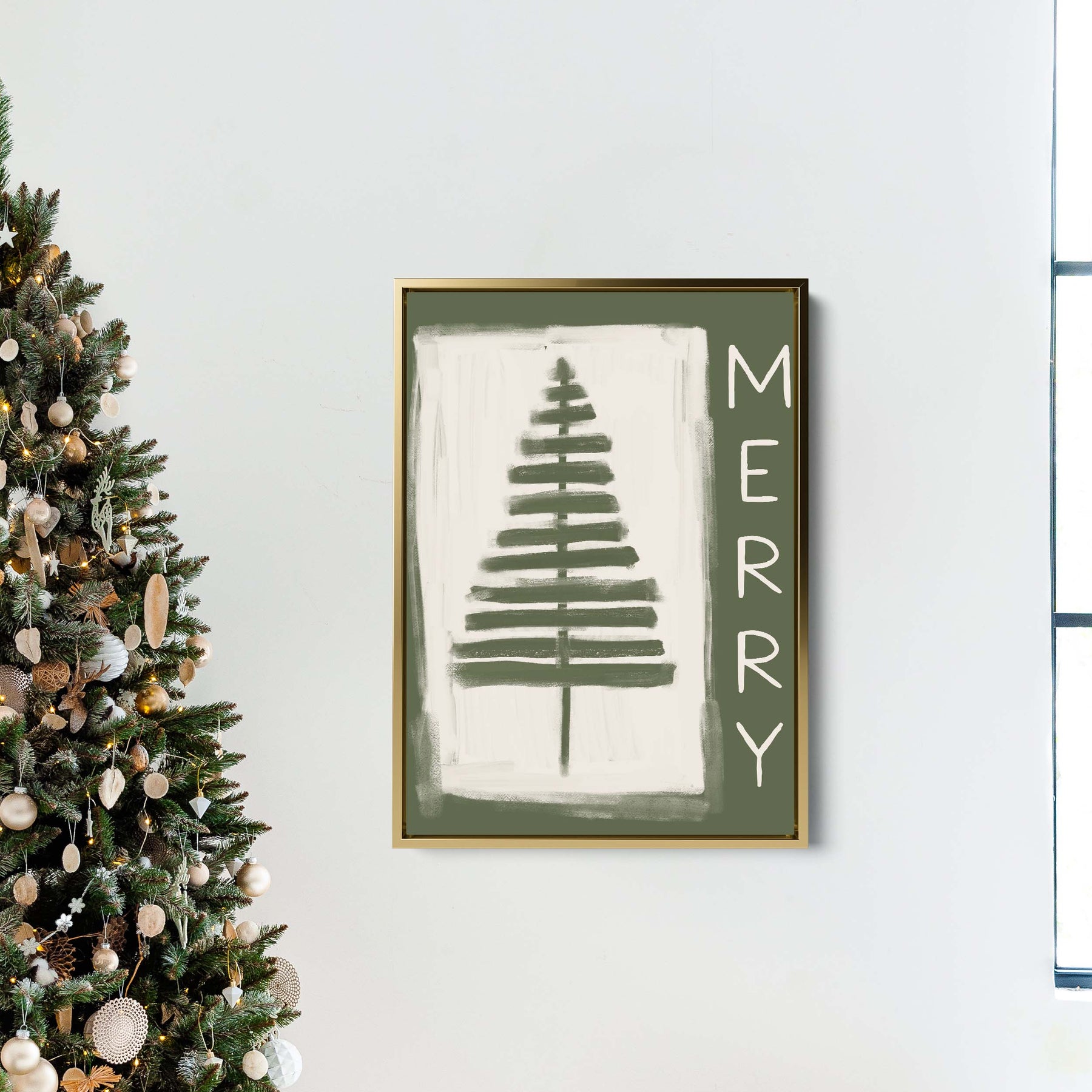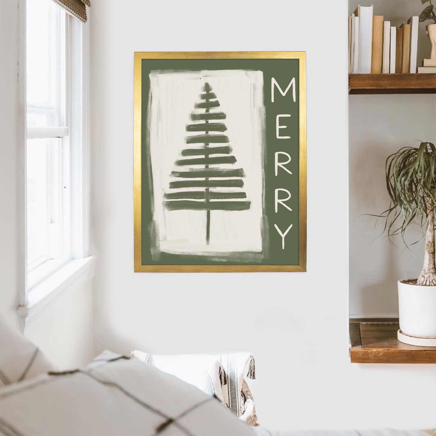 Embrace the peace and joy of the holiday season with our “Christmas Hope” series of artwork. Filled with moody landscape illustrations, pine tree motifs and nativity scenes, this collection brings a modern take on holiday style to your home decor. “Minimalist Christmas Merry" is a vertically oriented Christmas tree illustration with the word "Merry" on the side in hues of green and beige.