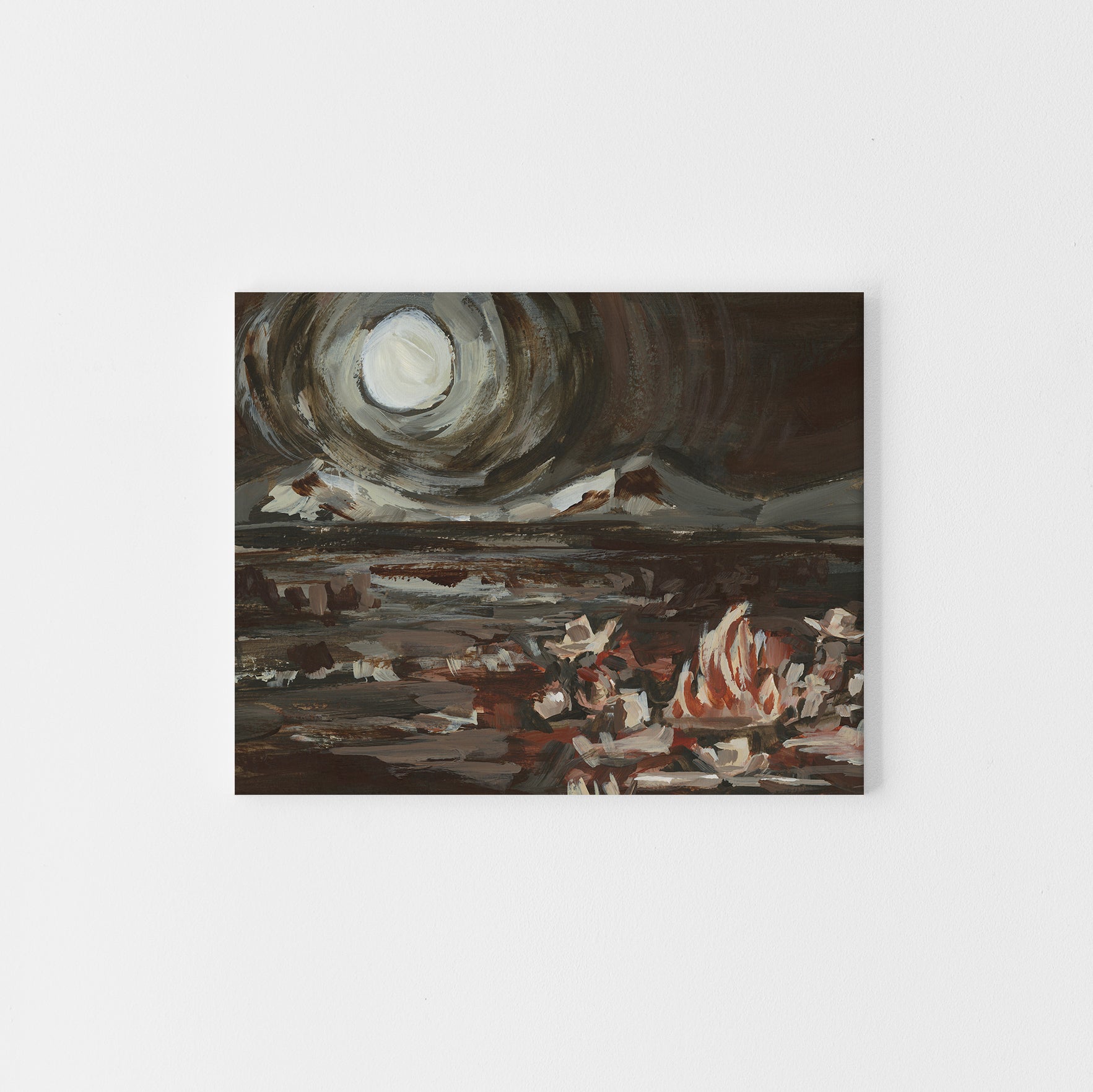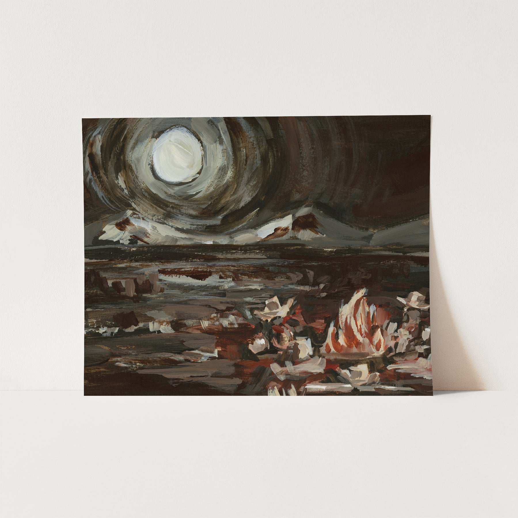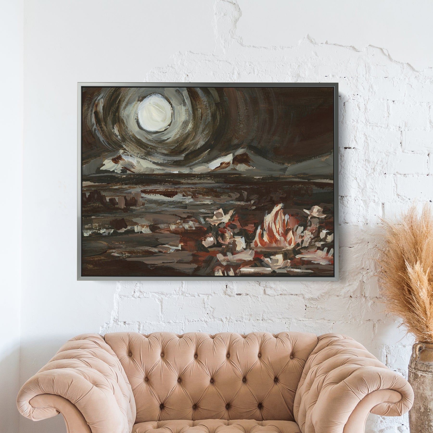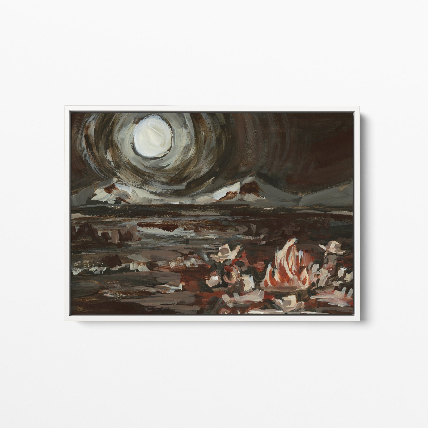 "Moonlite Valley" is a horizontally oriented western landscape painting in tones of burnt sienna, rich brown, taupe, ivory and muted umber.