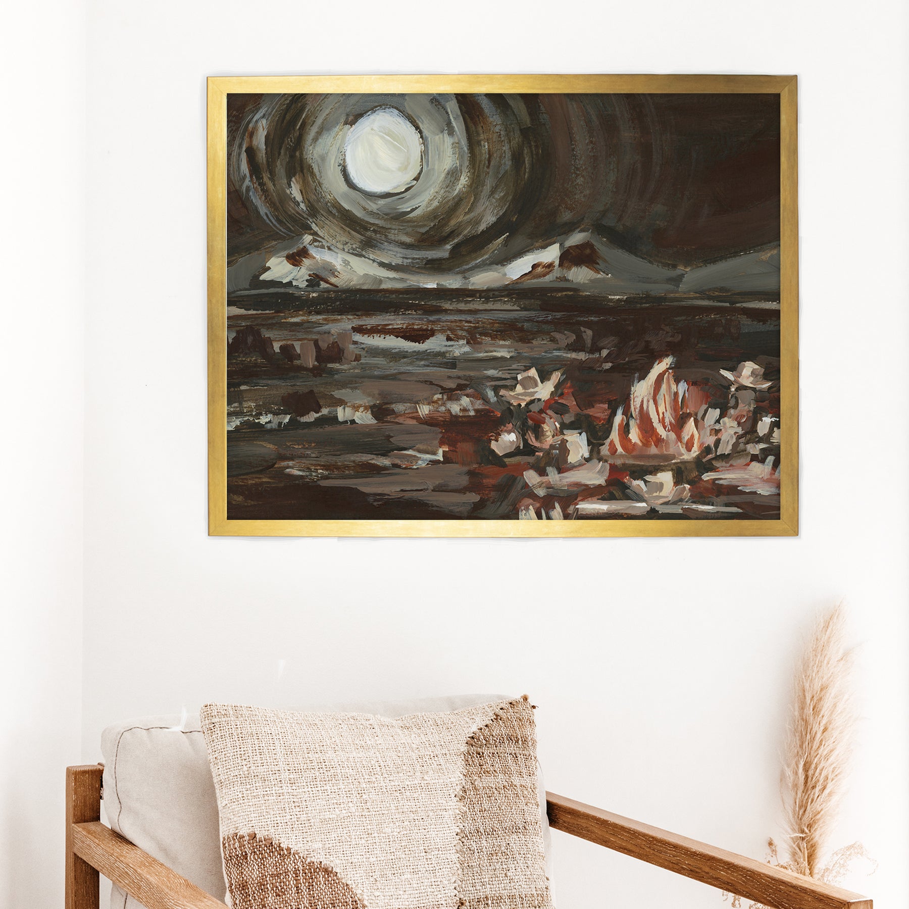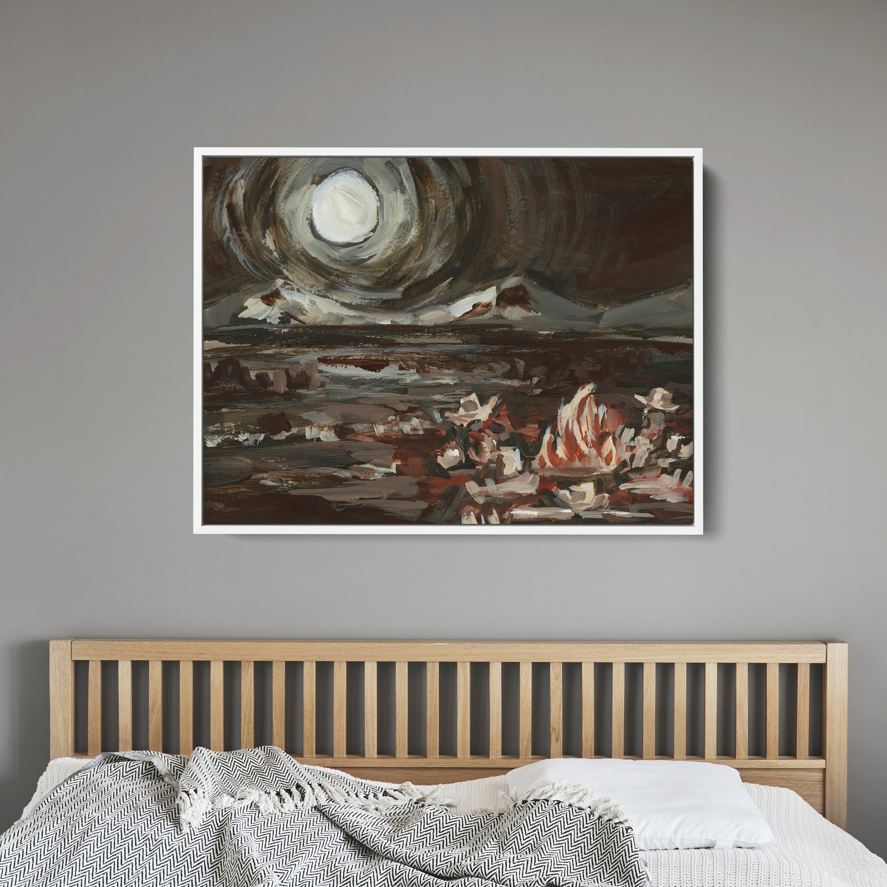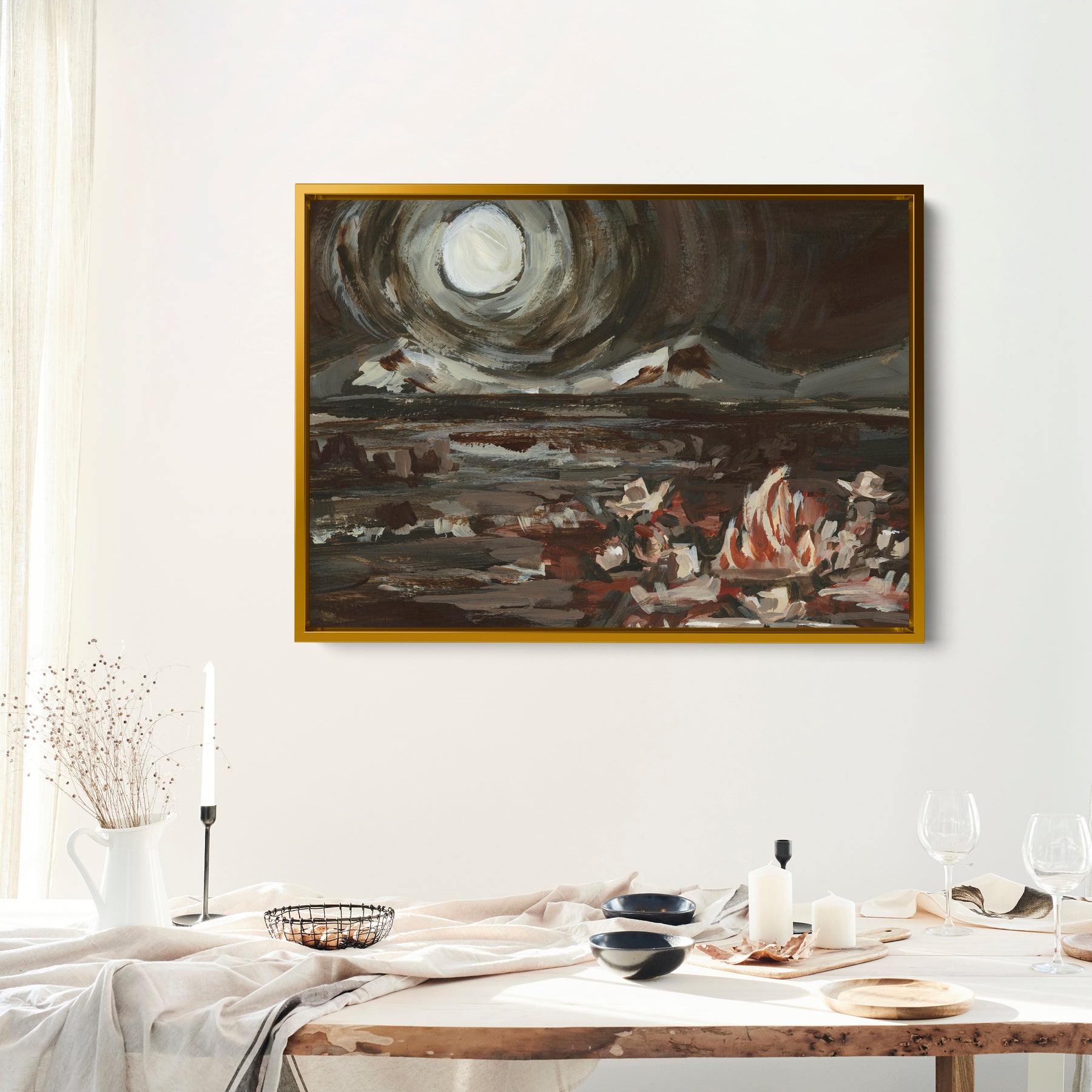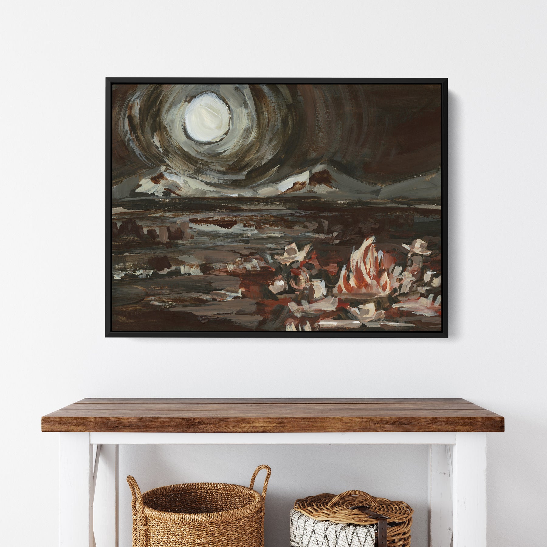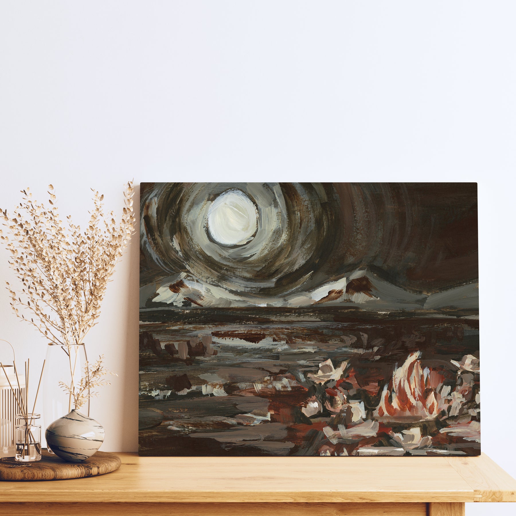 "Moonlite Valley" is a horizontally oriented western landscape painting in tones of burnt sienna, rich brown, taupe, ivory and muted umber.