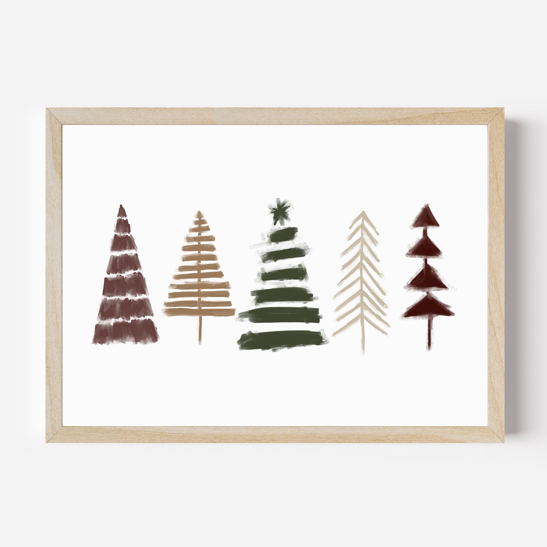 Embrace the peace and joy of the holiday season with our “Christmas Hope” series of artwork. Filled with moody landscape illustrations, pine tree motifs and nativity scenes, this collection brings a modern take on holiday style to your home decor. “Nordic Christmas Trees, No. 1" is a horizontally oriented Christmas tree illustration in tones of beige, cream, dark green, rust and muted red on a white background.