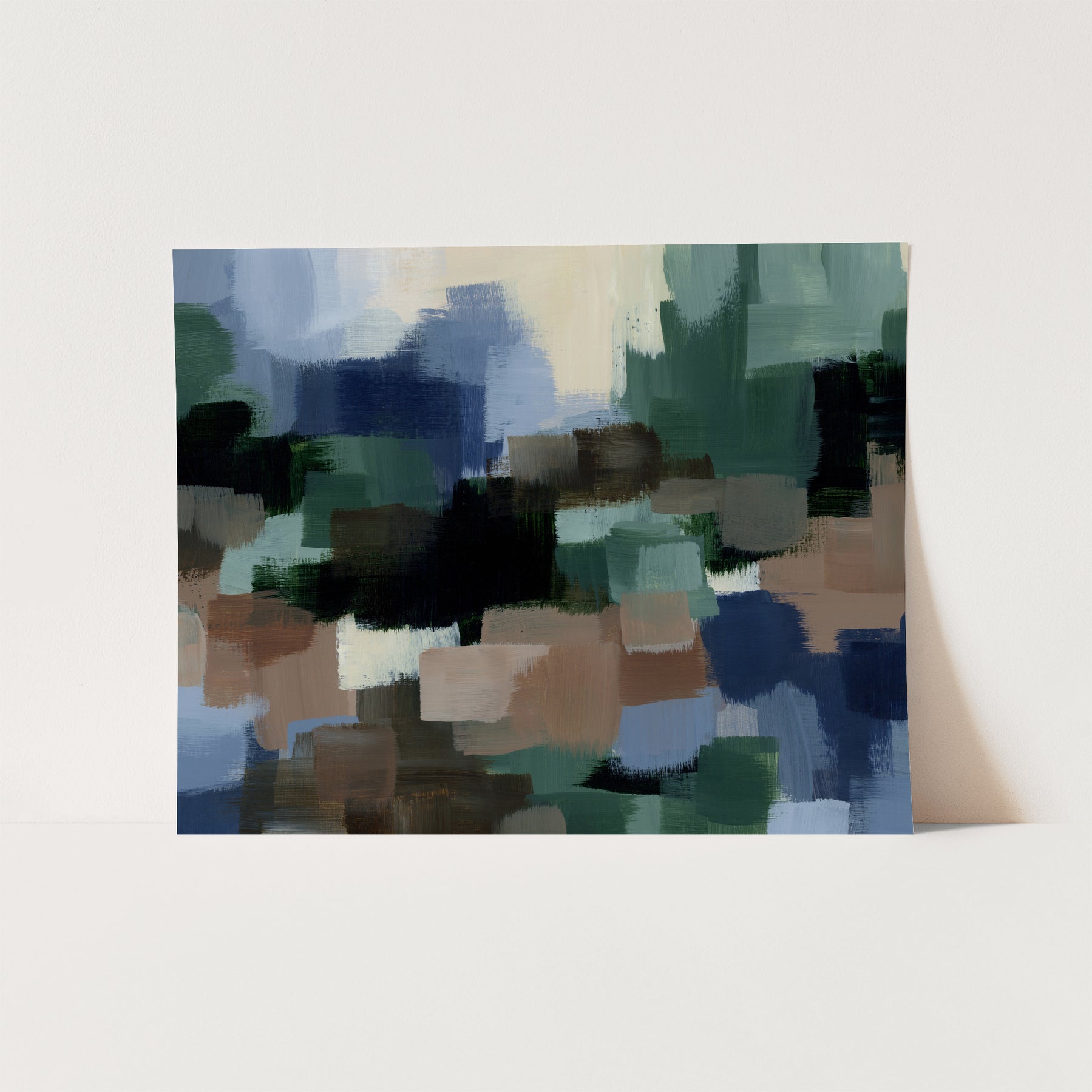 "Off the Path" is a landscape/horizontally oriented abstract painting in tones of muted umber, green, blue, beige and brown.