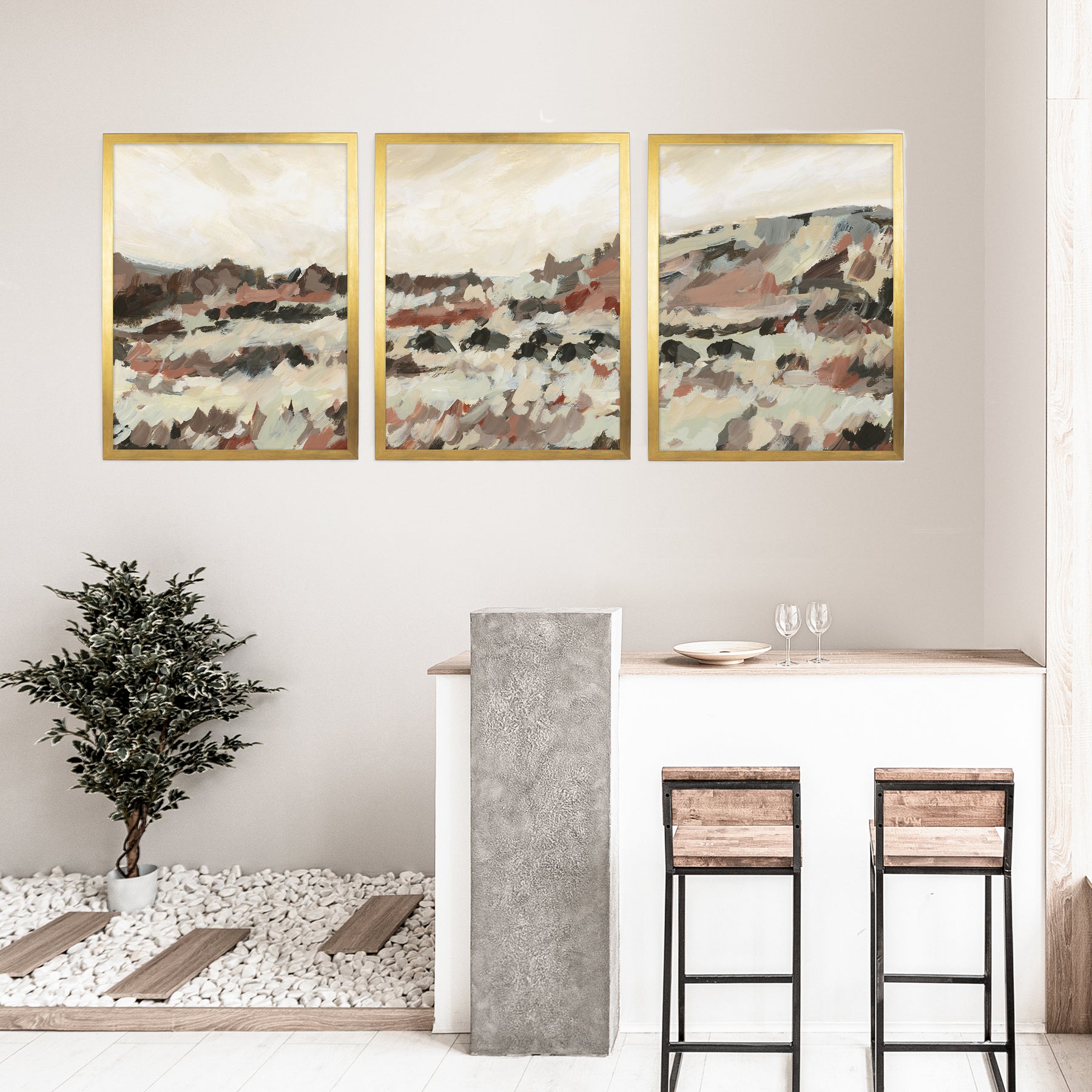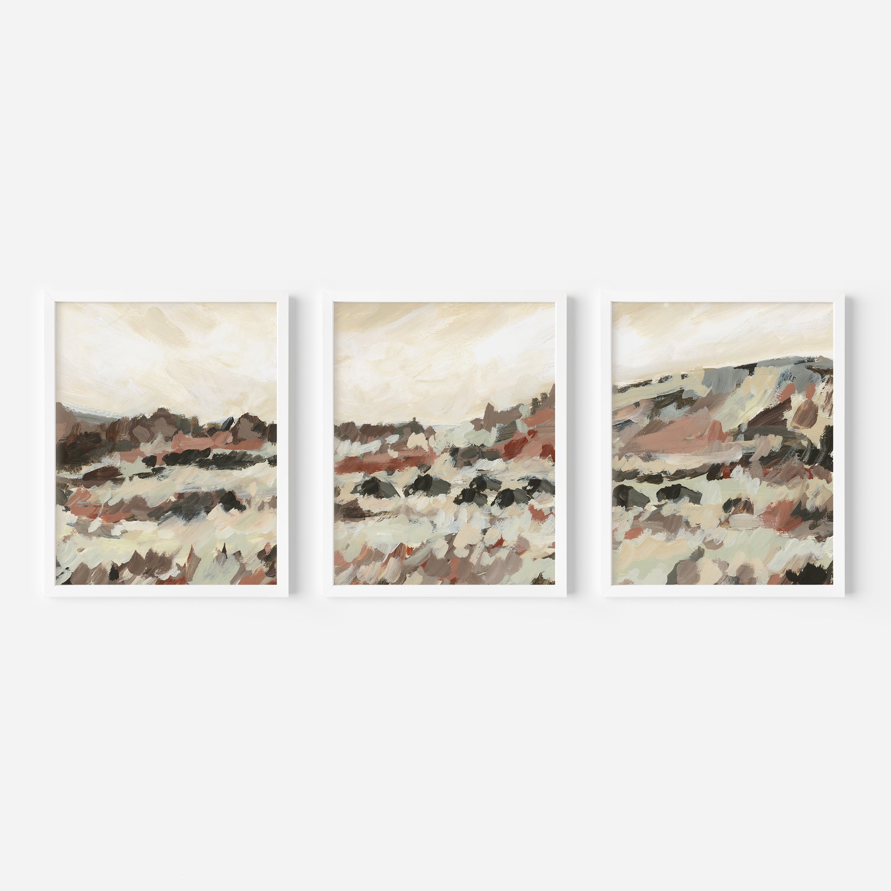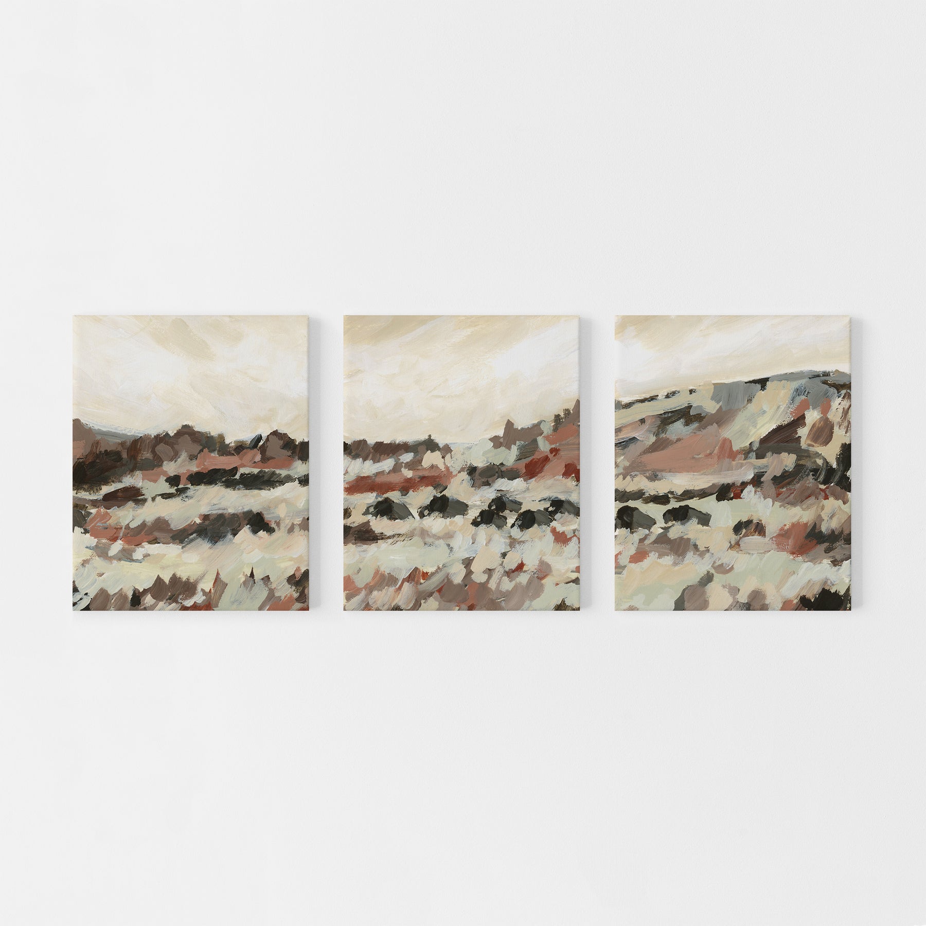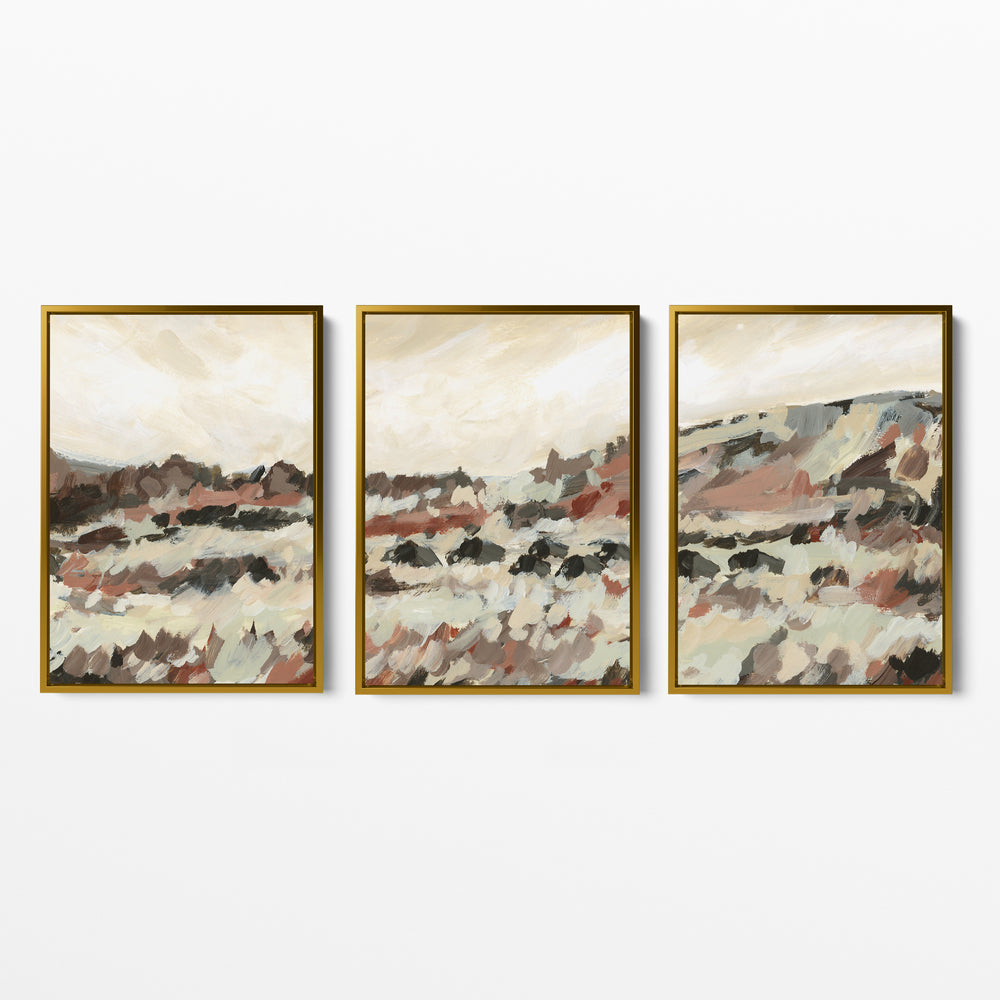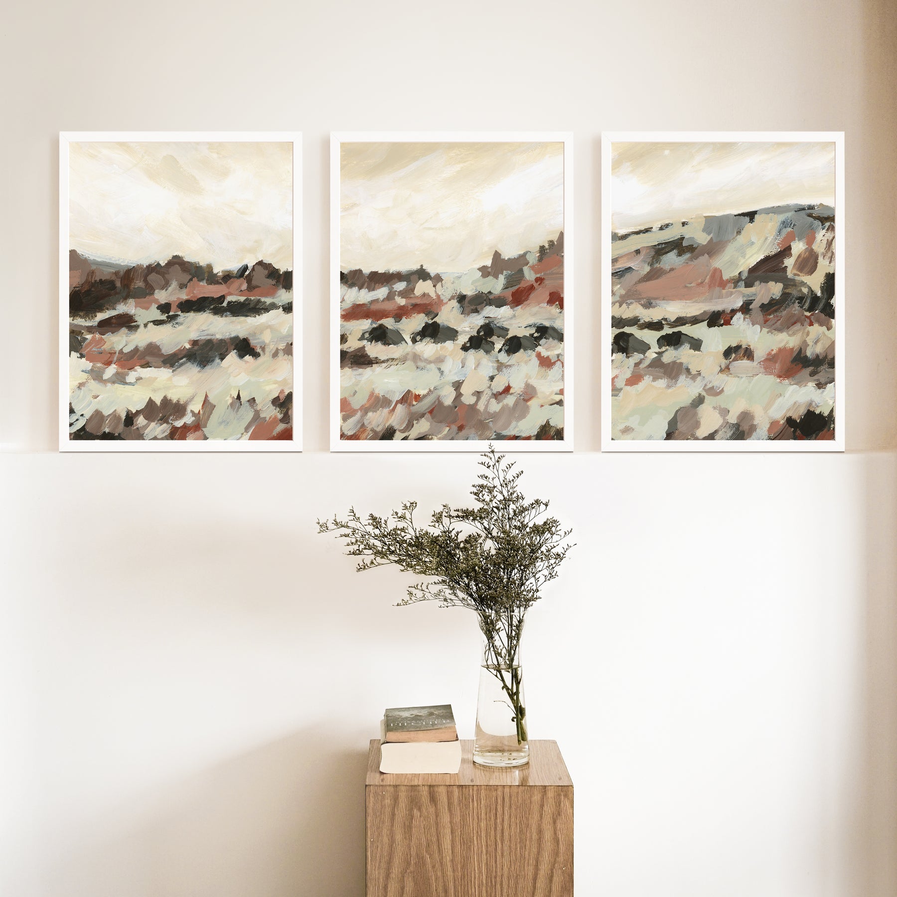 "Over the Range Triptych" is a vertically oriented three-piece western landscape painting set in tones of burnt sienna, rich brown, taupe, ivory and muted umber.