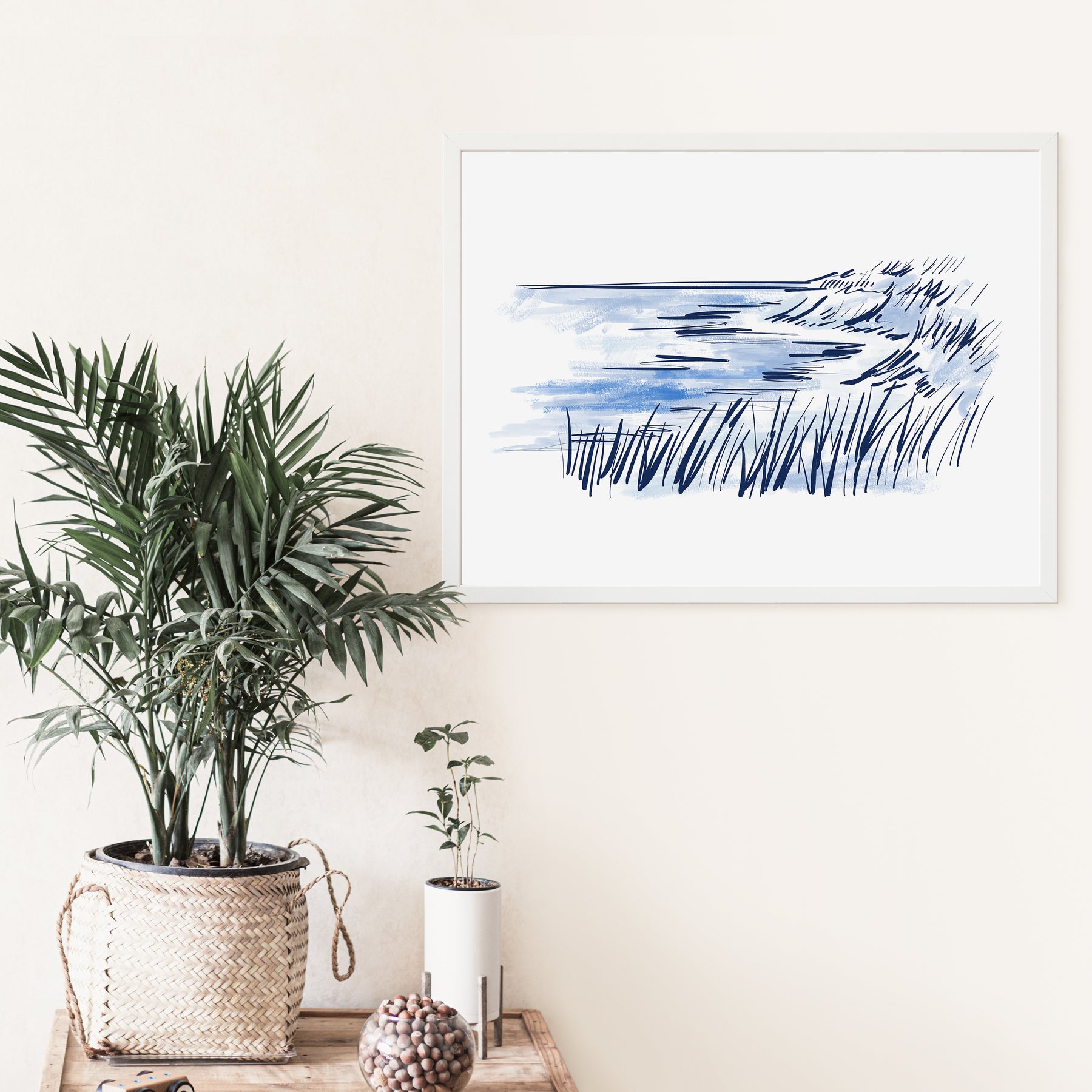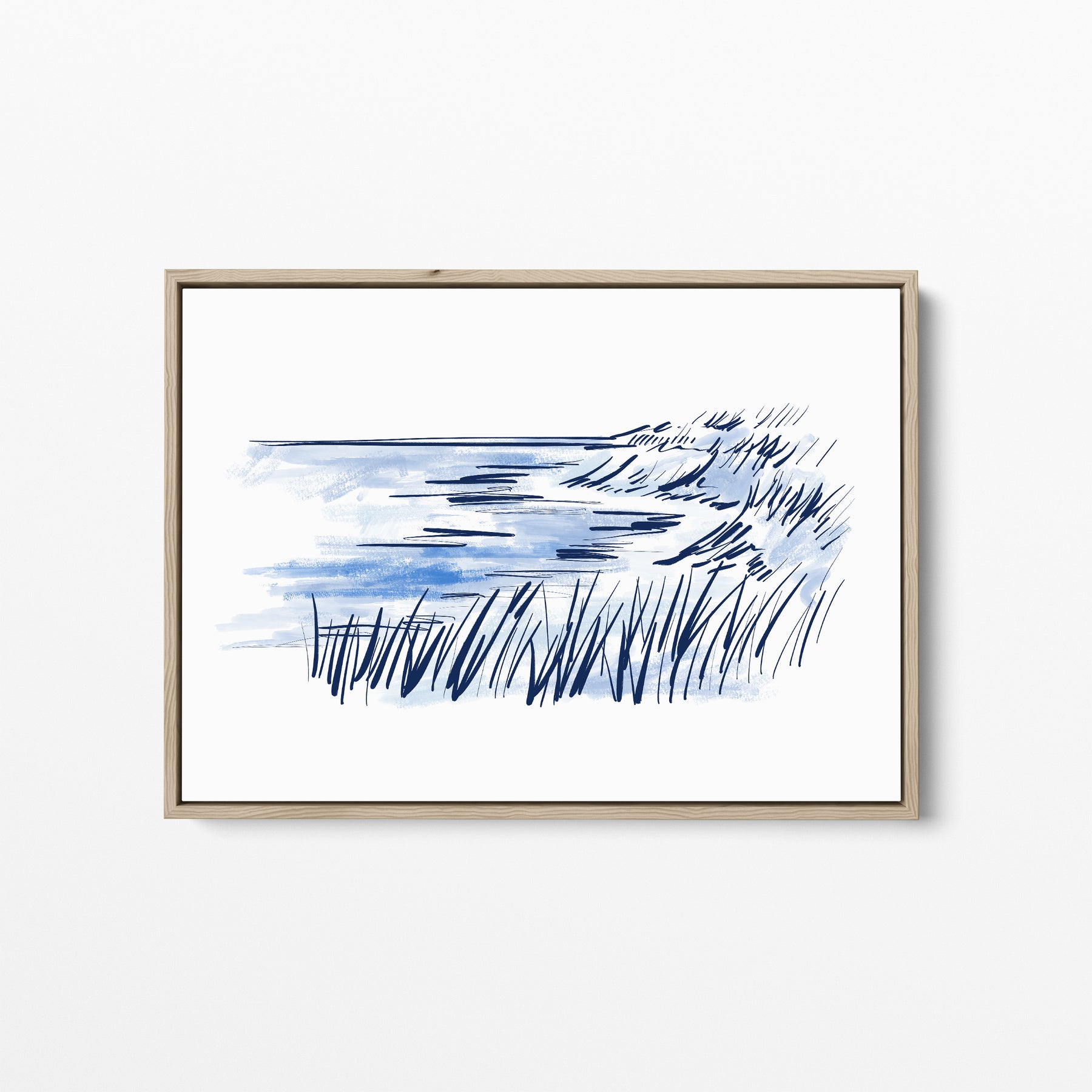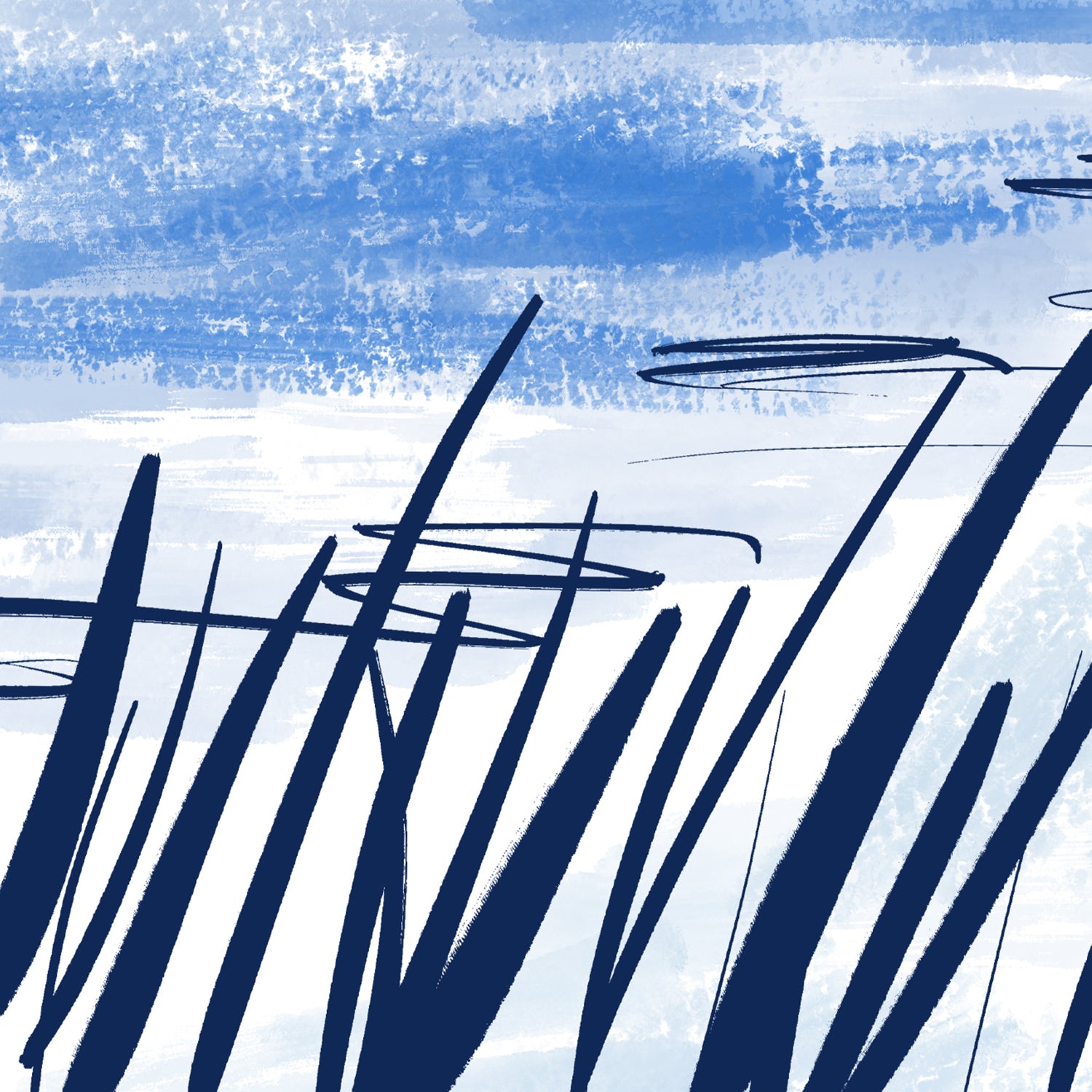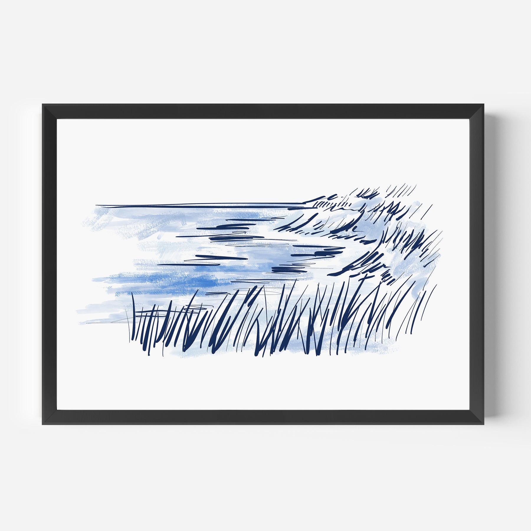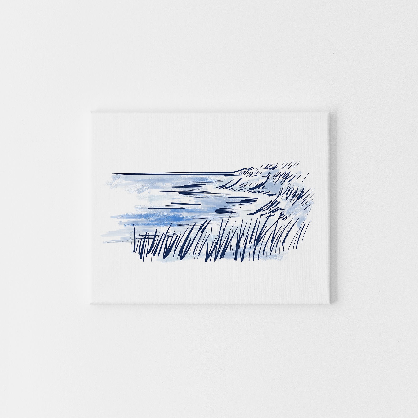 "Past the Dunes" is horizontally oriented nautically inspired coastal landscape illustration in tones of blue on a white background.
