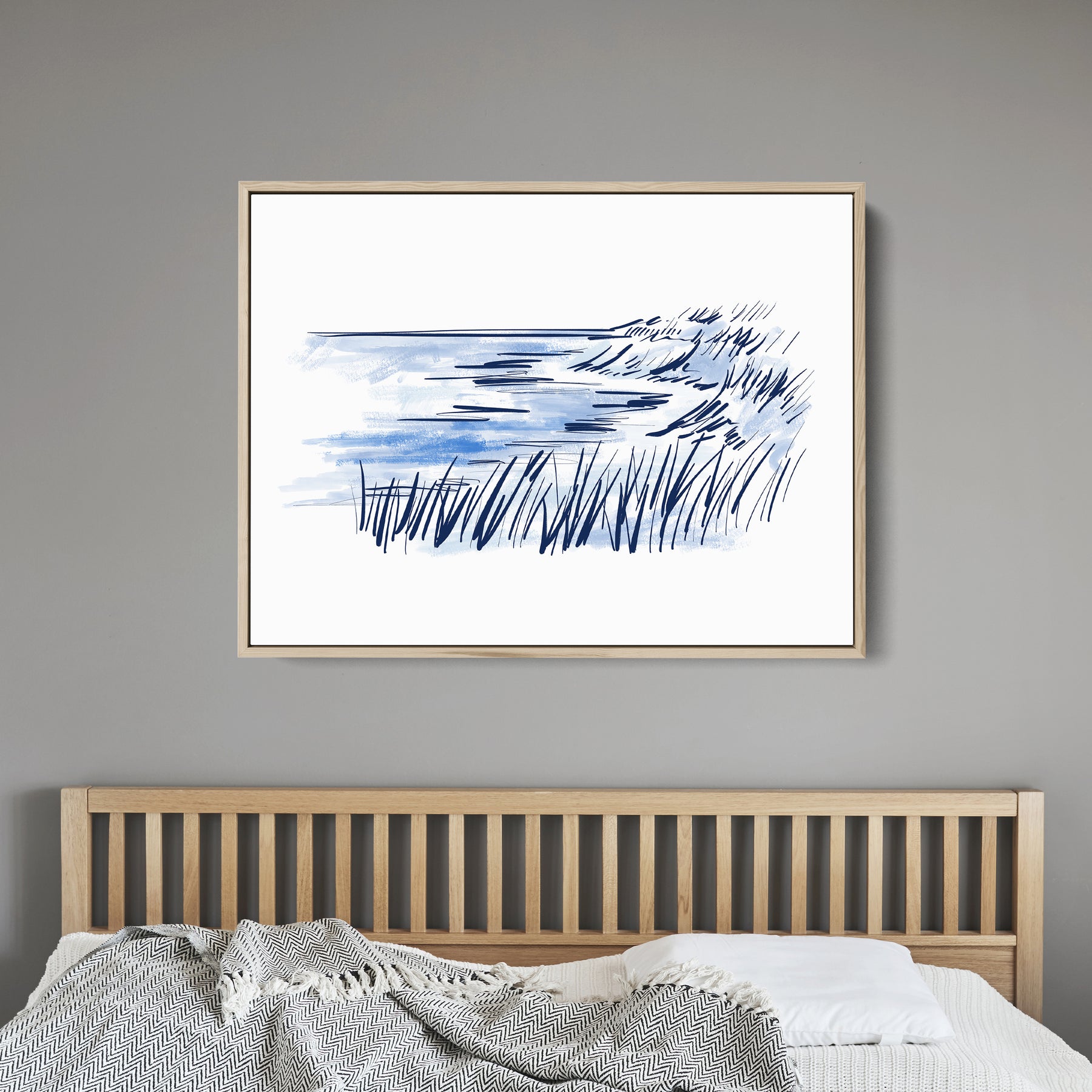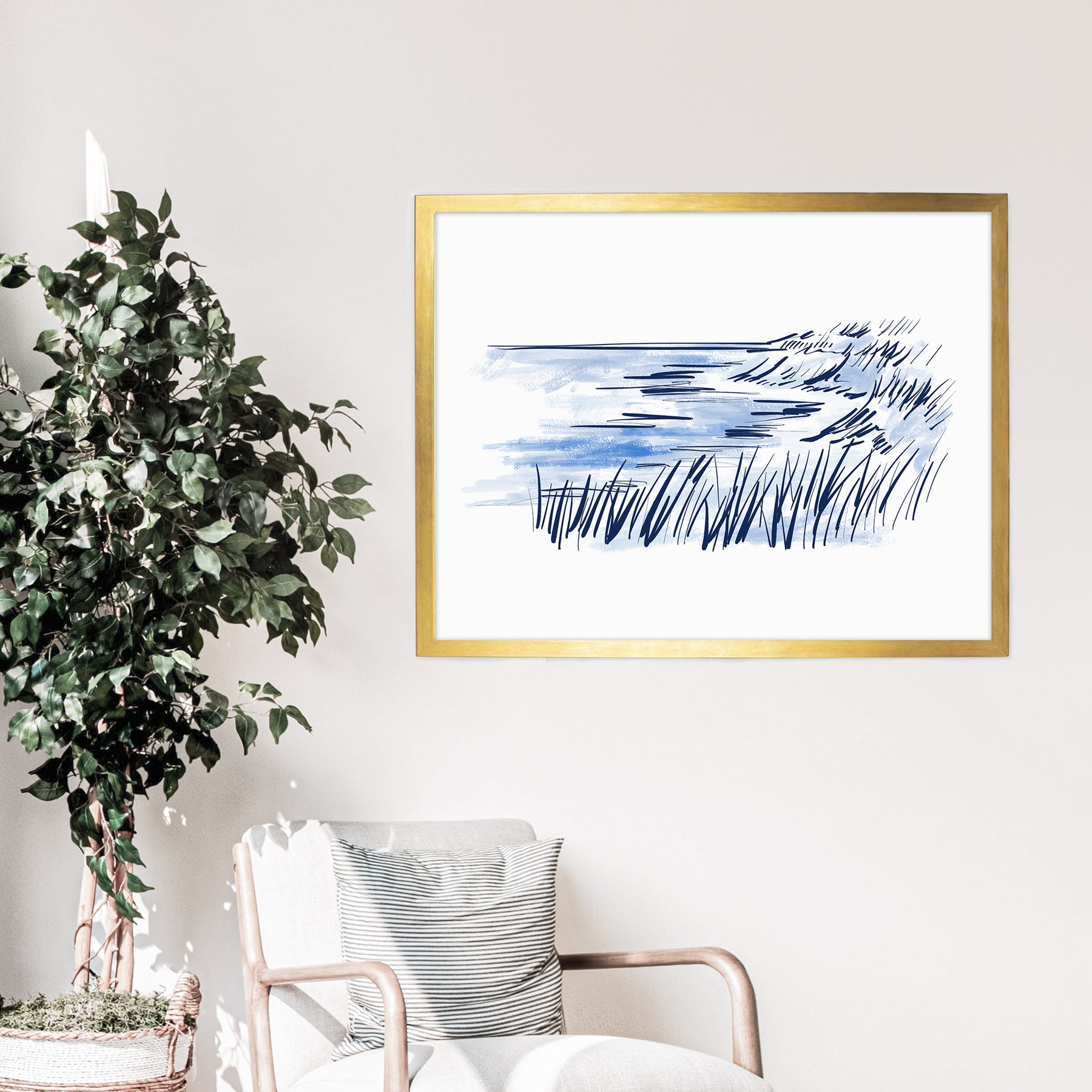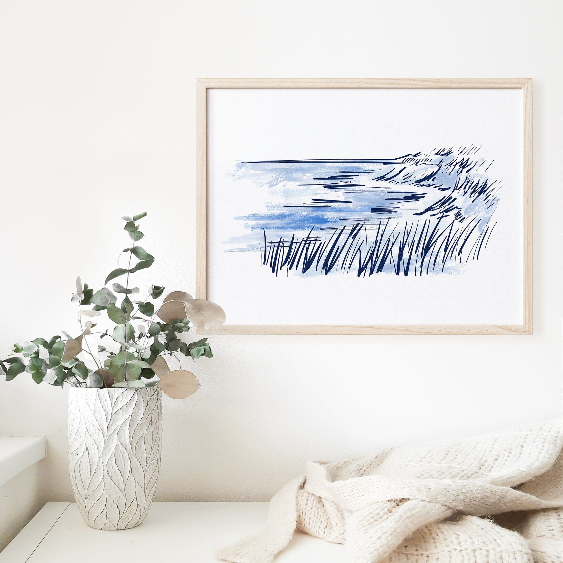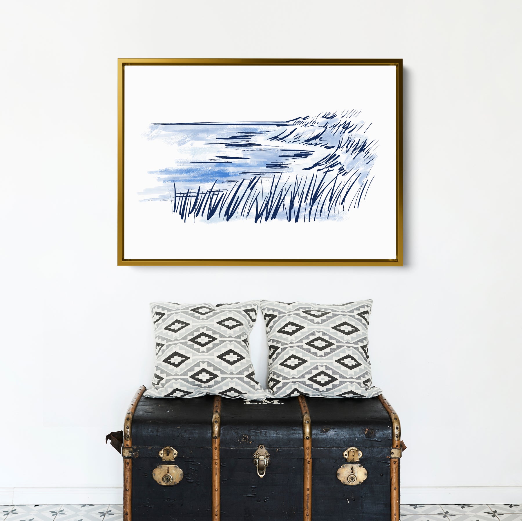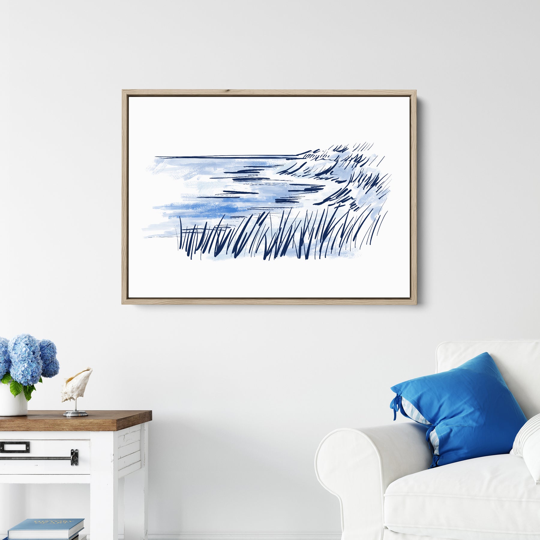 "Past the Dunes" is horizontally oriented nautically inspired coastal landscape illustration in tones of blue on a white background.