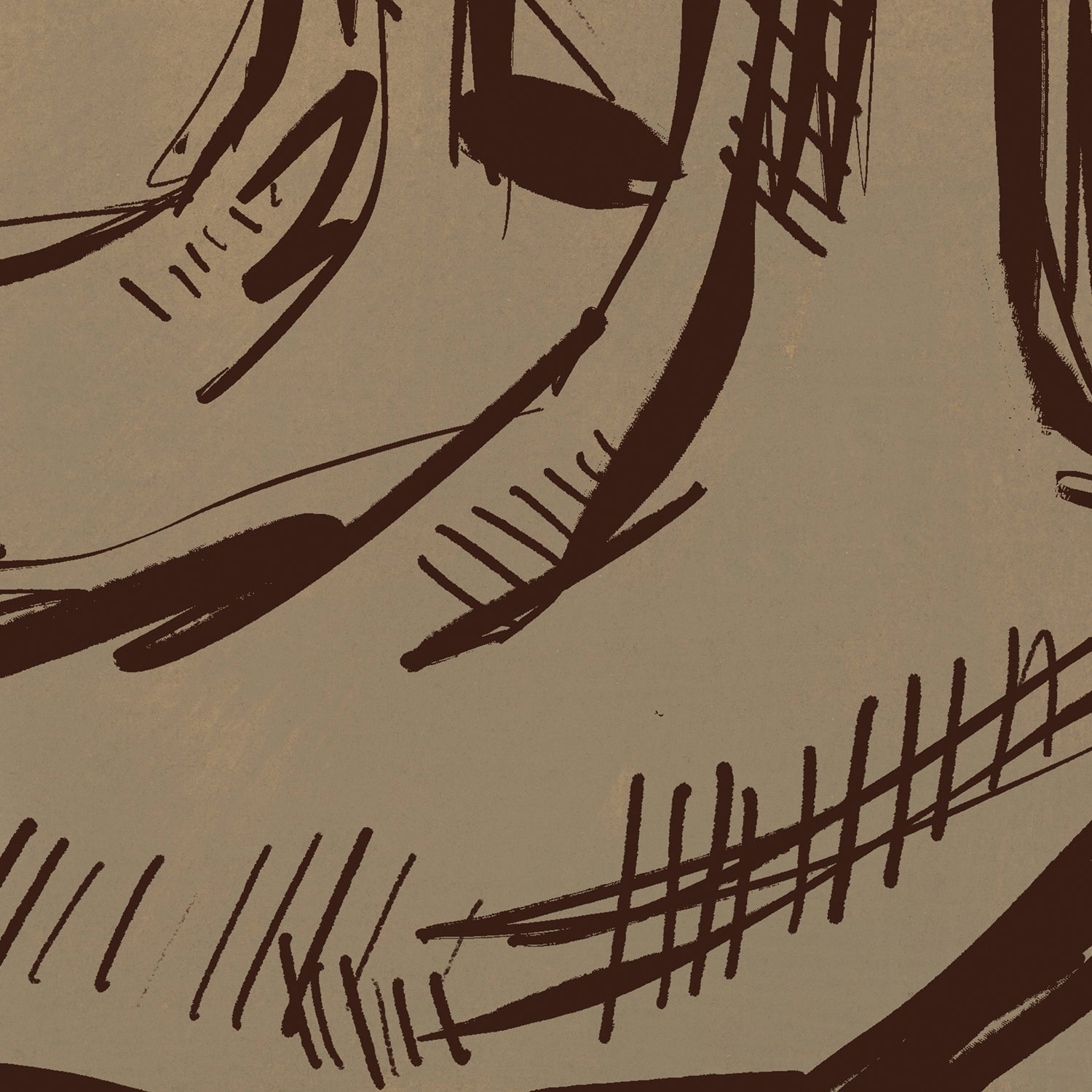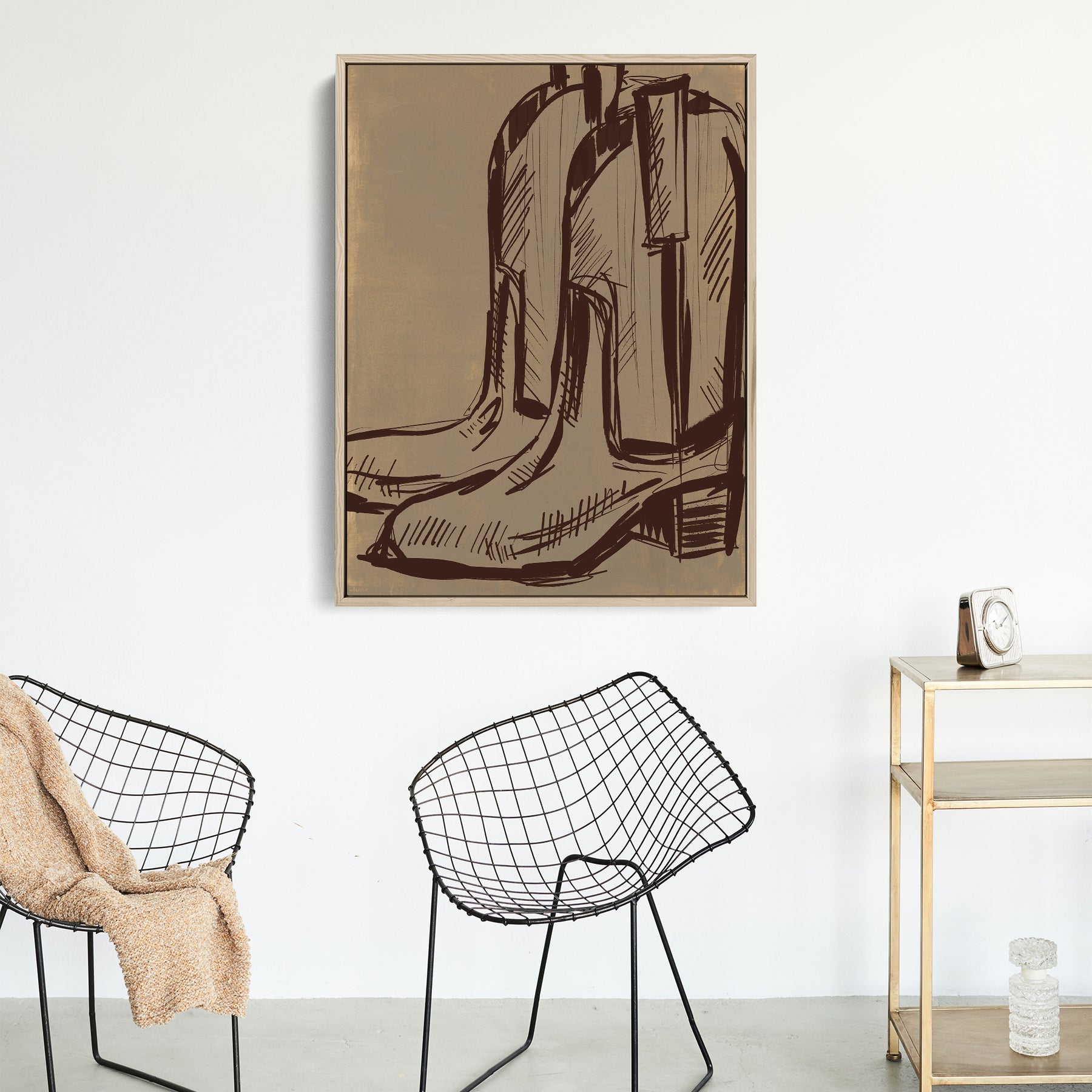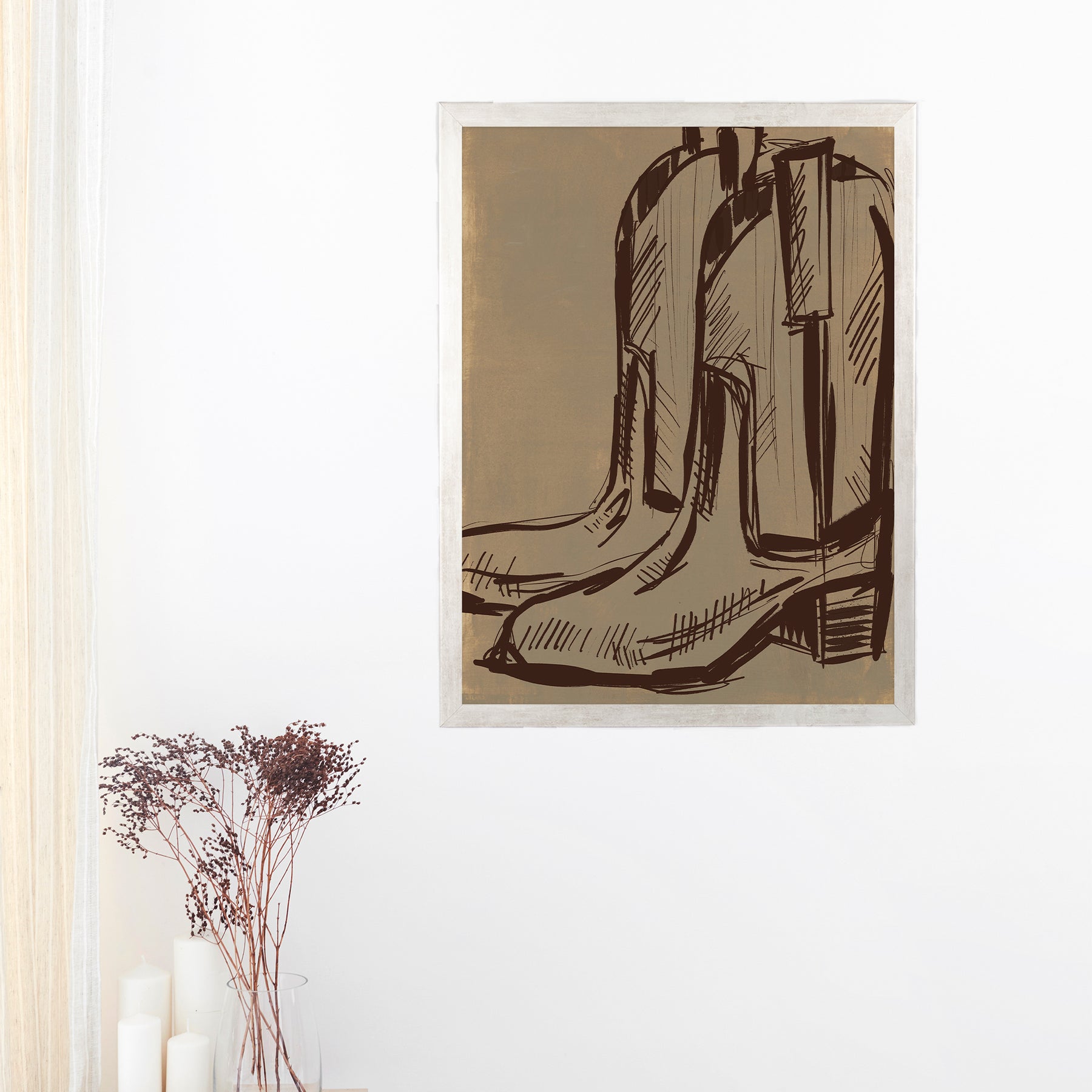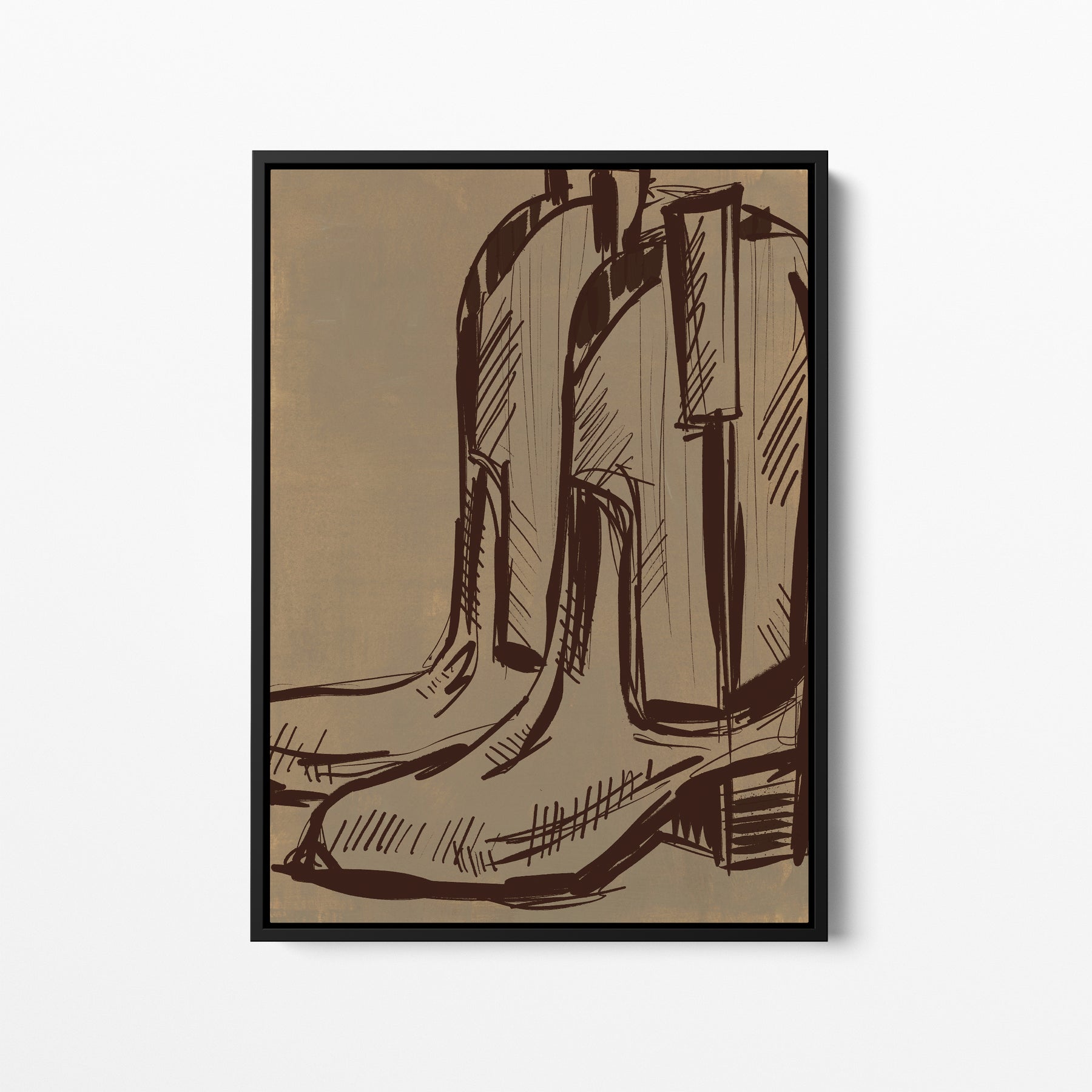 "Rustic Cowboy Boots" is a vertically oriented western cowboy boots illustration in dark brown on a textured/painted neutral camel toned background.
