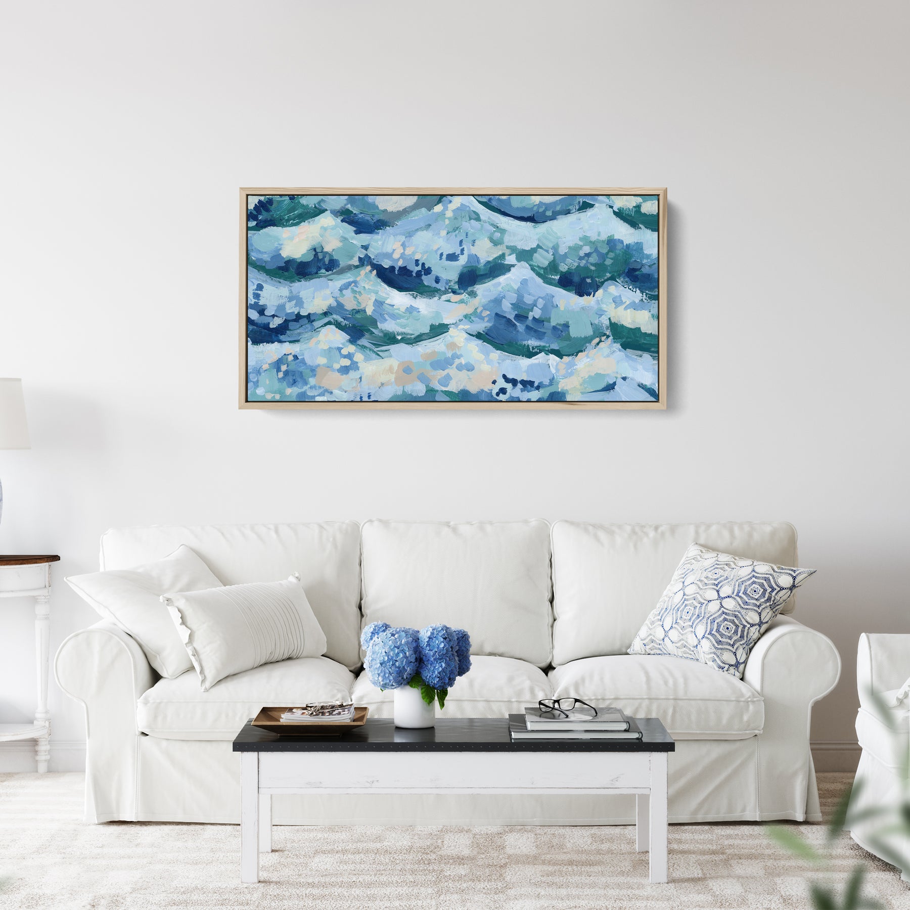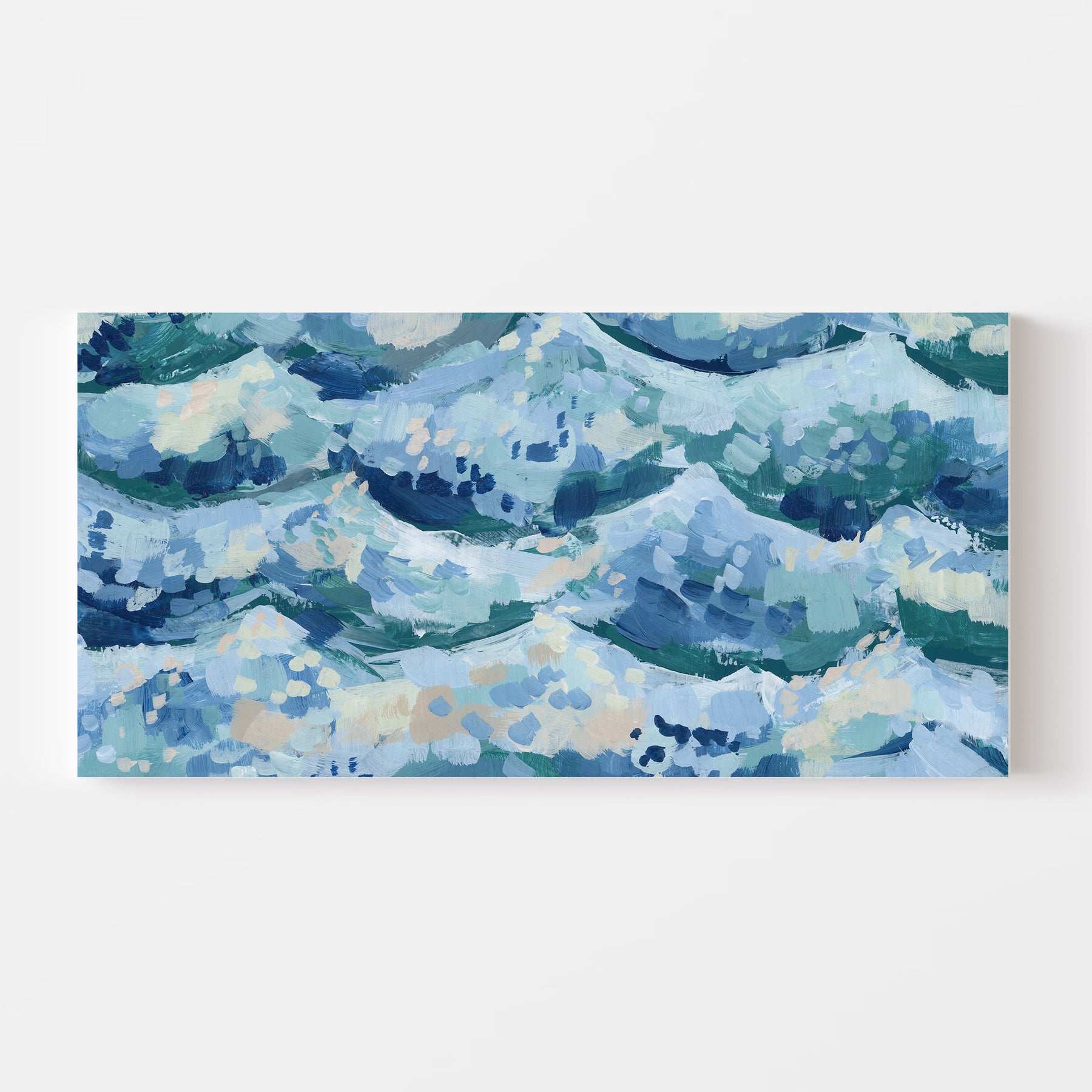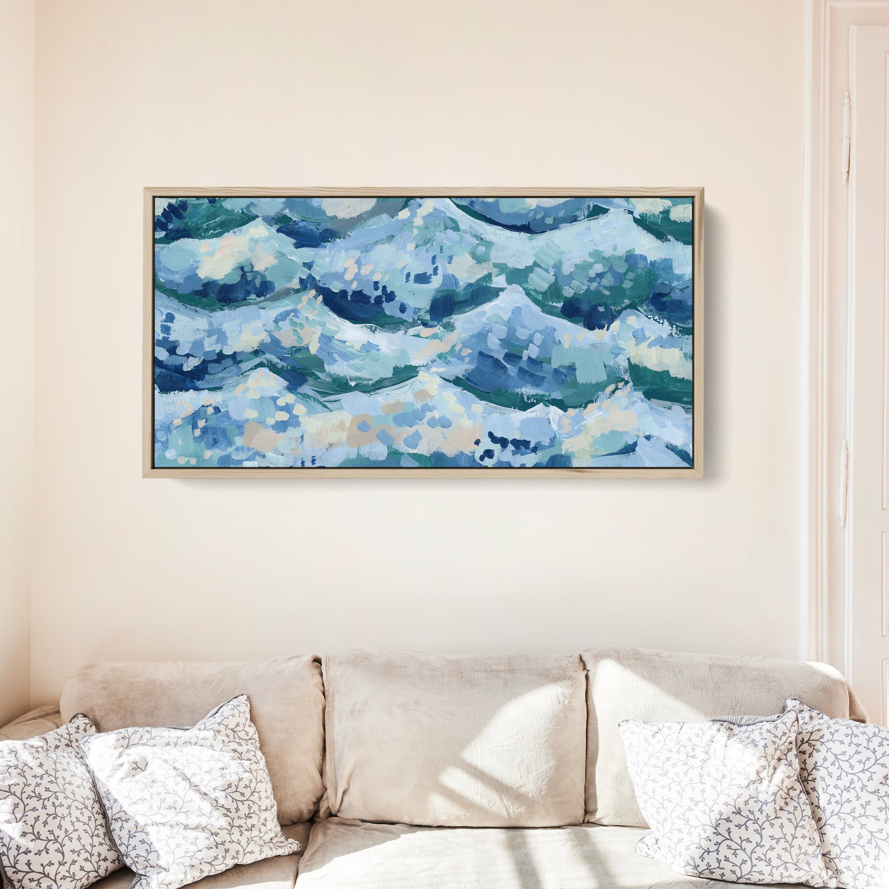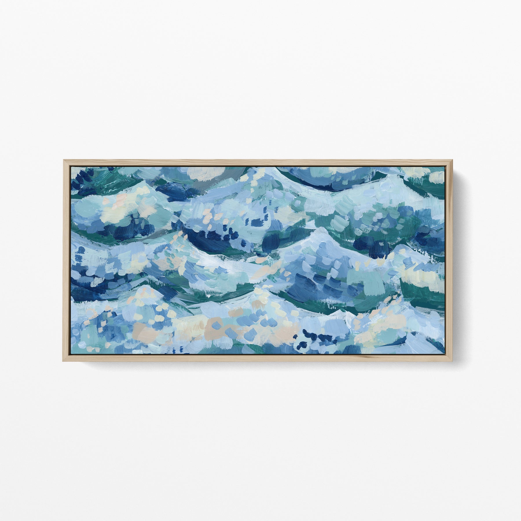 "Sea Chop" is a horizontal panoramic ocean landscape painting in tones of blue and turquoise with hints of beige, pink and green.