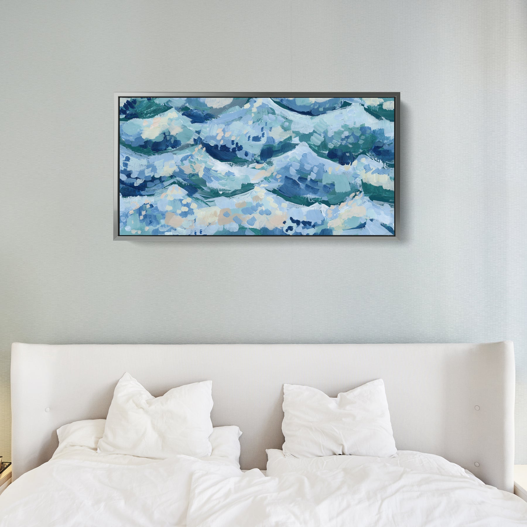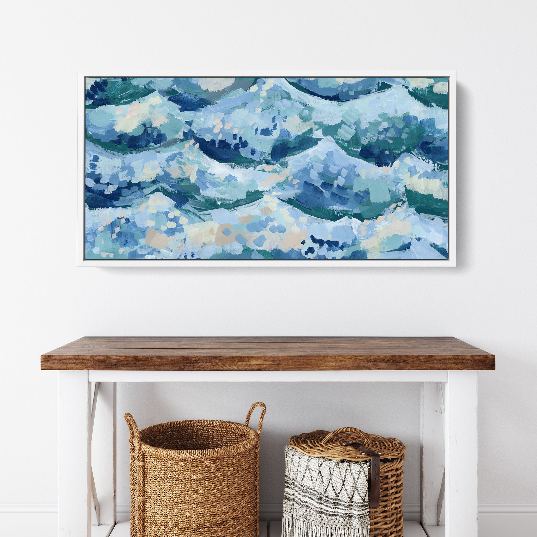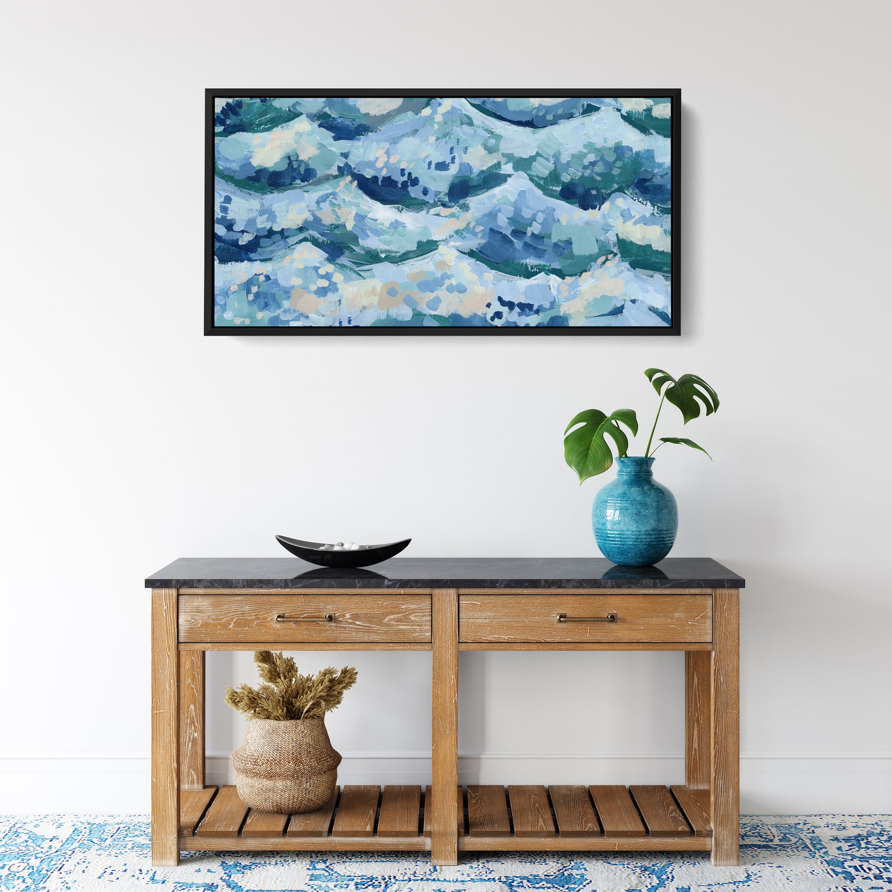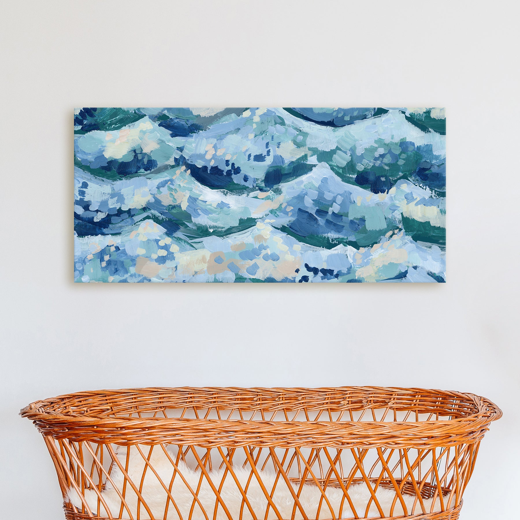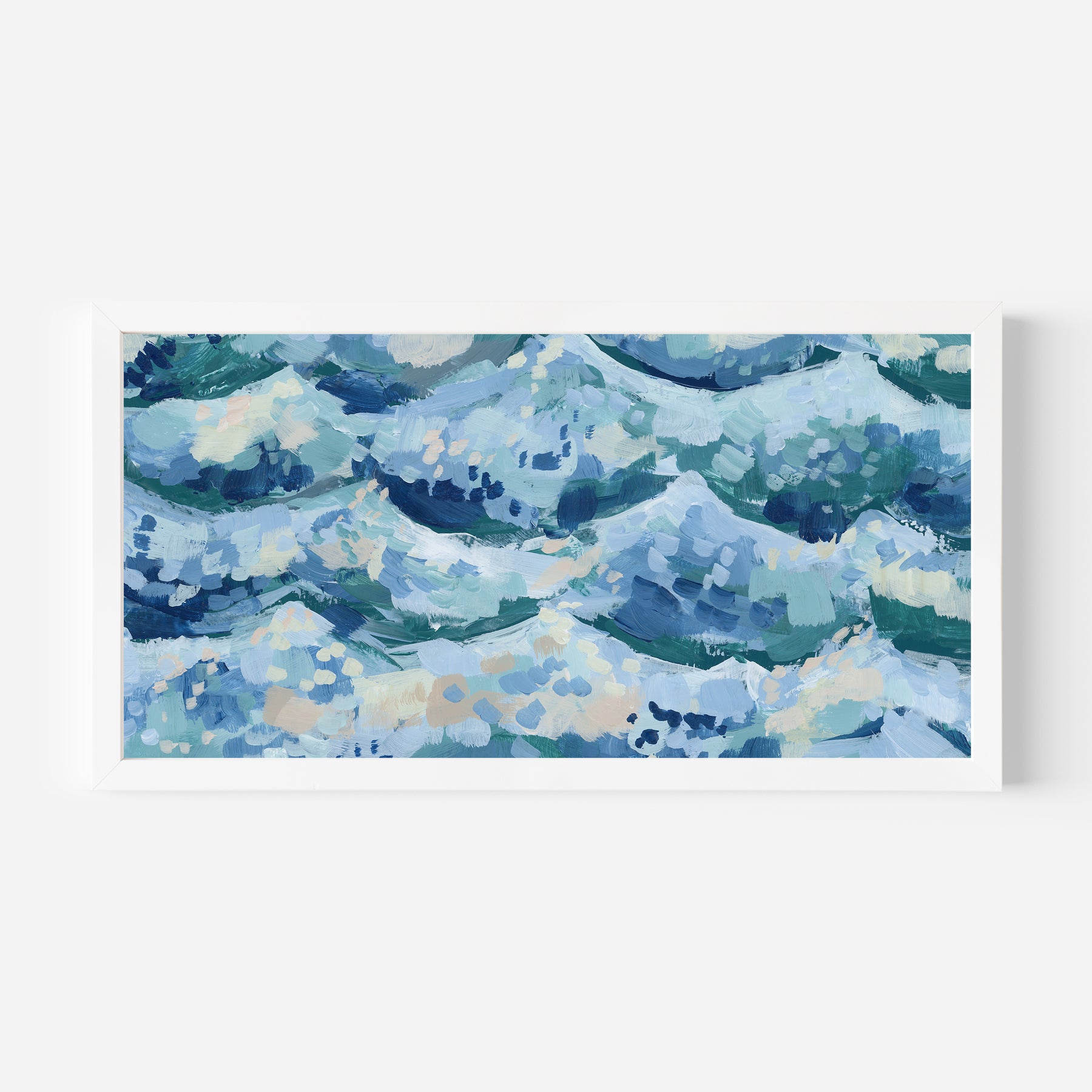 "Sea Chop" is a horizontal panoramic ocean landscape painting in tones of blue and turquoise with hints of beige, pink and green.