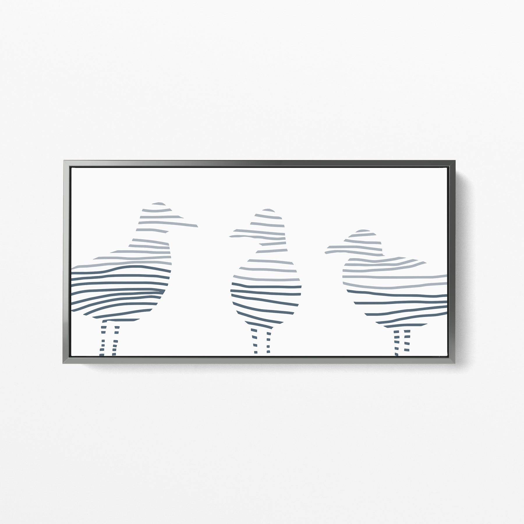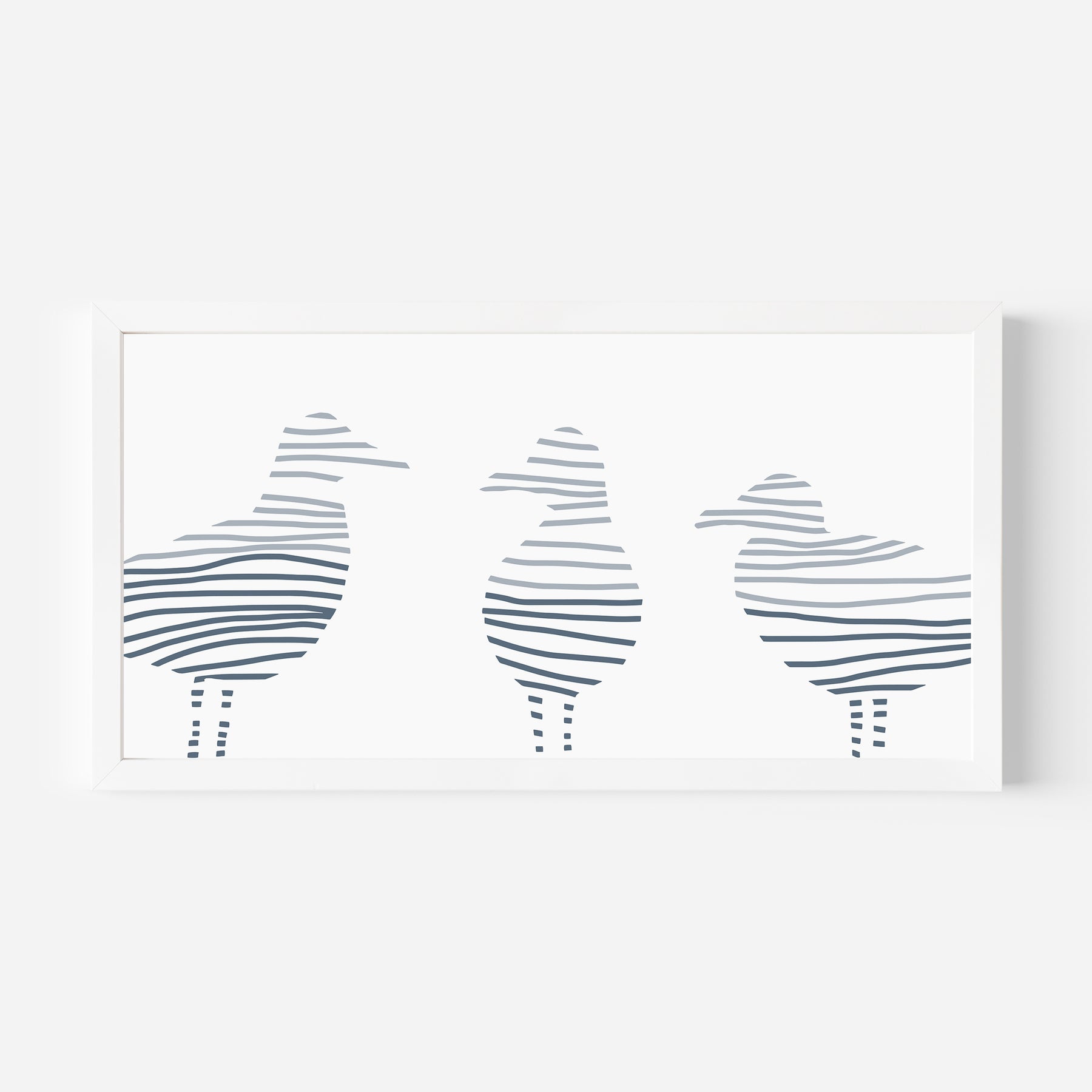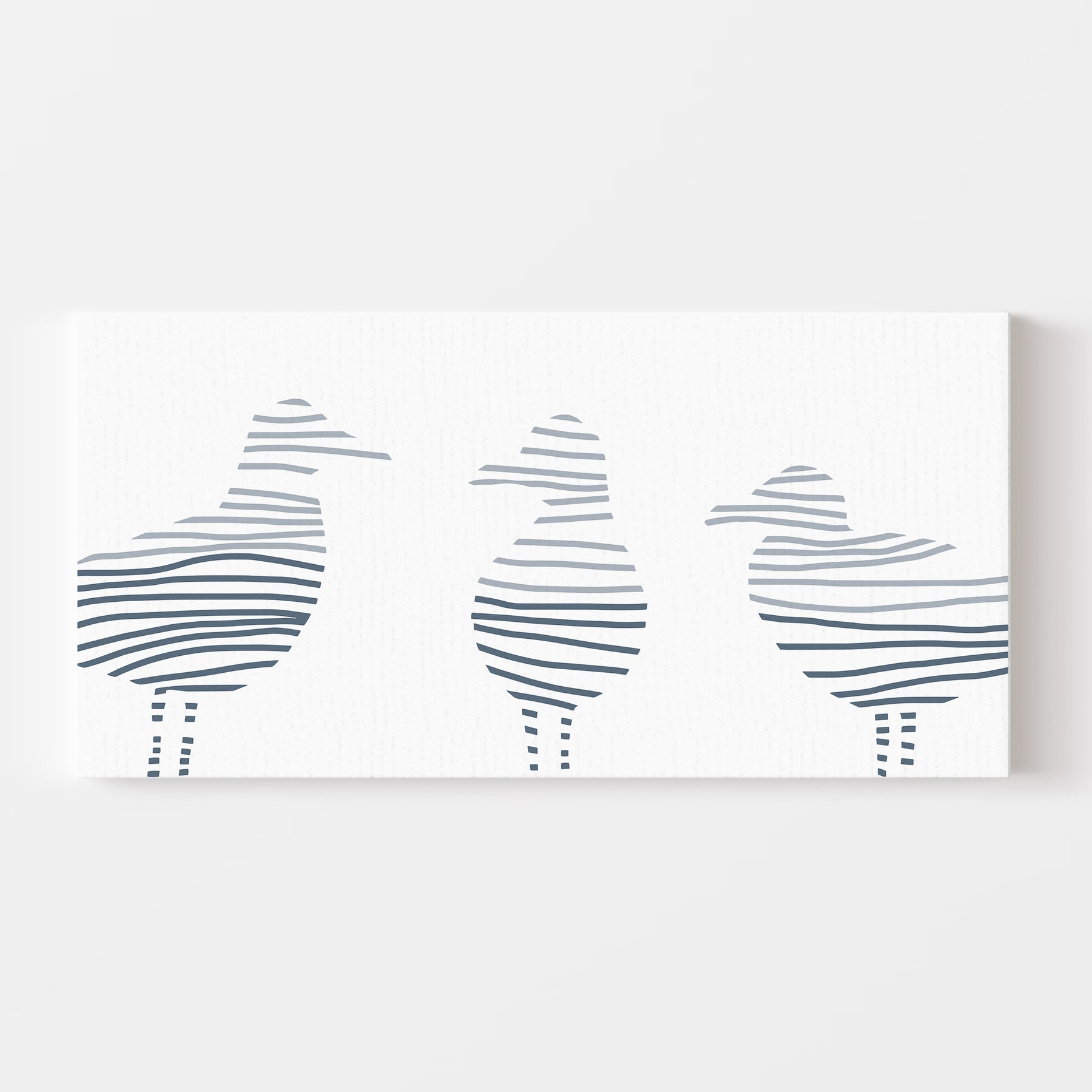 Dive deep into a world full of beautiful abstract paintings, landscapes and sea botanicals with our collection, Montauk Tides. Inspired by the beach town of Montauk, New York, this series is the perfect way to add some cool beach style and modern vibes to your home decor. This horizontal panoramic features a modern minimalist three-toned slate blue sea gull illustration on a white background.