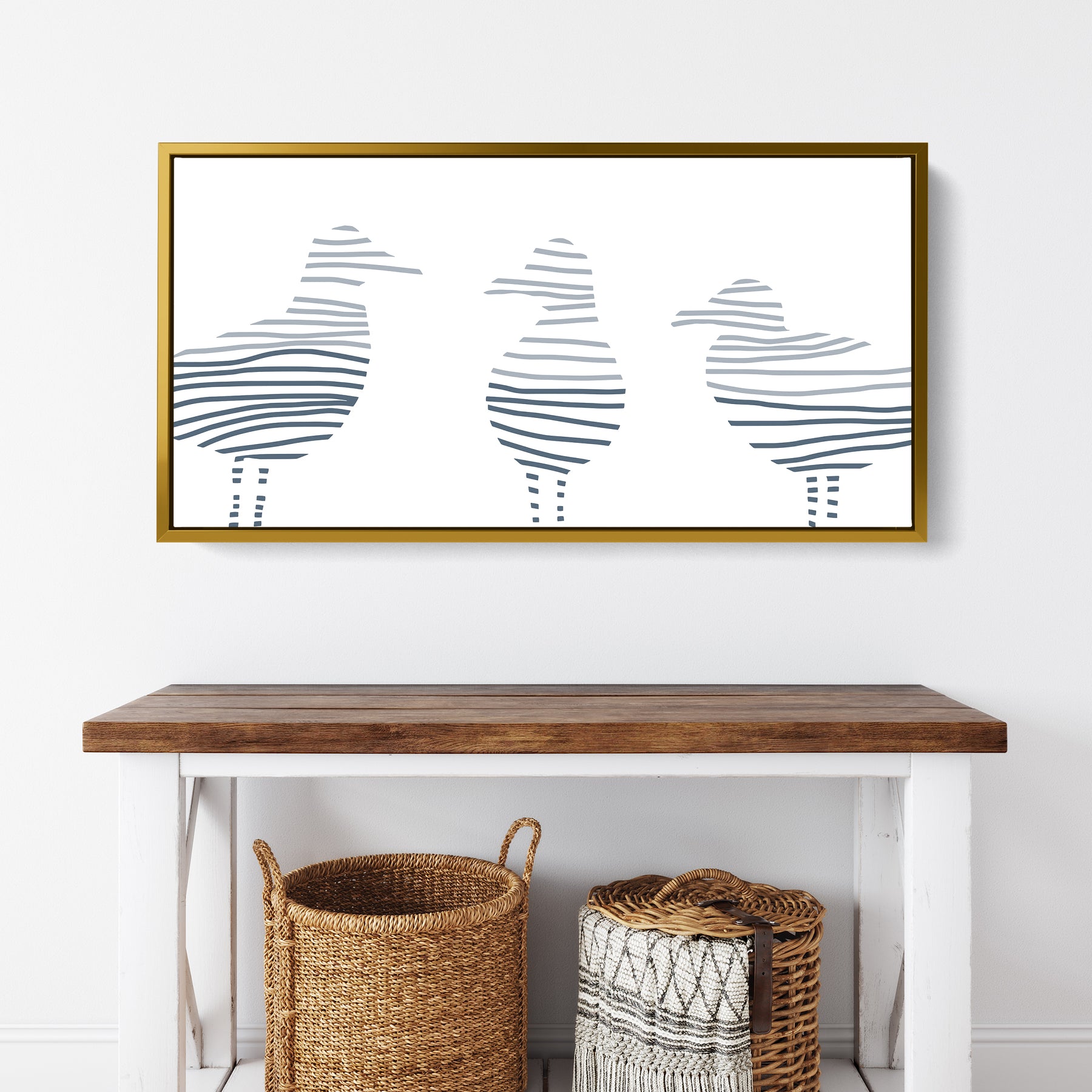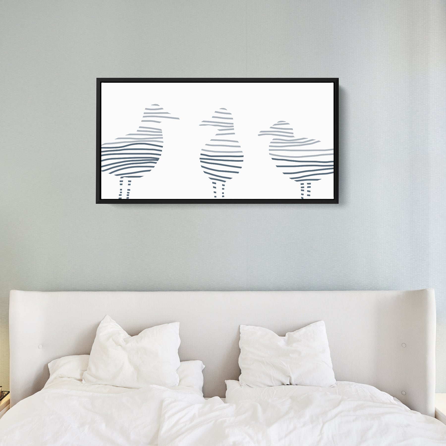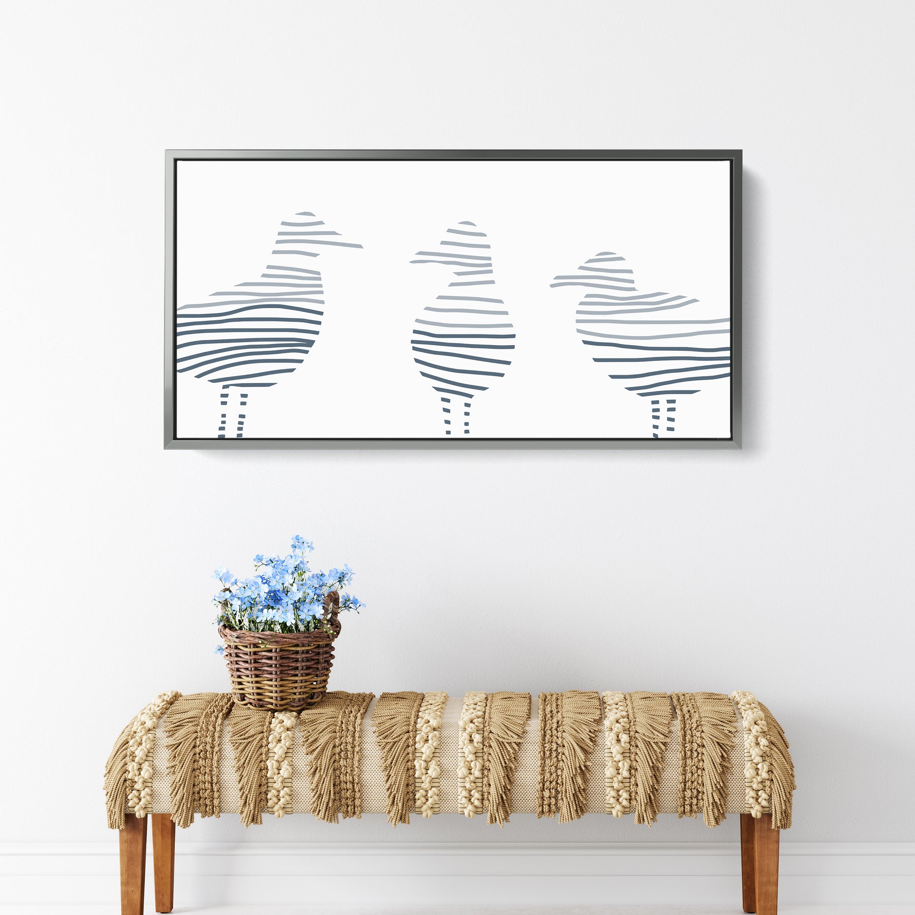 Dive deep into a world full of beautiful abstract paintings, landscapes and sea botanicals with our collection, Montauk Tides. Inspired by the beach town of Montauk, New York, this series is the perfect way to add some cool beach style and modern vibes to your home decor. This horizontal panoramic features a modern minimalist three-toned slate blue sea gull illustration on a white background.