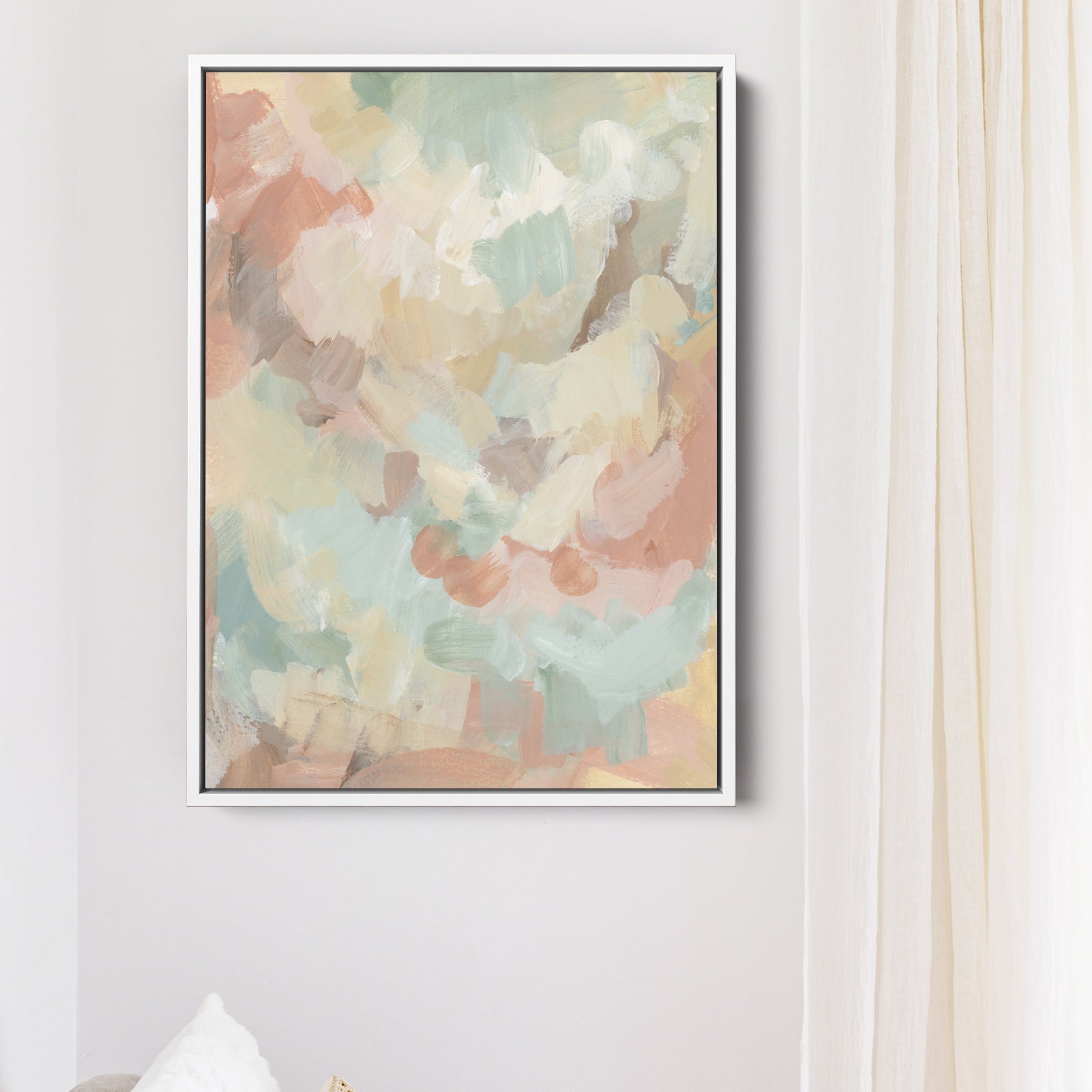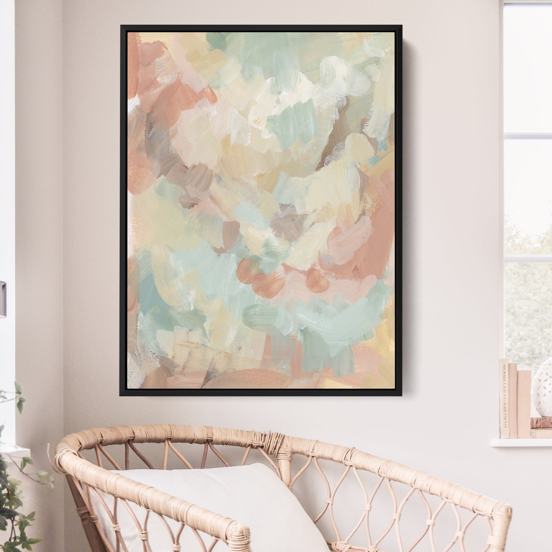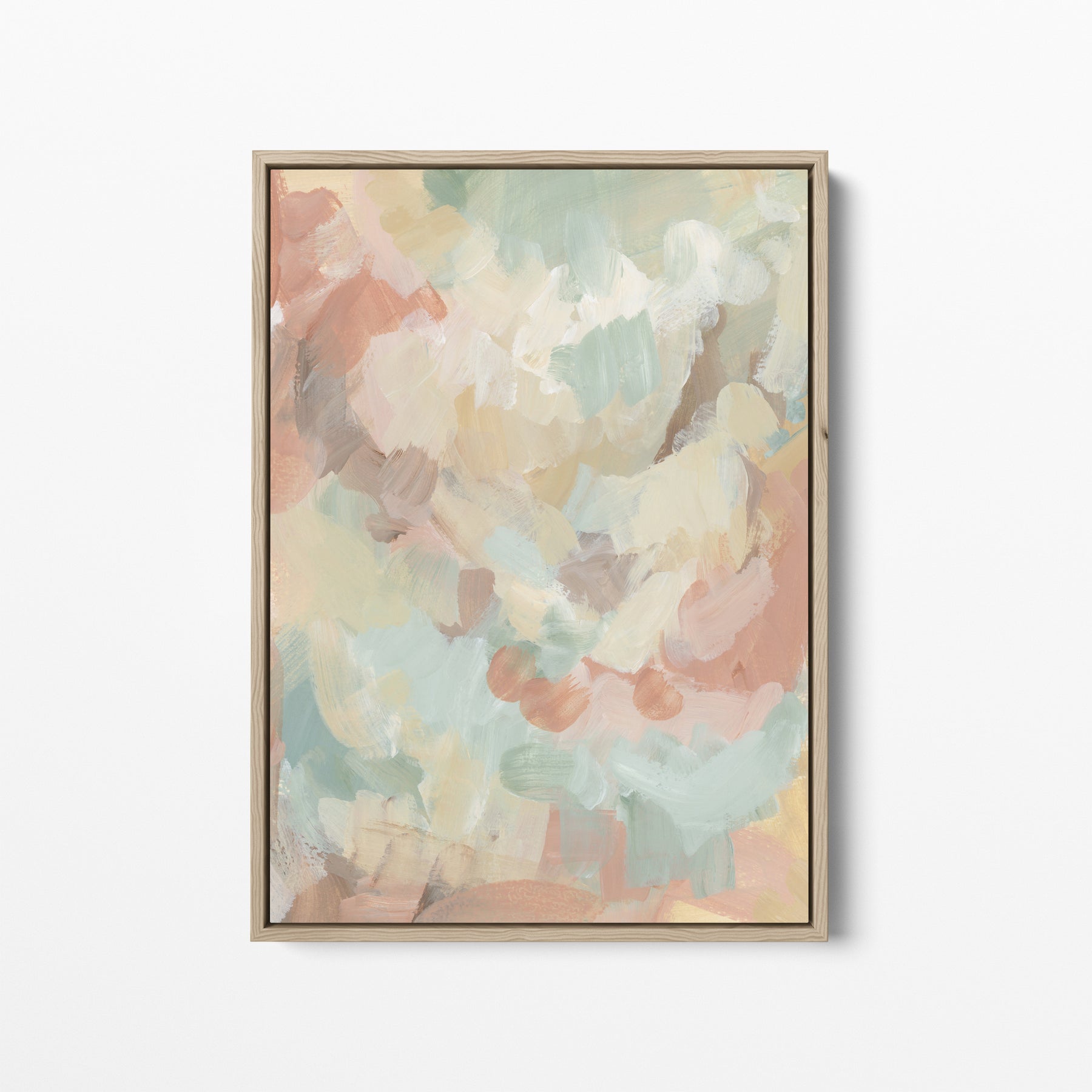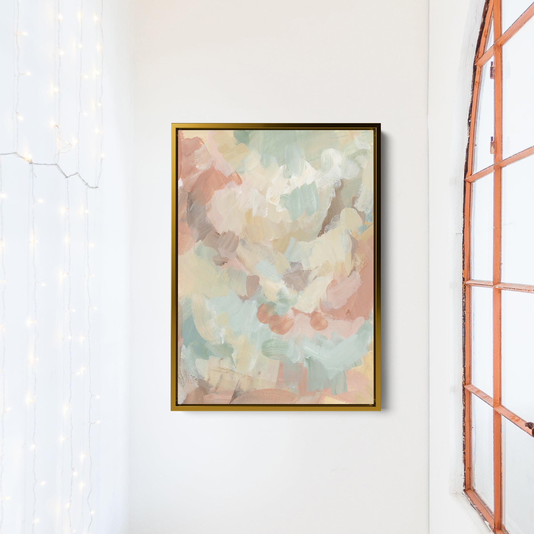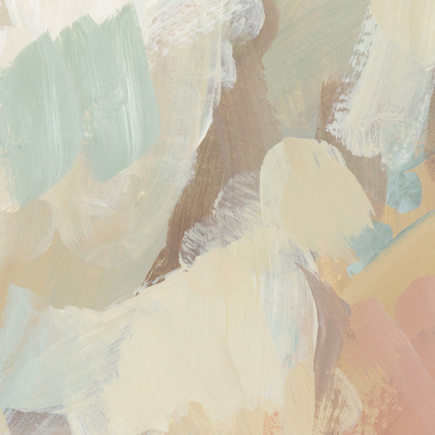 "Sunwash" is a vertically oriented abstract painting in tones of golden tan, dusty blush, sage green, warm beige, dark brown and terracotta.