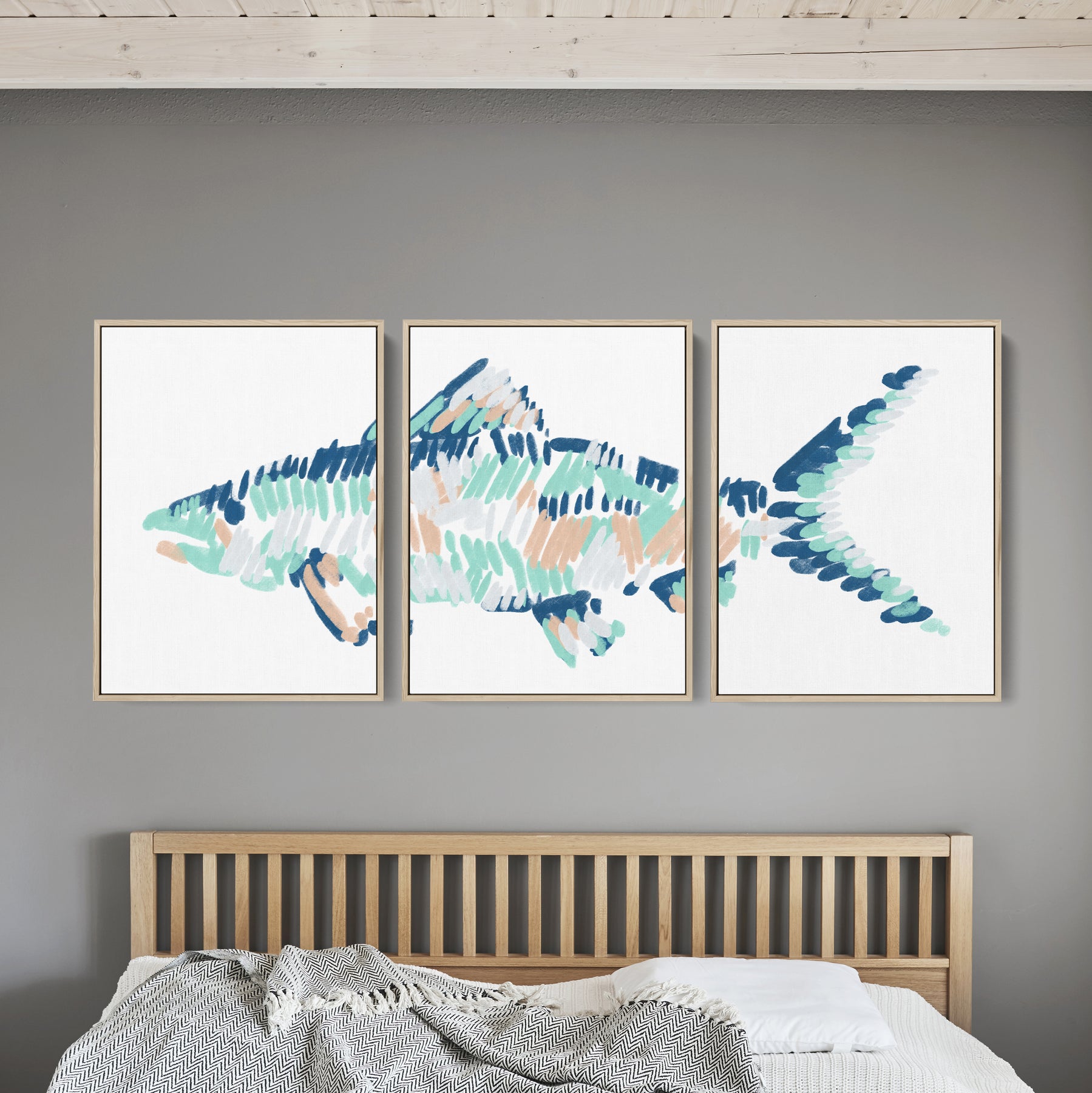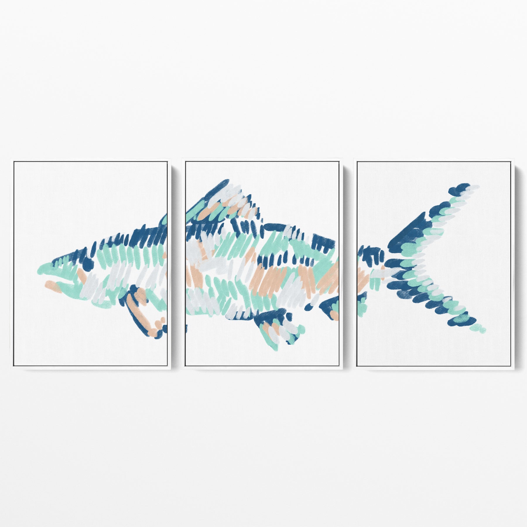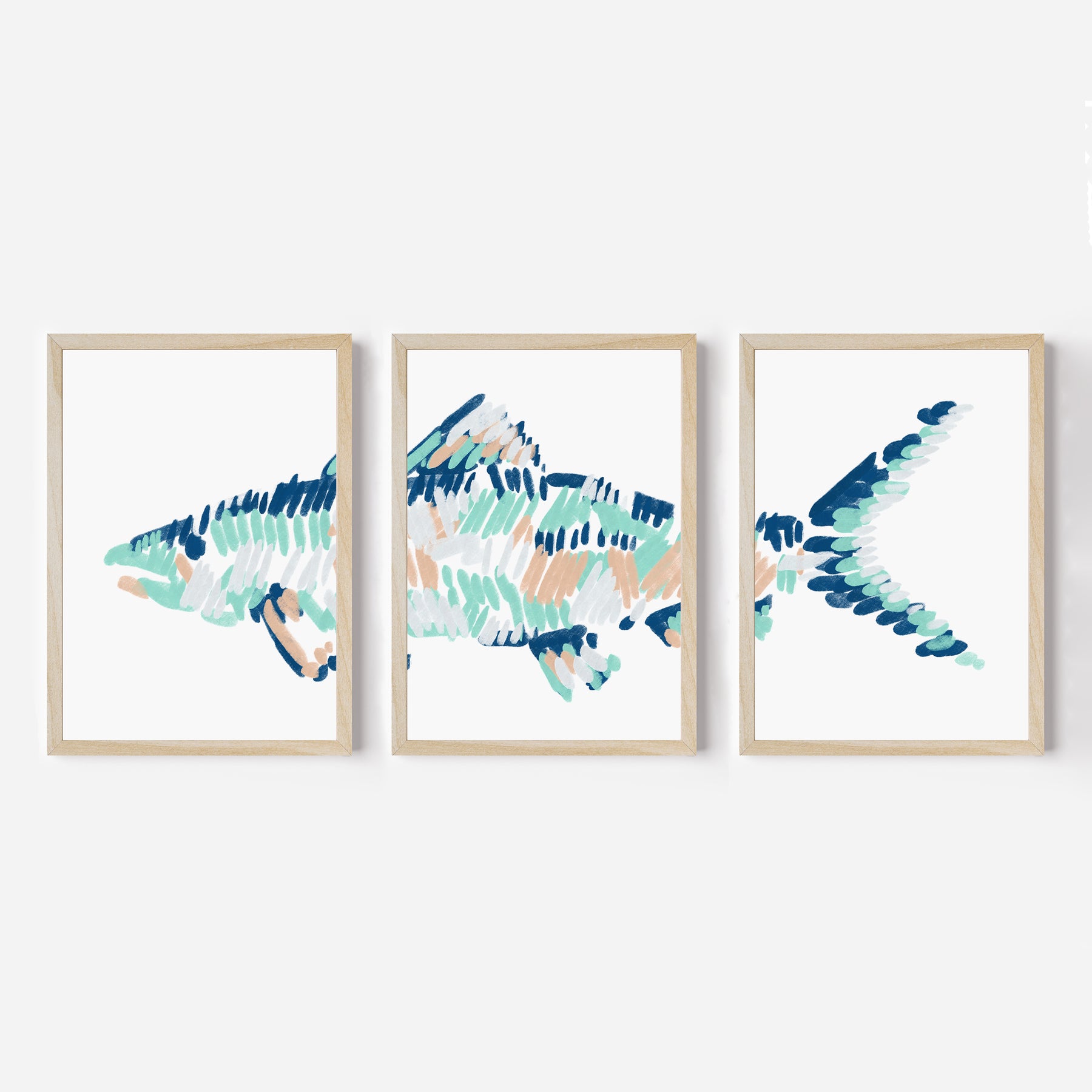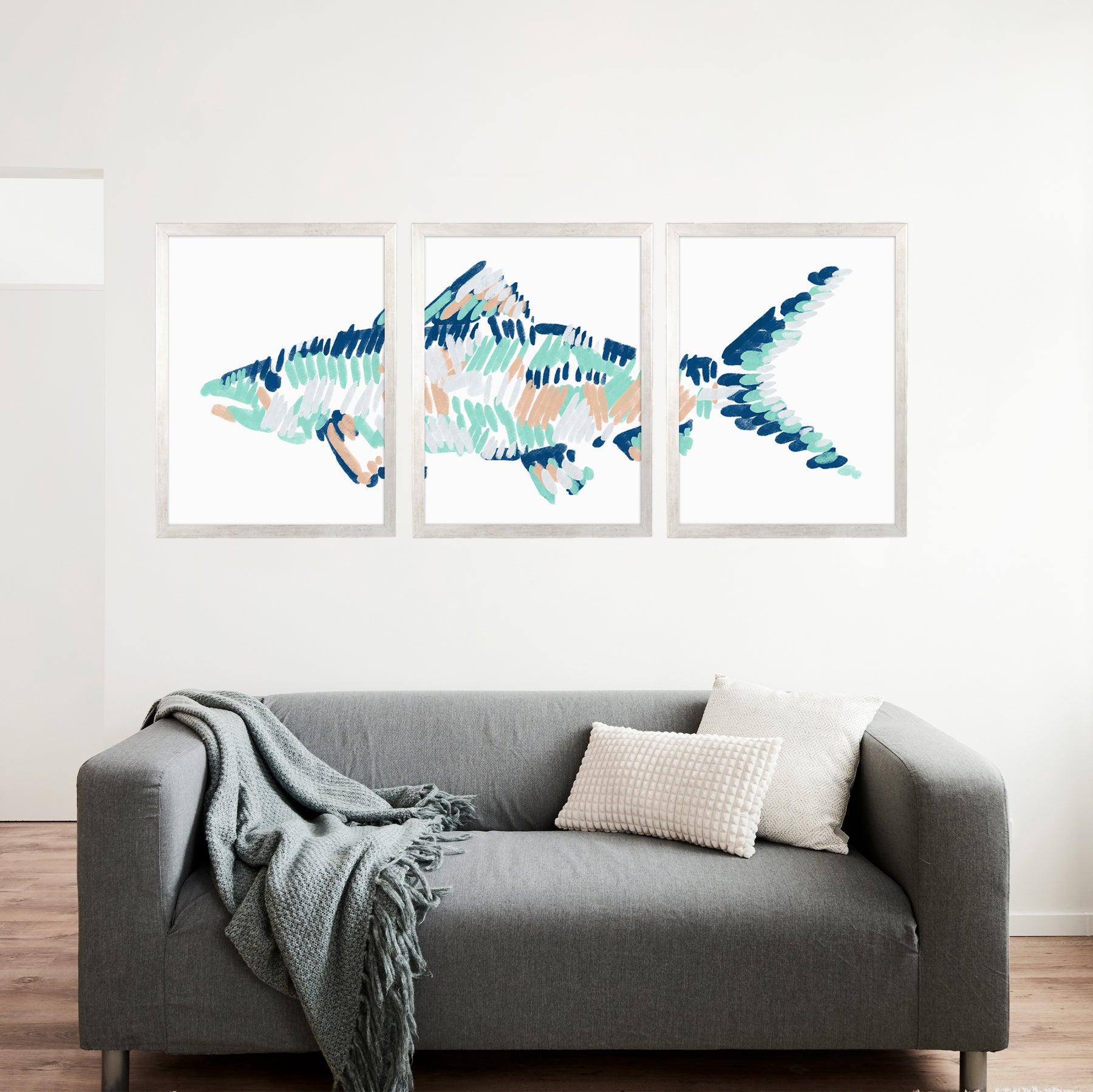 "The Bonefish Triptych" is a vertically oriented three-piece fish illustration set in tones of deep azure blue, mint, gray and light orange on a white background.