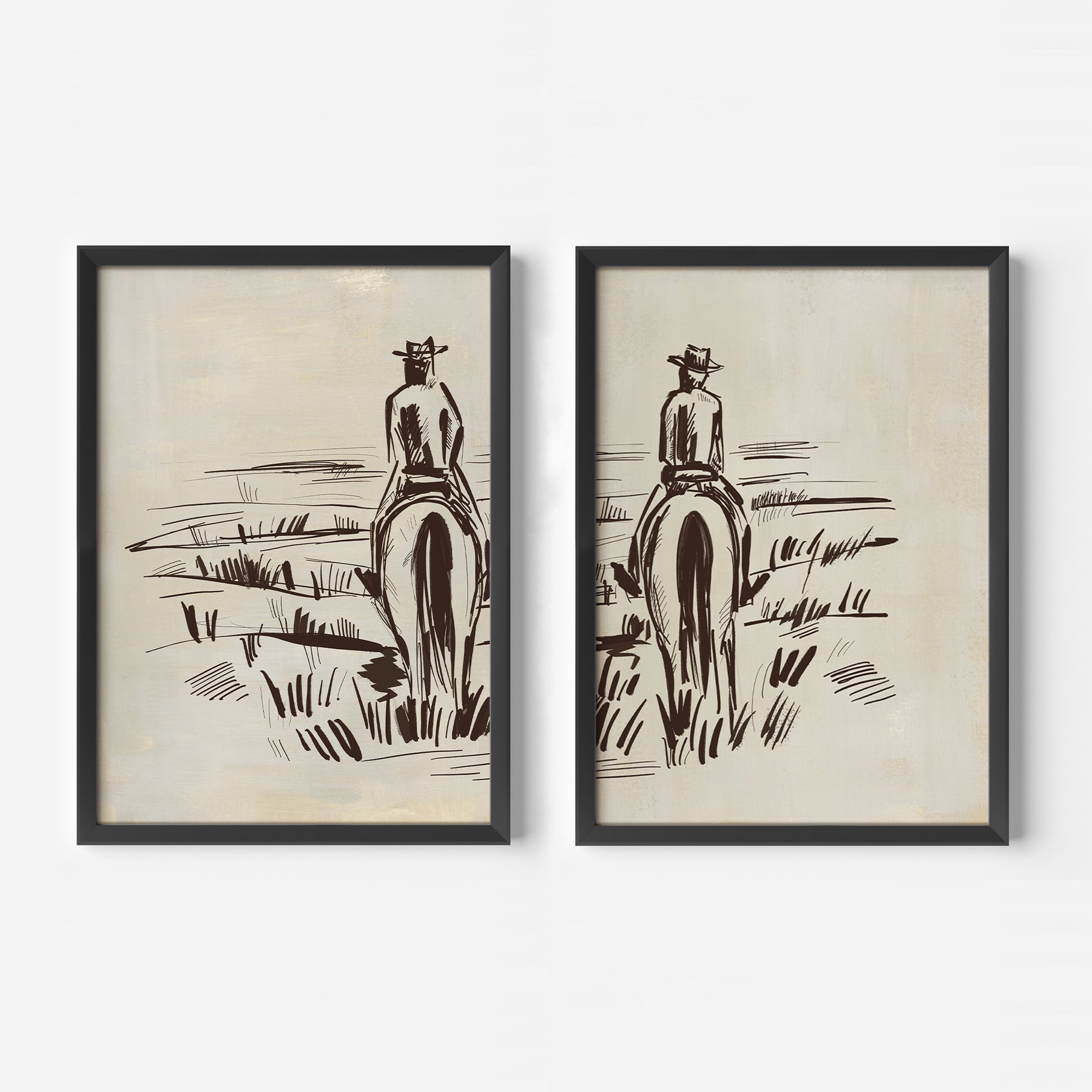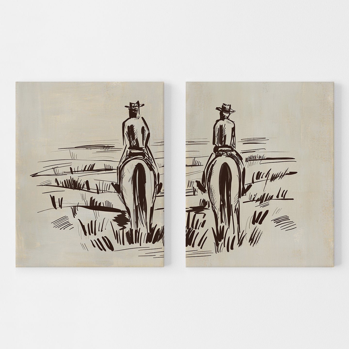 "The Cowboy Watch Diptych" is a vertically oriented two-piece western landscape illustration set in dark brown on a textured/painted neutral beige background.