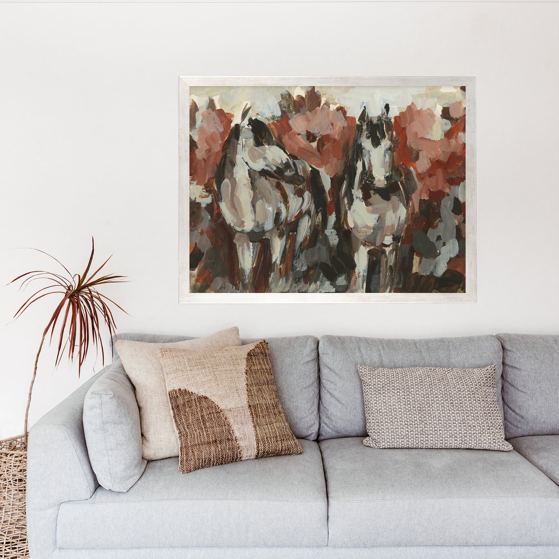 "The Mustangs" is a horizontally oriented horse painting in tones of burnt sienna, rich brown, taupe, ivory and muted umber.