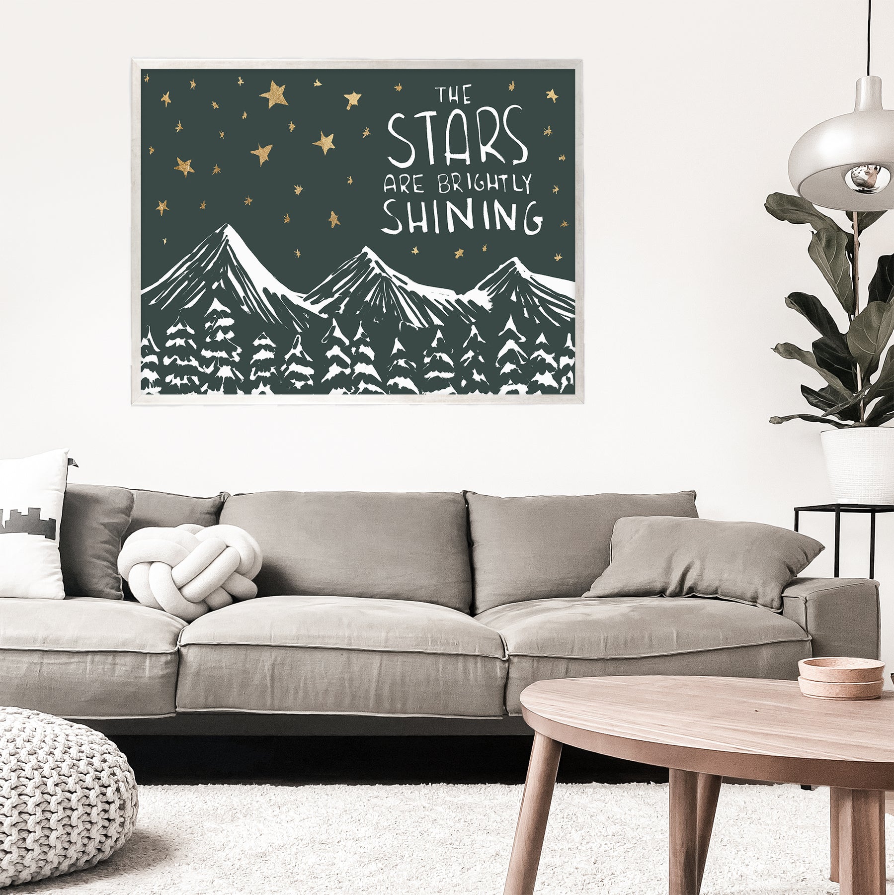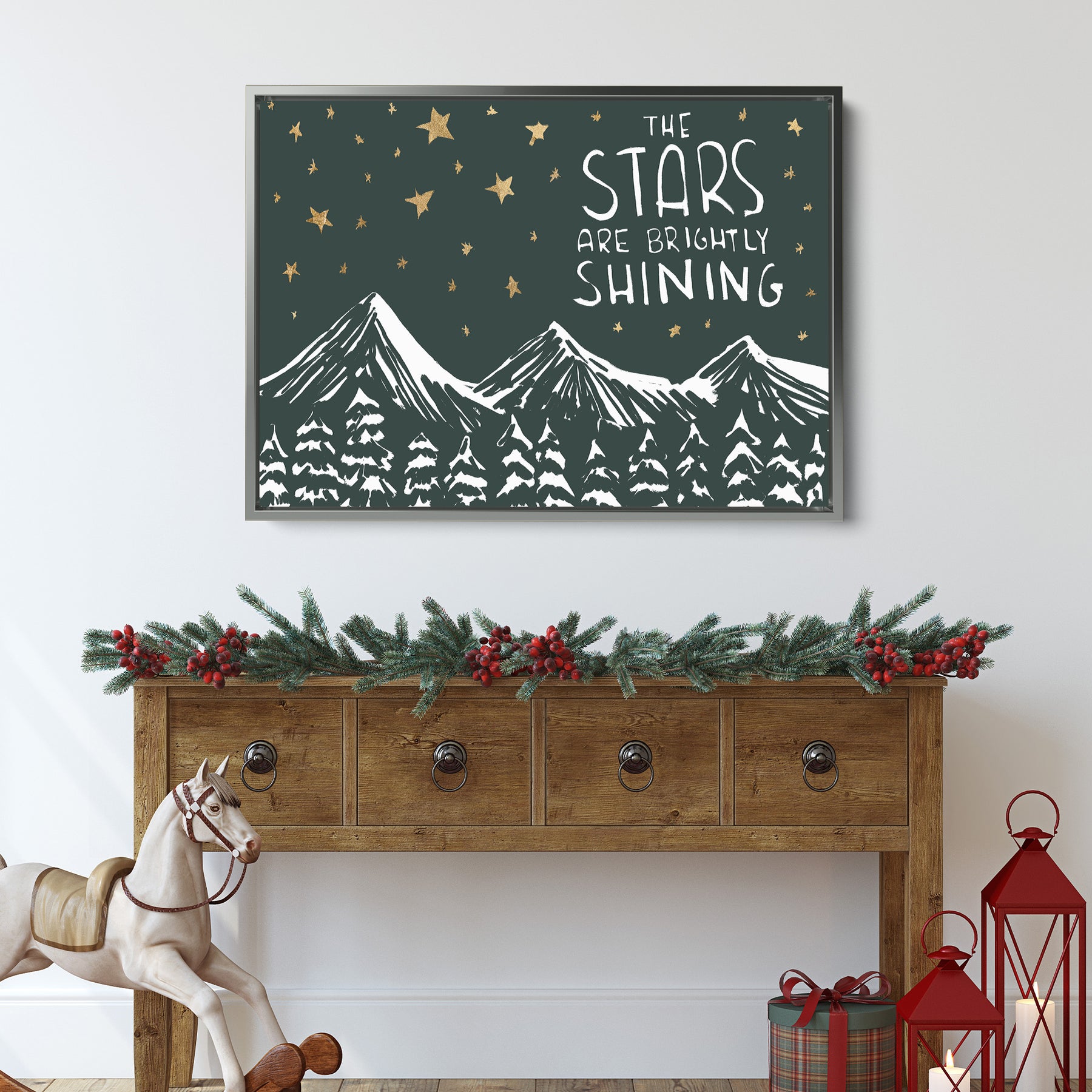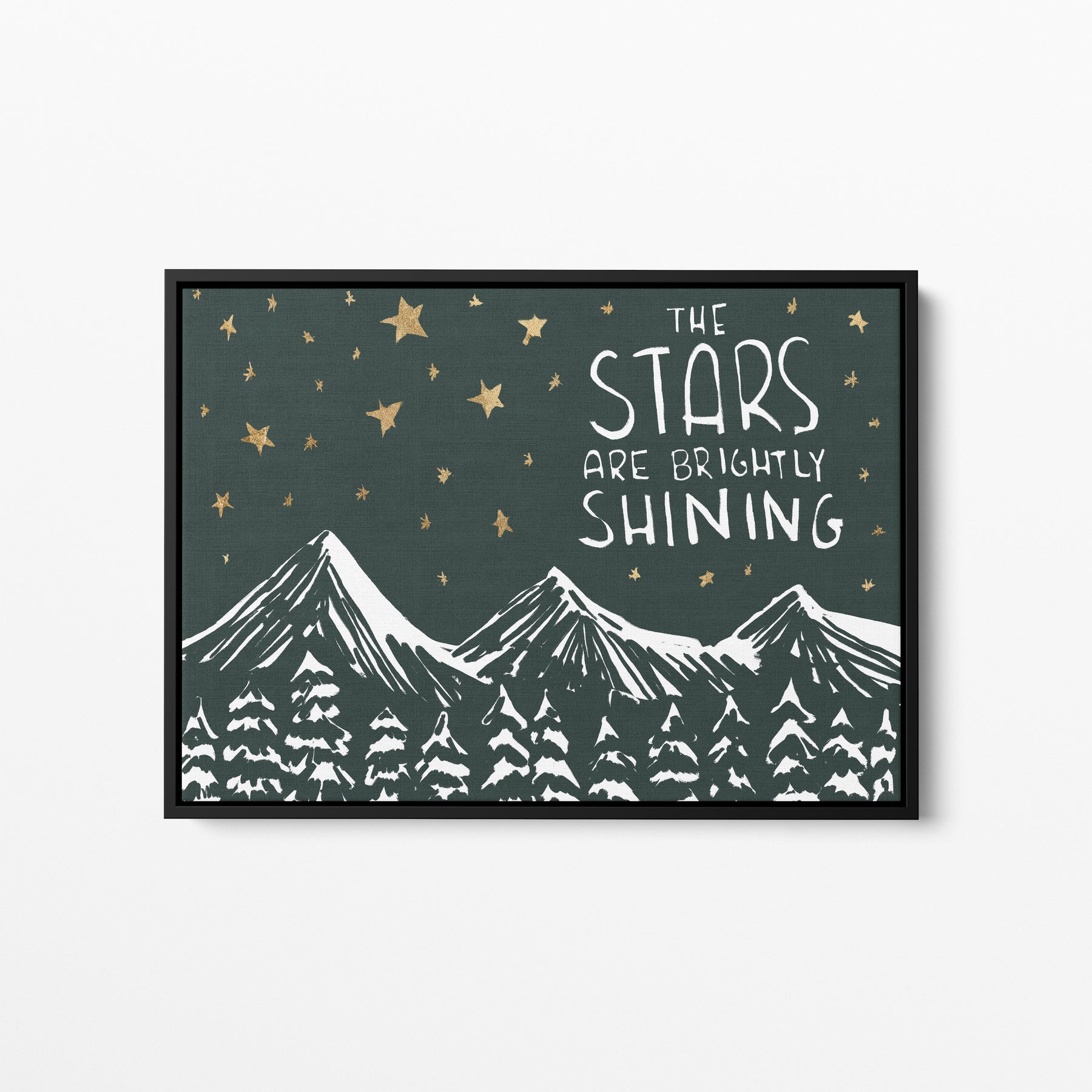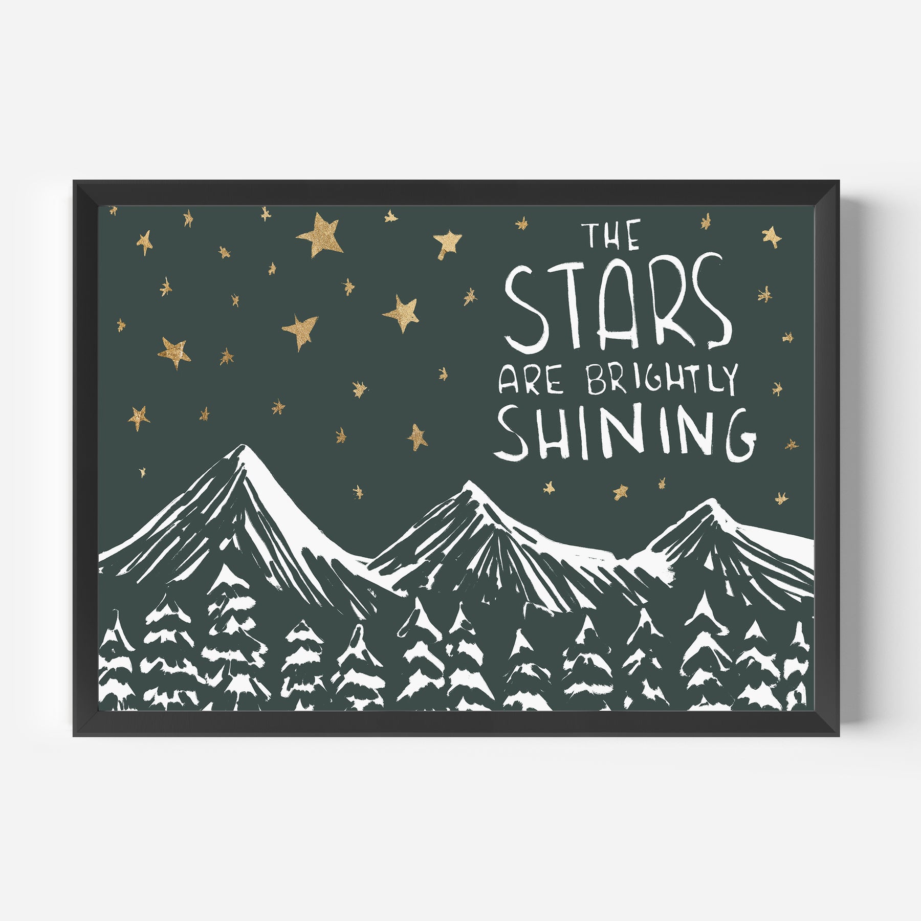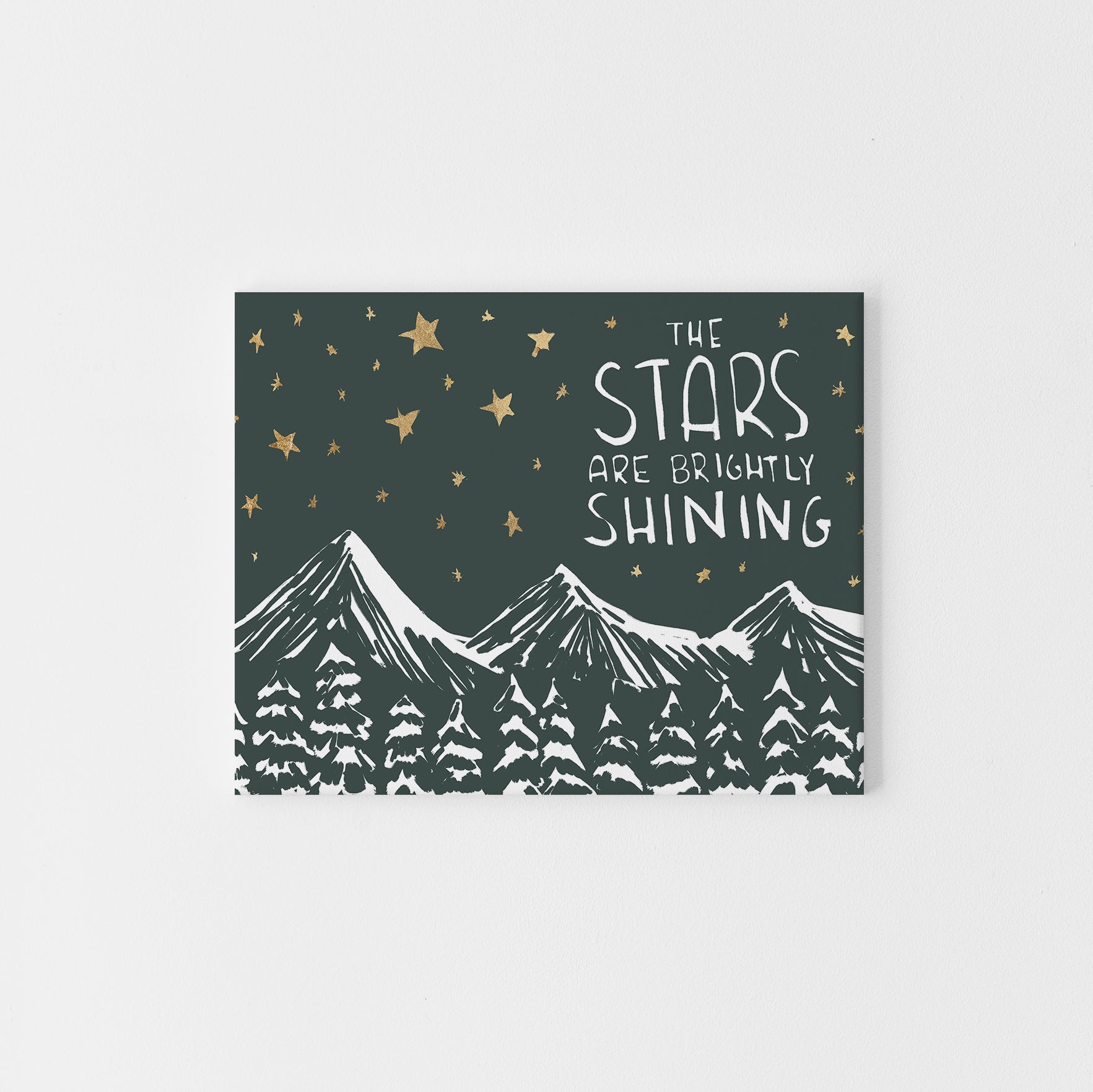 "The Stars Are Brightly Shining" is a landscape/horizontally oriented Christmas woodland scene illustration in tones of deep green, white and faux gold detailing. Please note that the gold effect is a printed texture and not metallic foil or gold leaf.