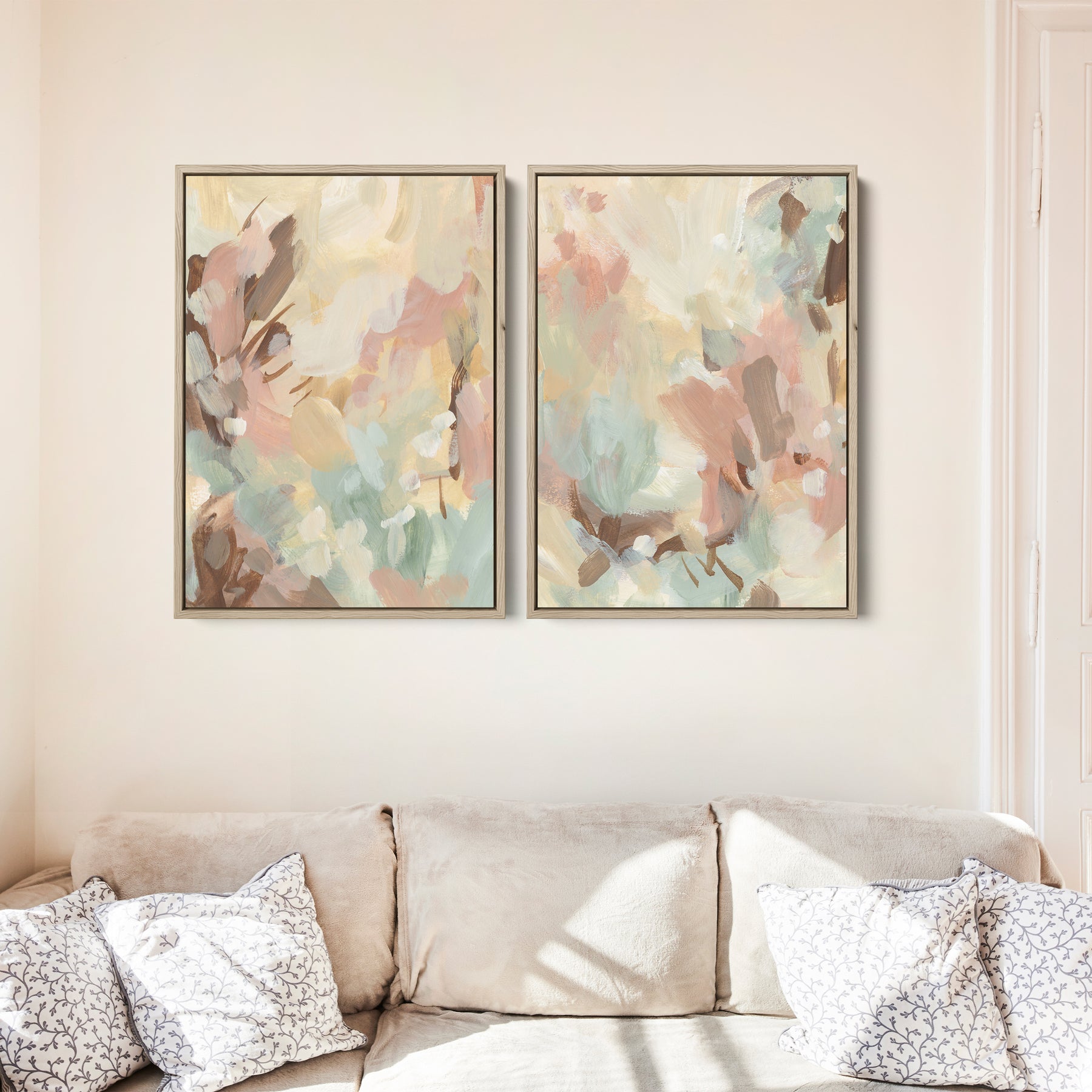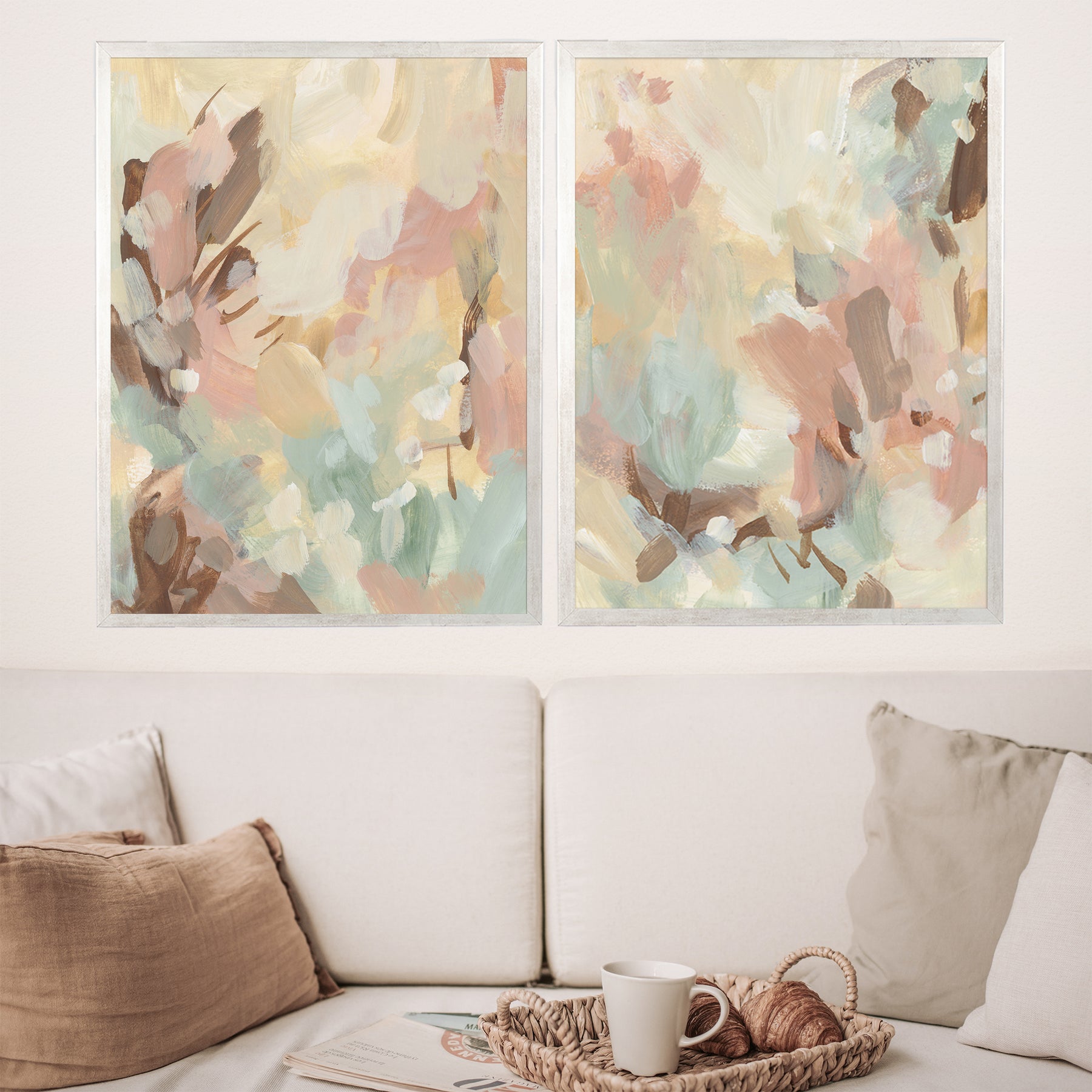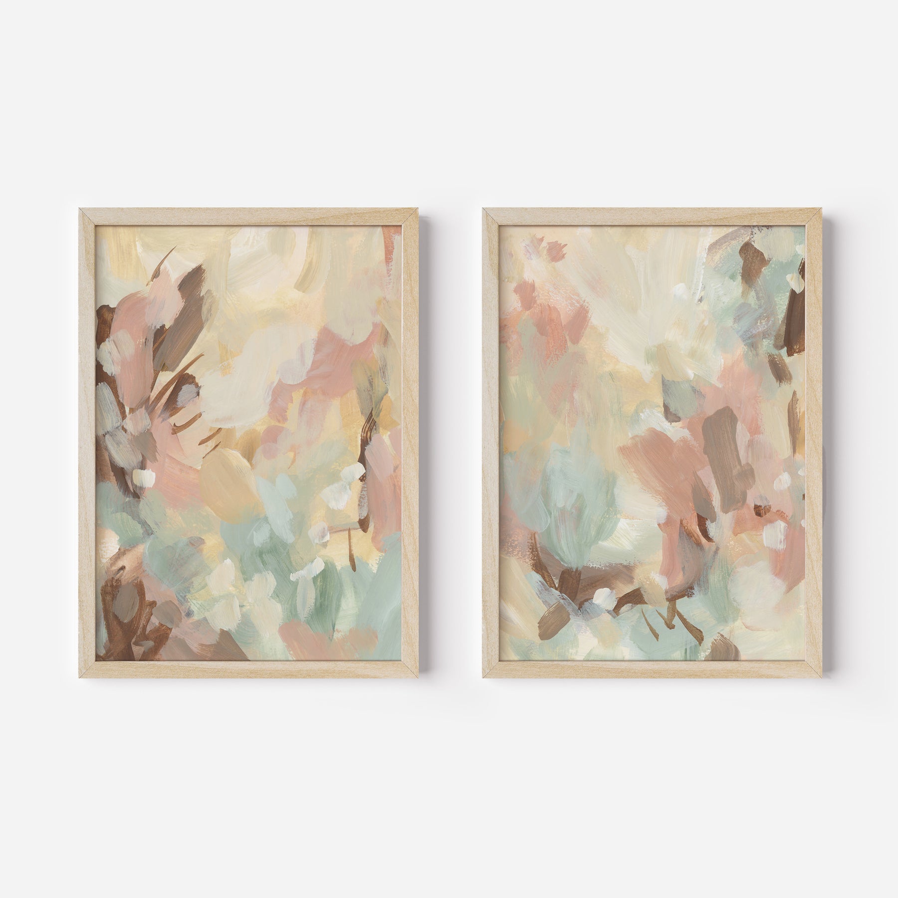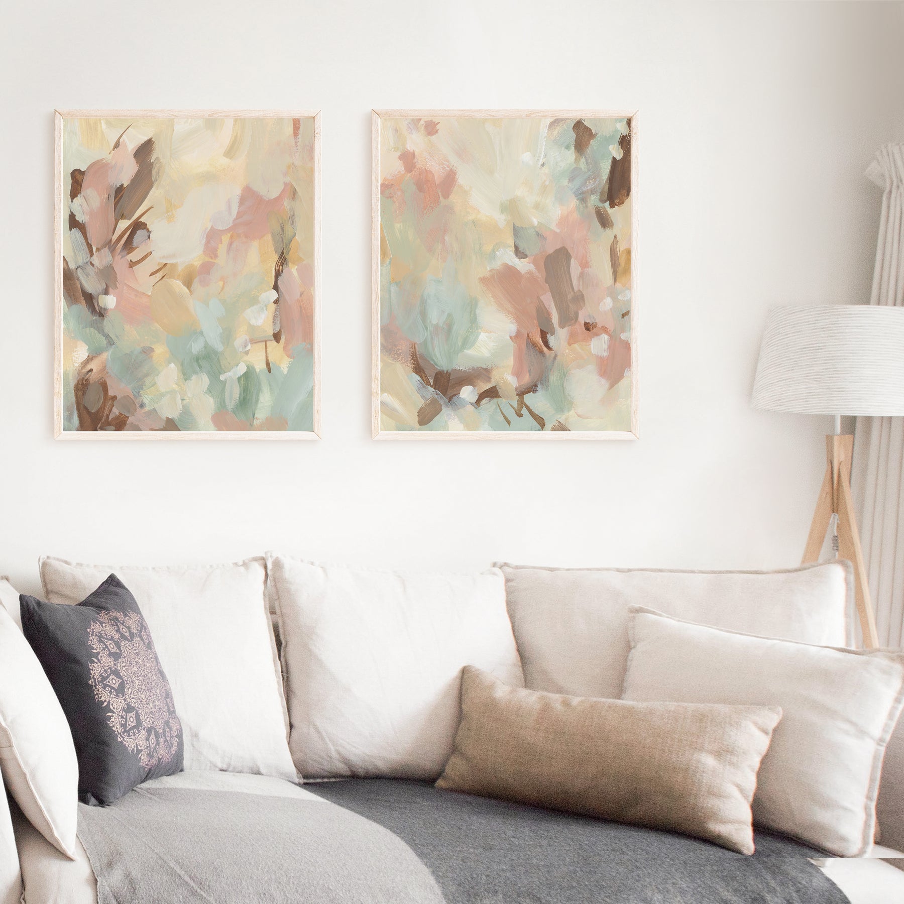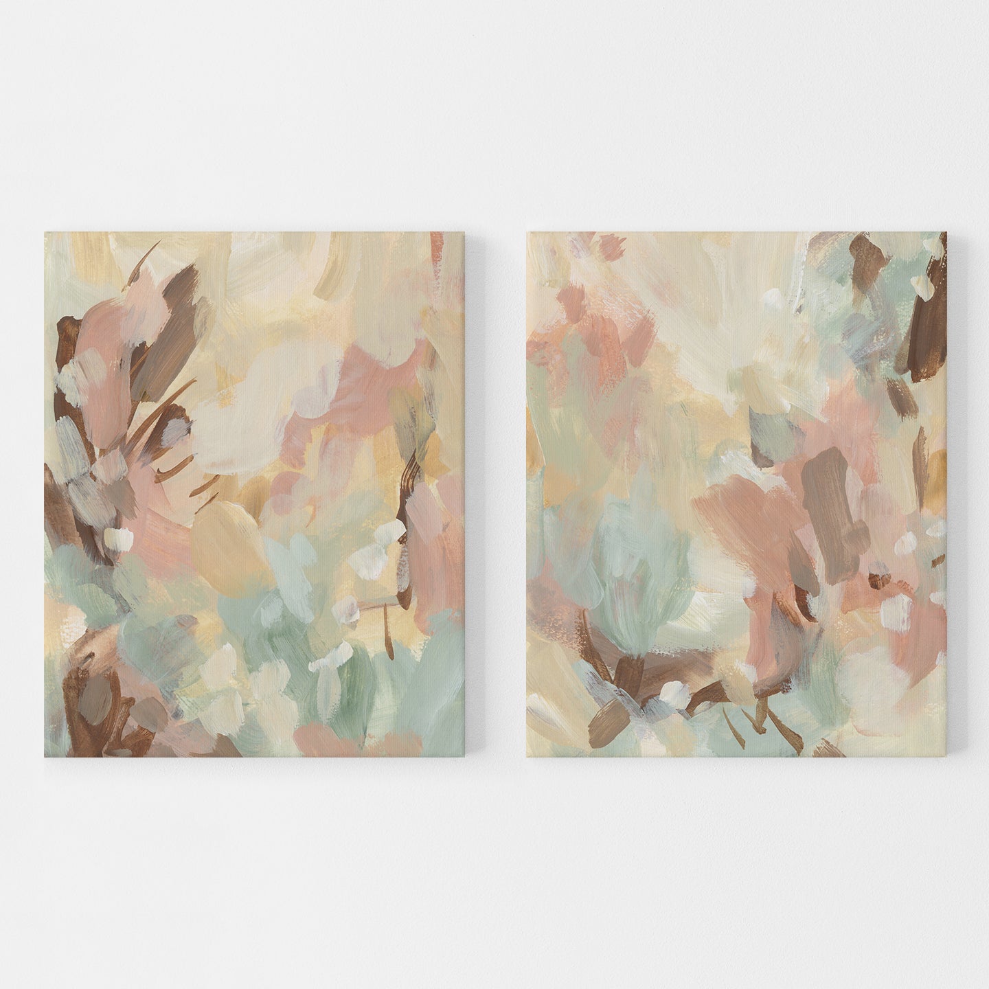 "Where the Wind Runs Diptych" is a vertically oriented two-piece abstract painting set in tones of golden tan, dusty blush, sage green, warm beige, dark brown and terracotta.
