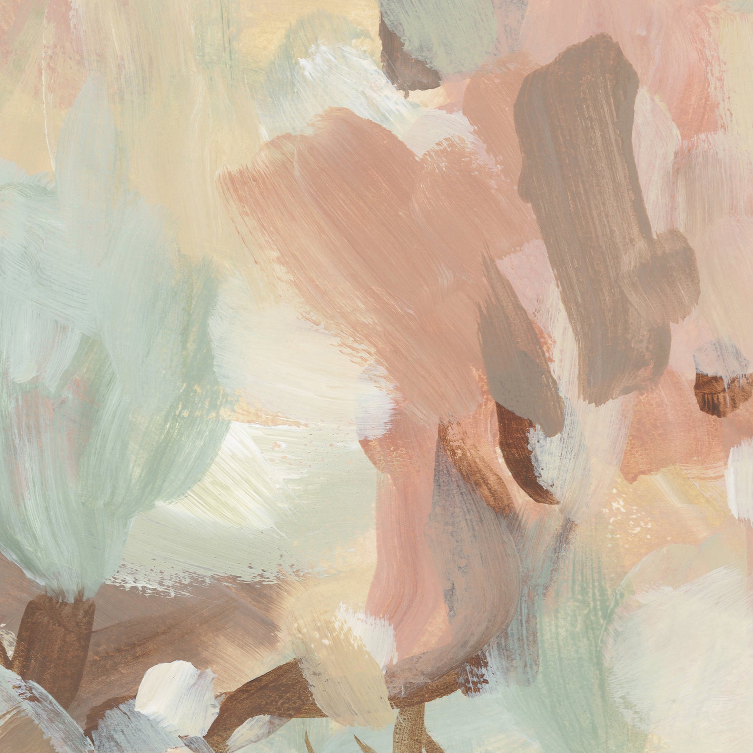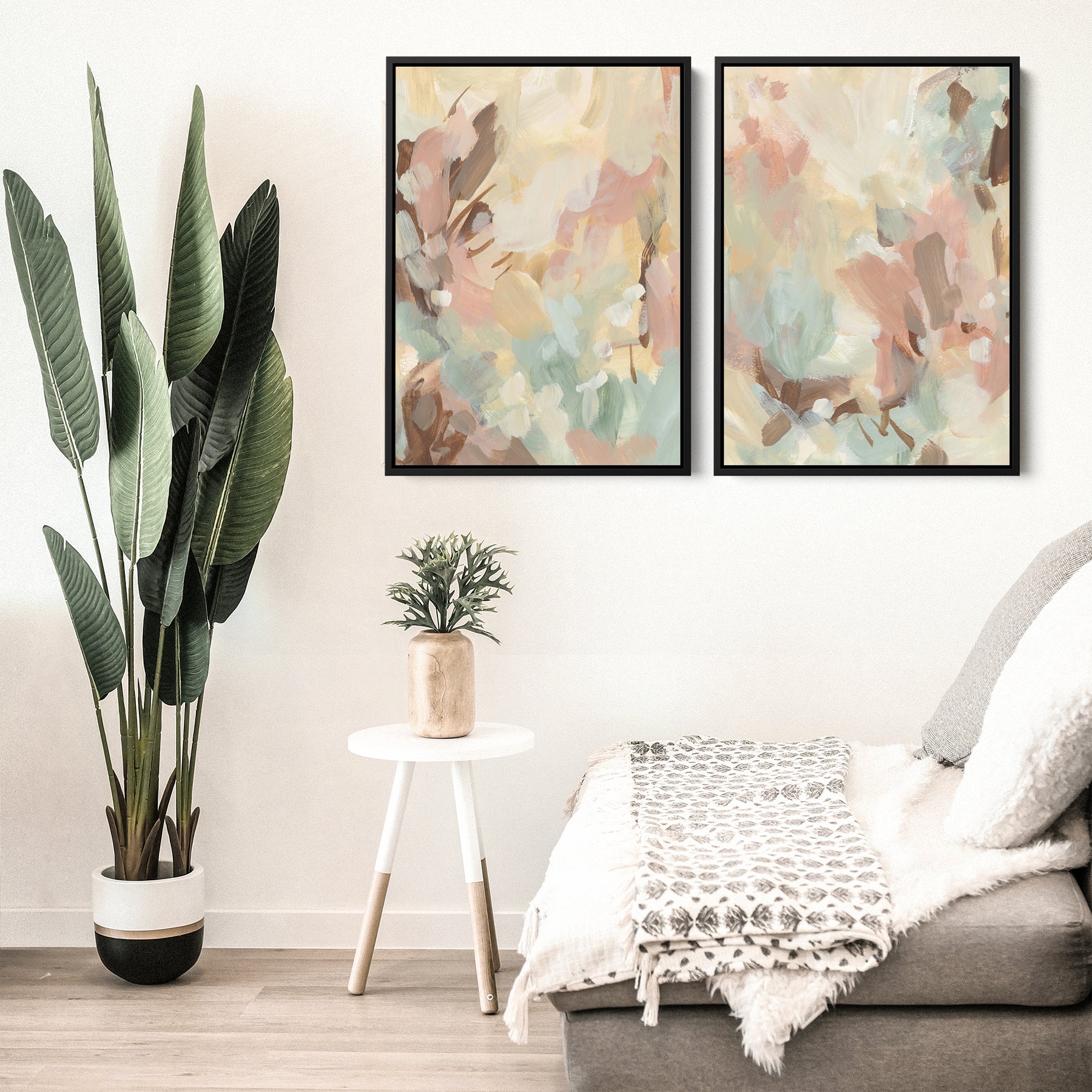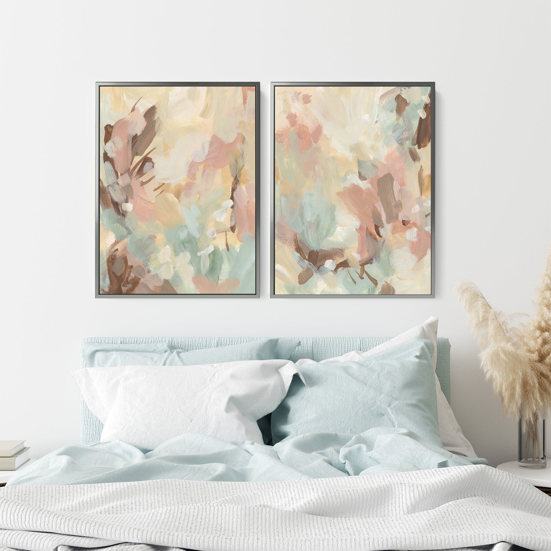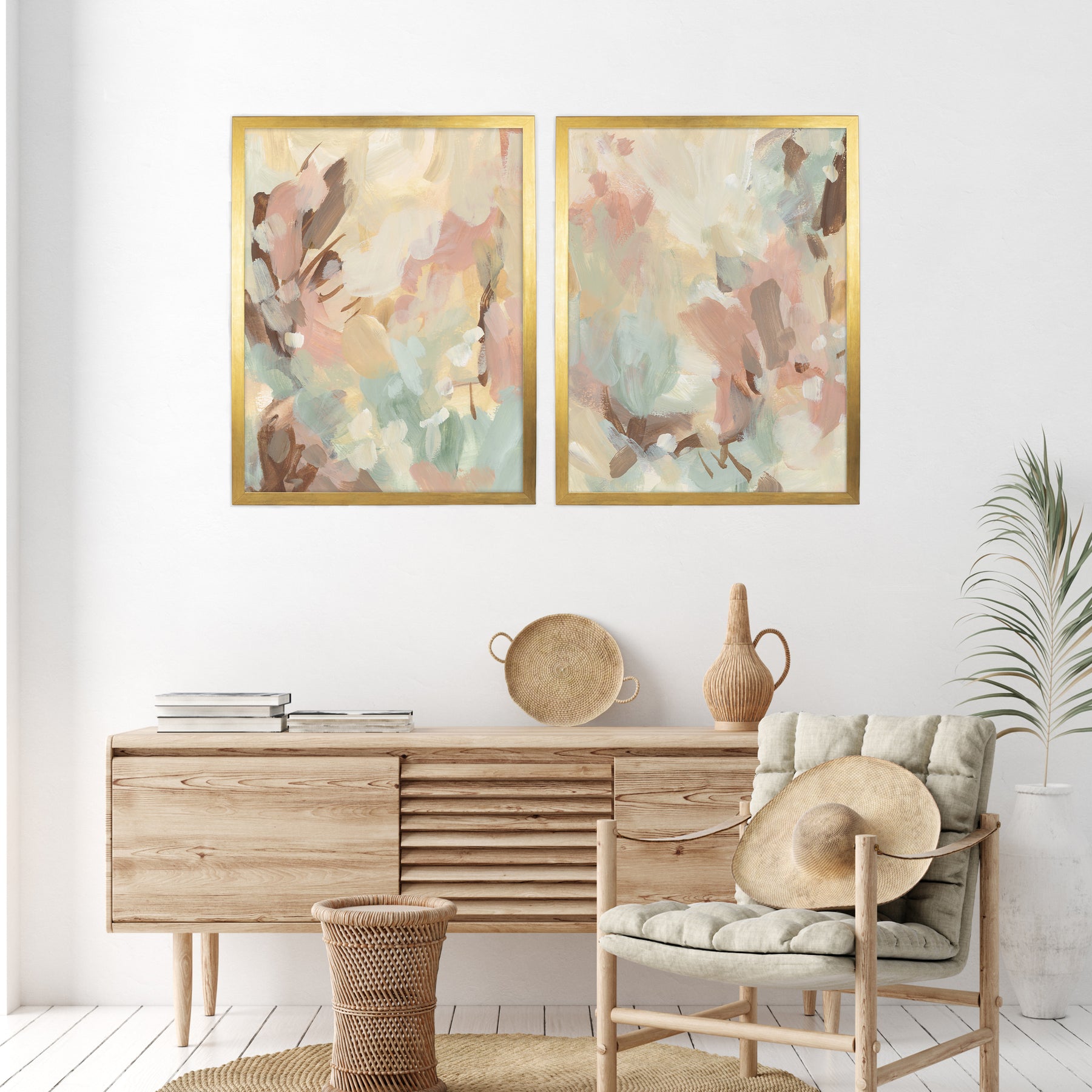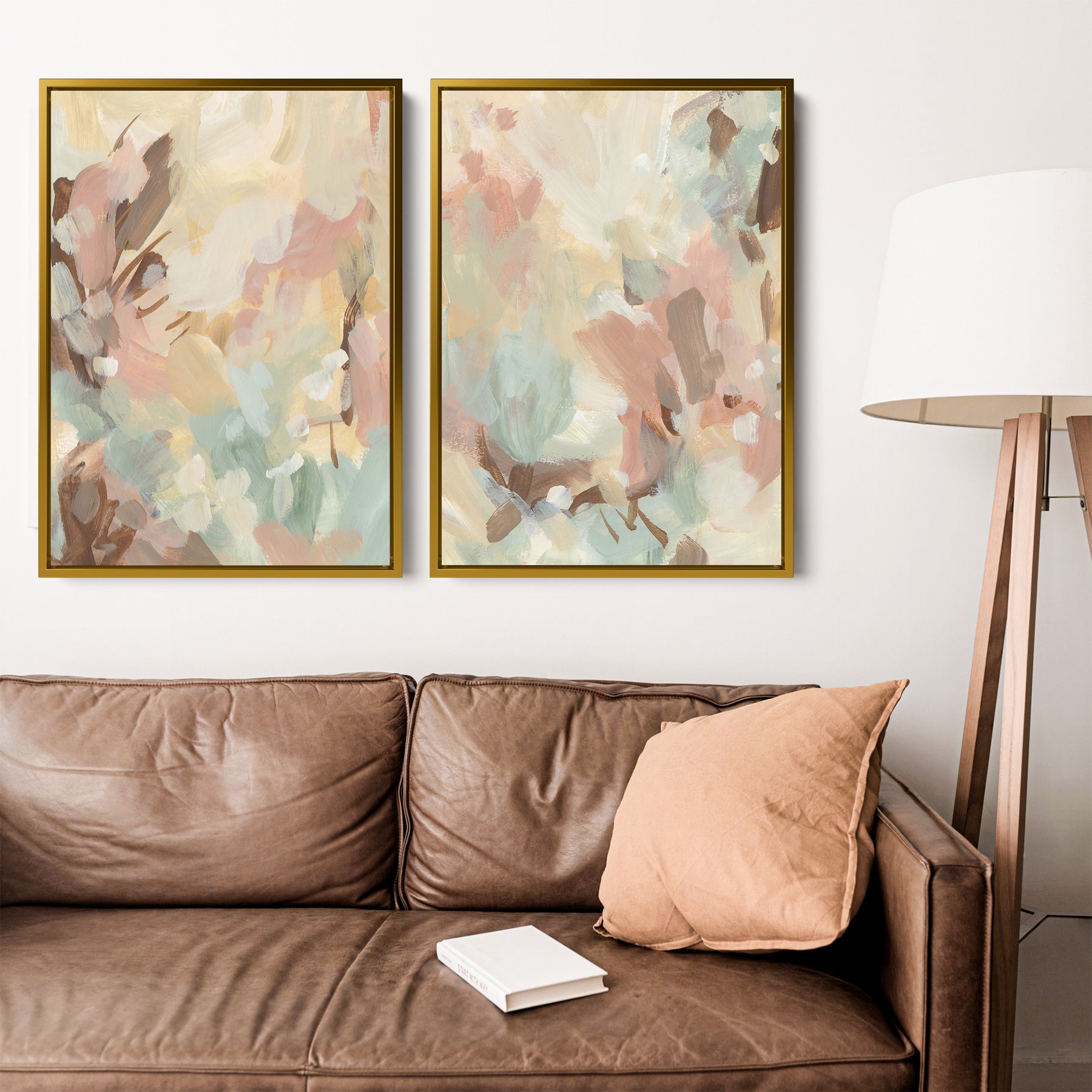 "Where the Wind Runs Diptych" is a vertically oriented two-piece abstract painting set in tones of golden tan, dusty blush, sage green, warm beige, dark brown and terracotta.