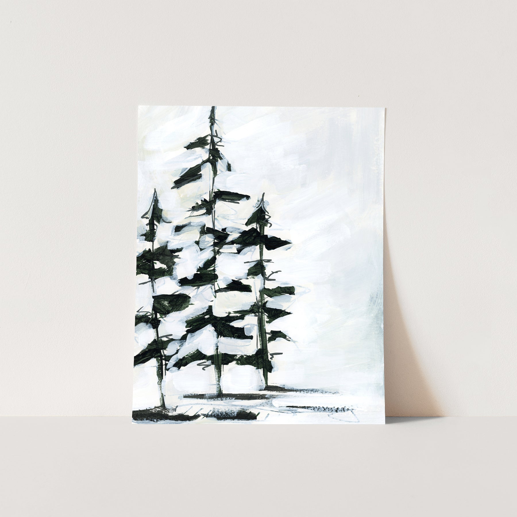 Take an adventure deep into the mountains and forests of Washington State with our series, Mountain Mist. This collection showcases a variety of artwork, including minimalist line drawings, lush abstract paintings and contemporary flora studies. "Whiteout Pines" is a dark green pine tree painting set on a white and gray background with hints of beige.
