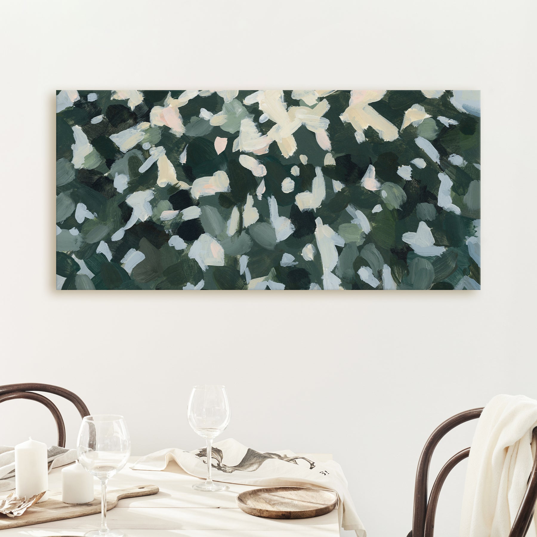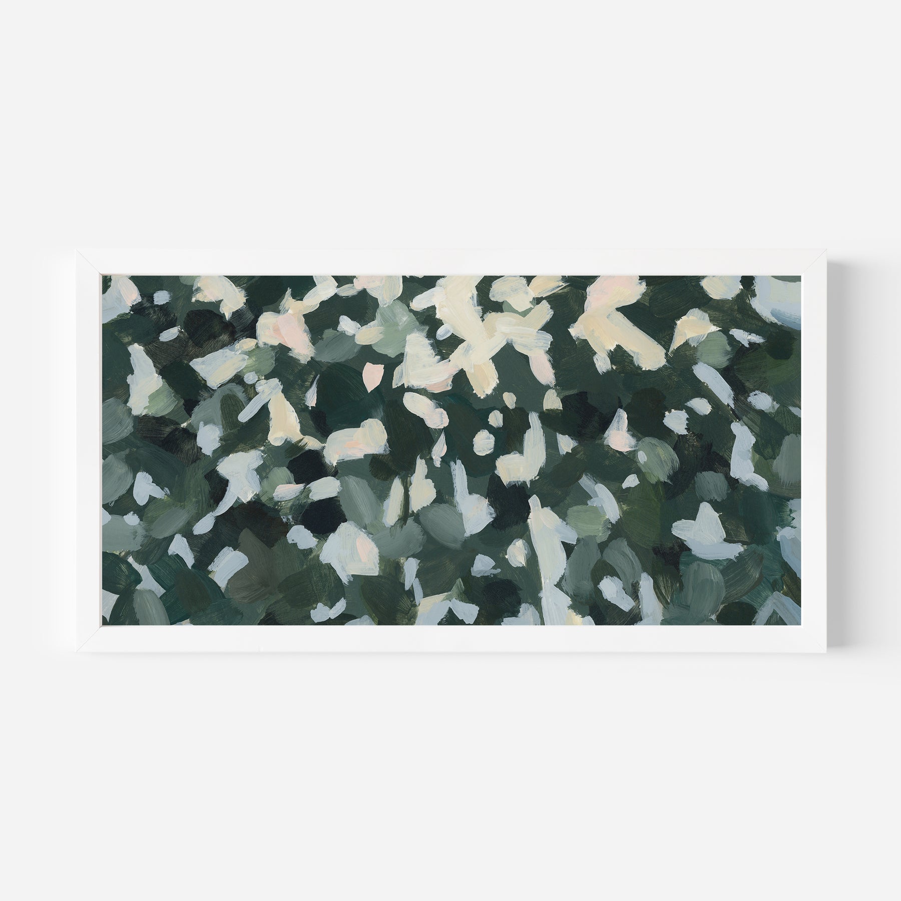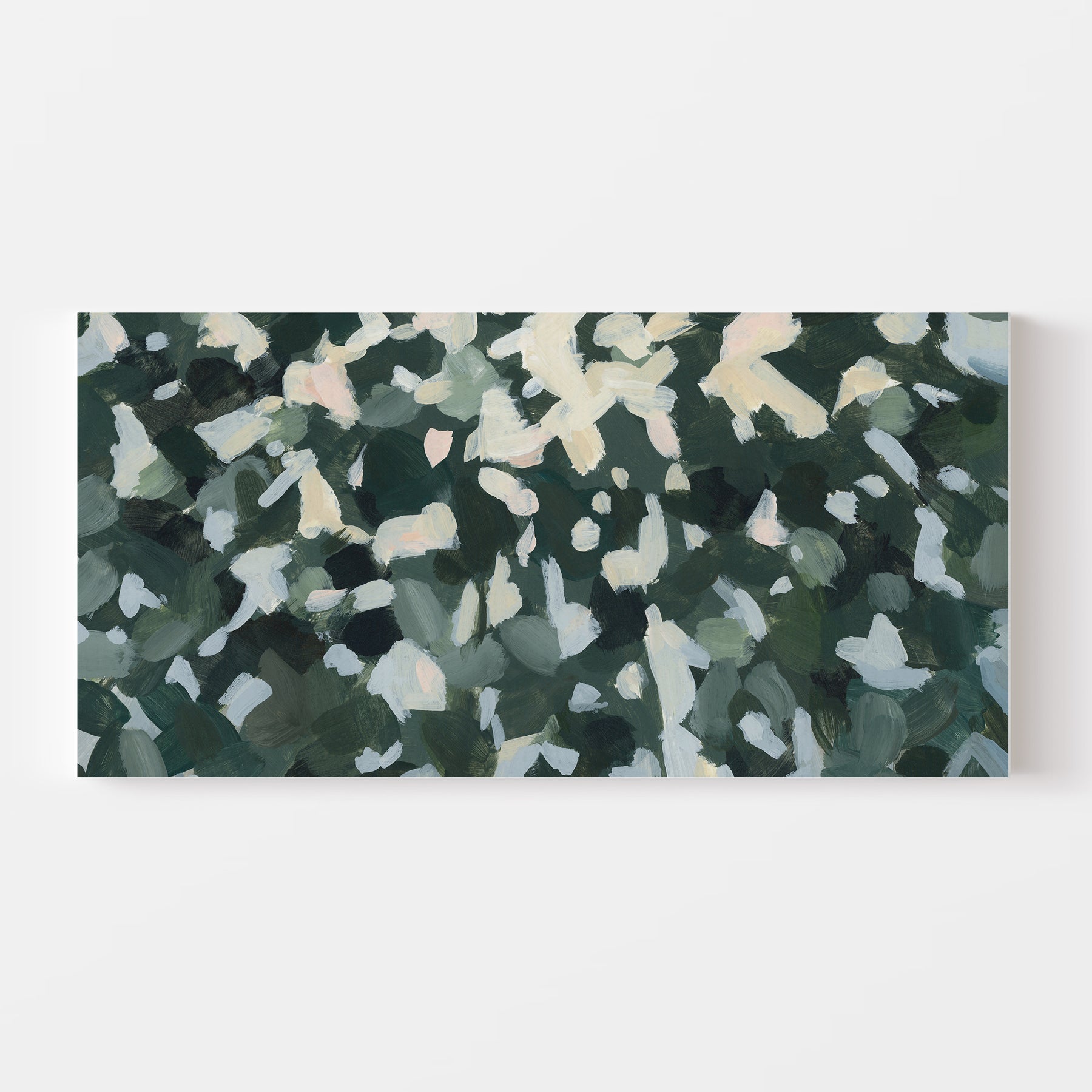 "Wild Canopy" is a horizontal panoramic forest landscape painting in tones of softened green, muted yellow, white, slate blue, peach, warm bone/beige and dark hunter green.
