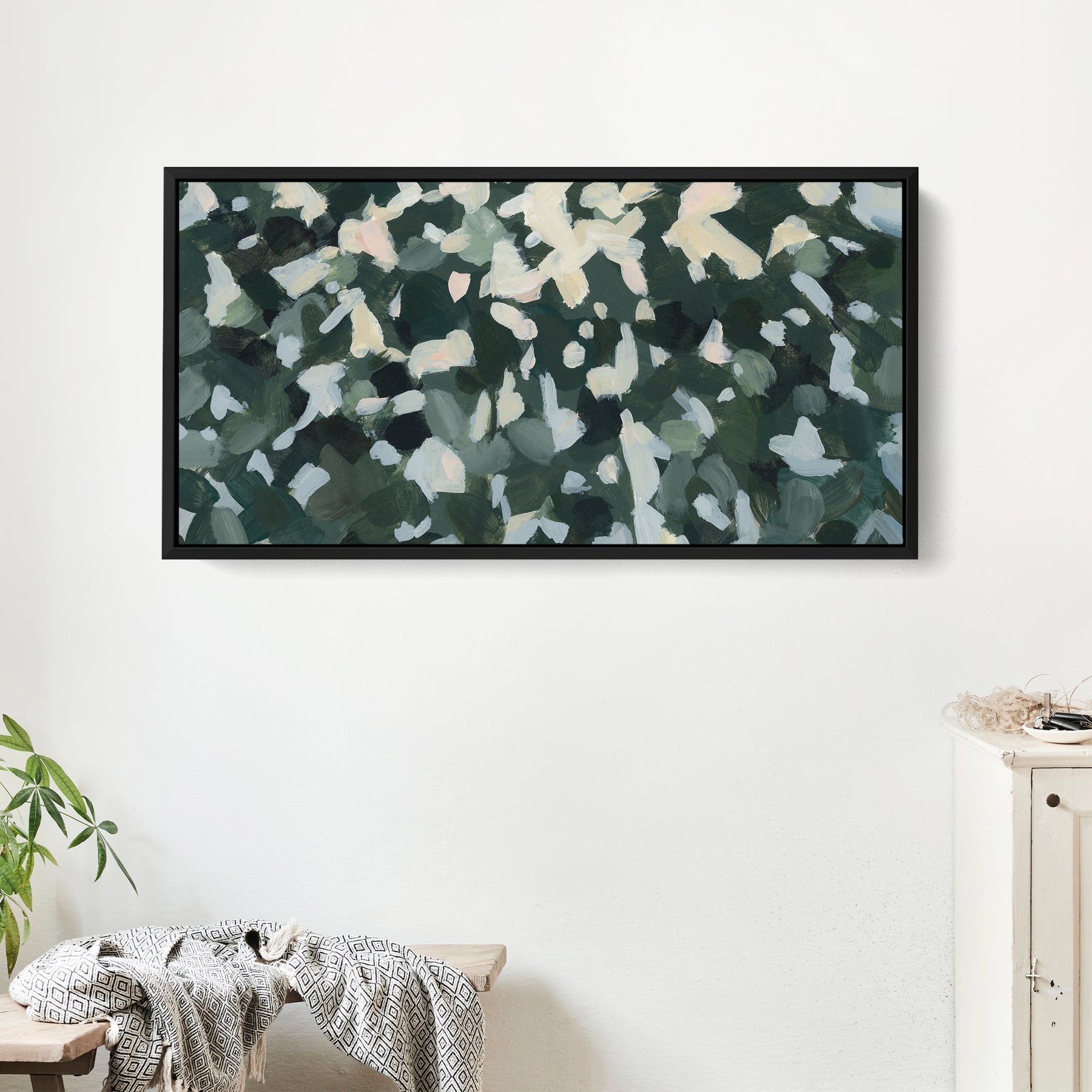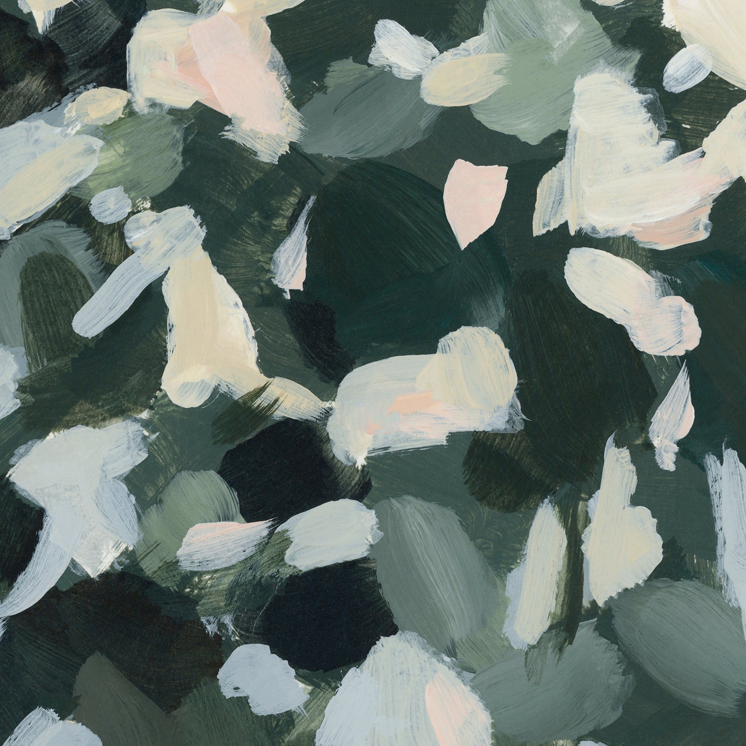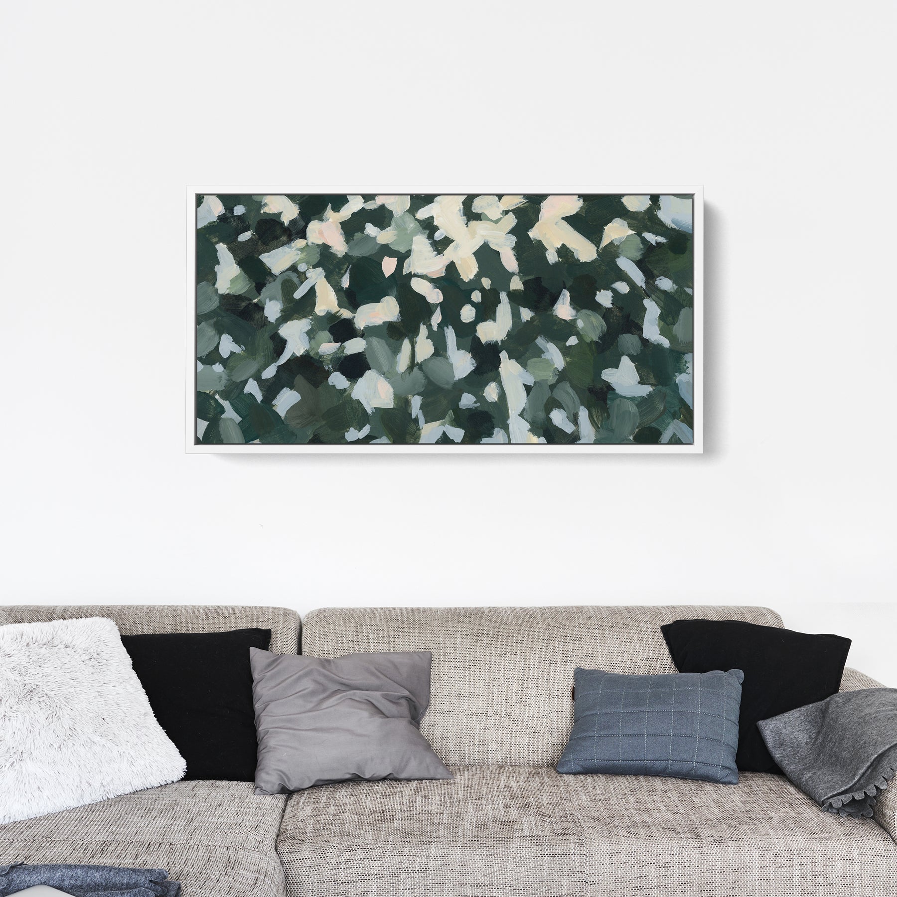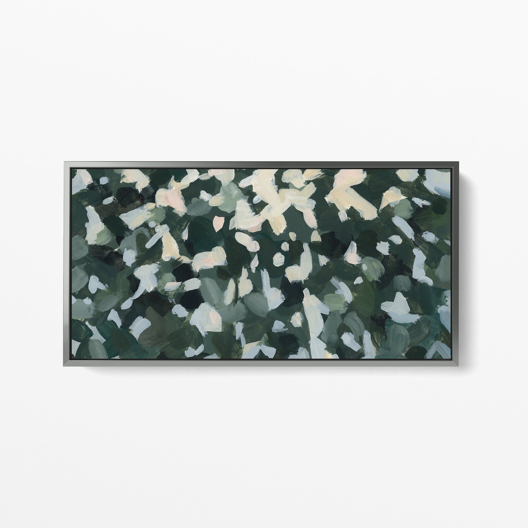 "Wild Canopy" is a horizontal panoramic forest landscape painting in tones of softened green, muted yellow, white, slate blue, peach, warm bone/beige and dark hunter green.