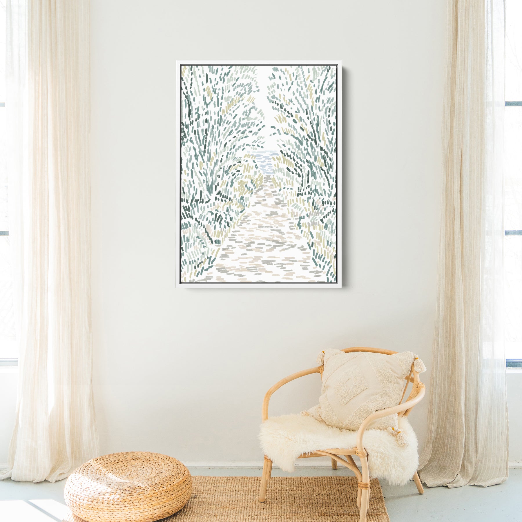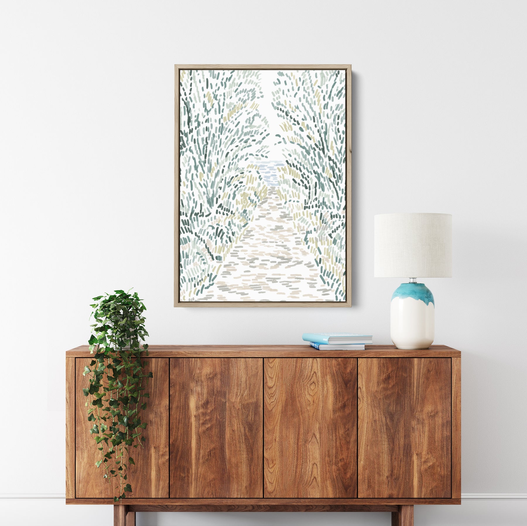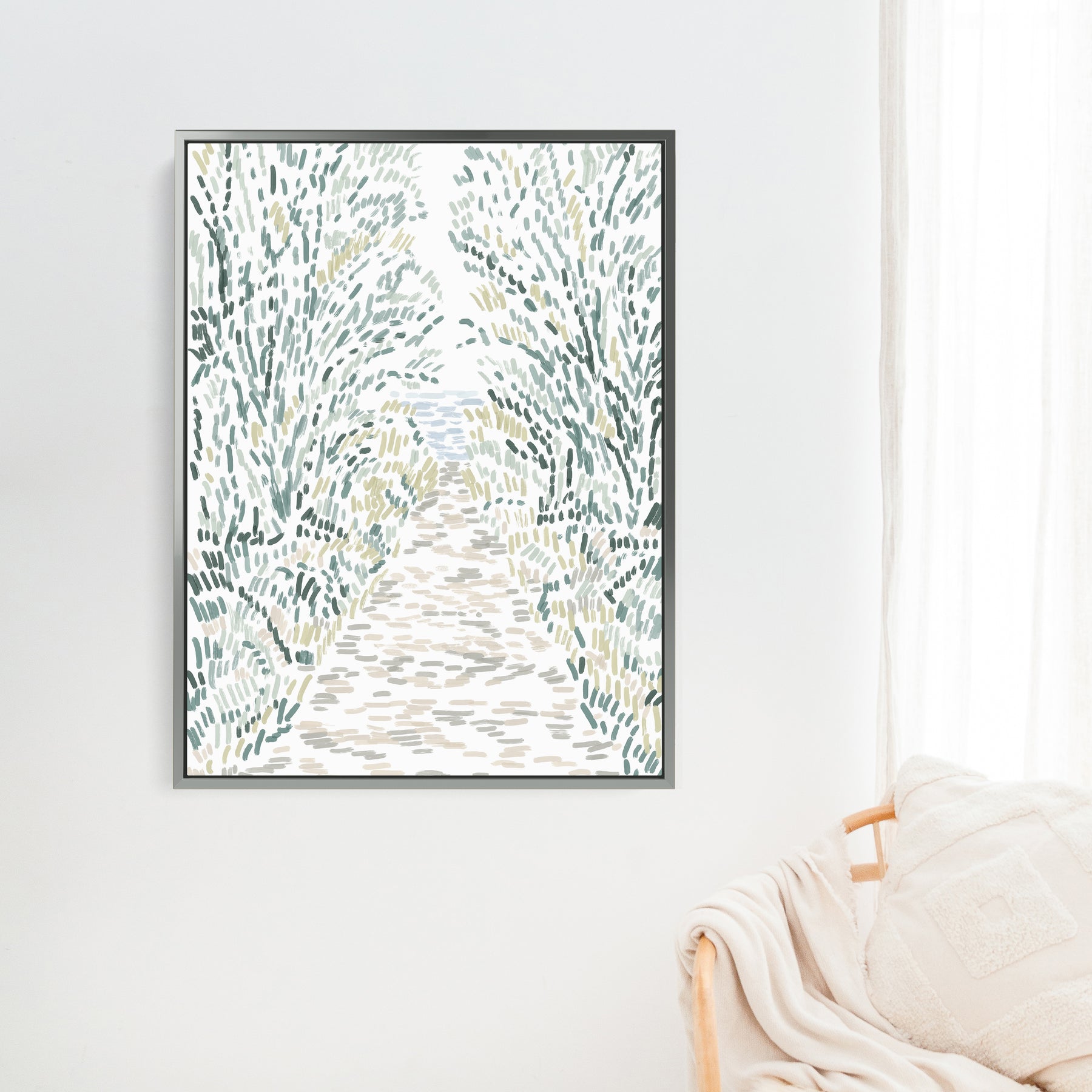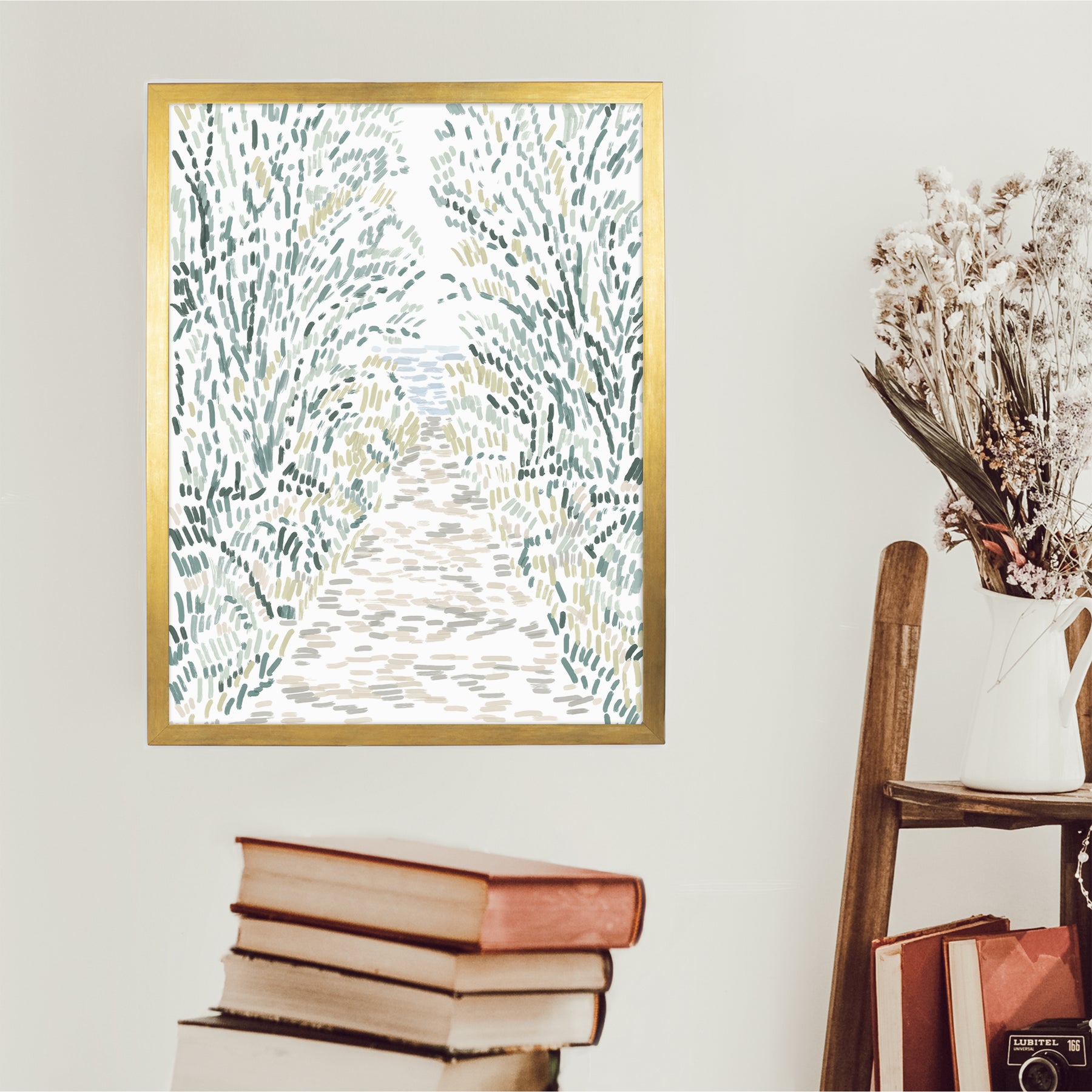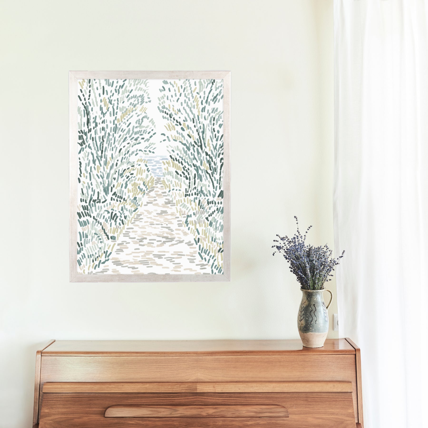 "Woodland Pathway" is a vertically oriented modern illustration in tones of green, ochre, beige and blue on a white background.