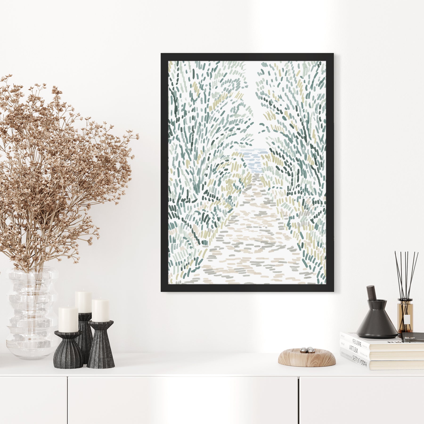 Frame moulding width is consistent across sizes; smaller pieces may appear slightly more substantial proportionally. For additional information on our framing options, please see our framing info page